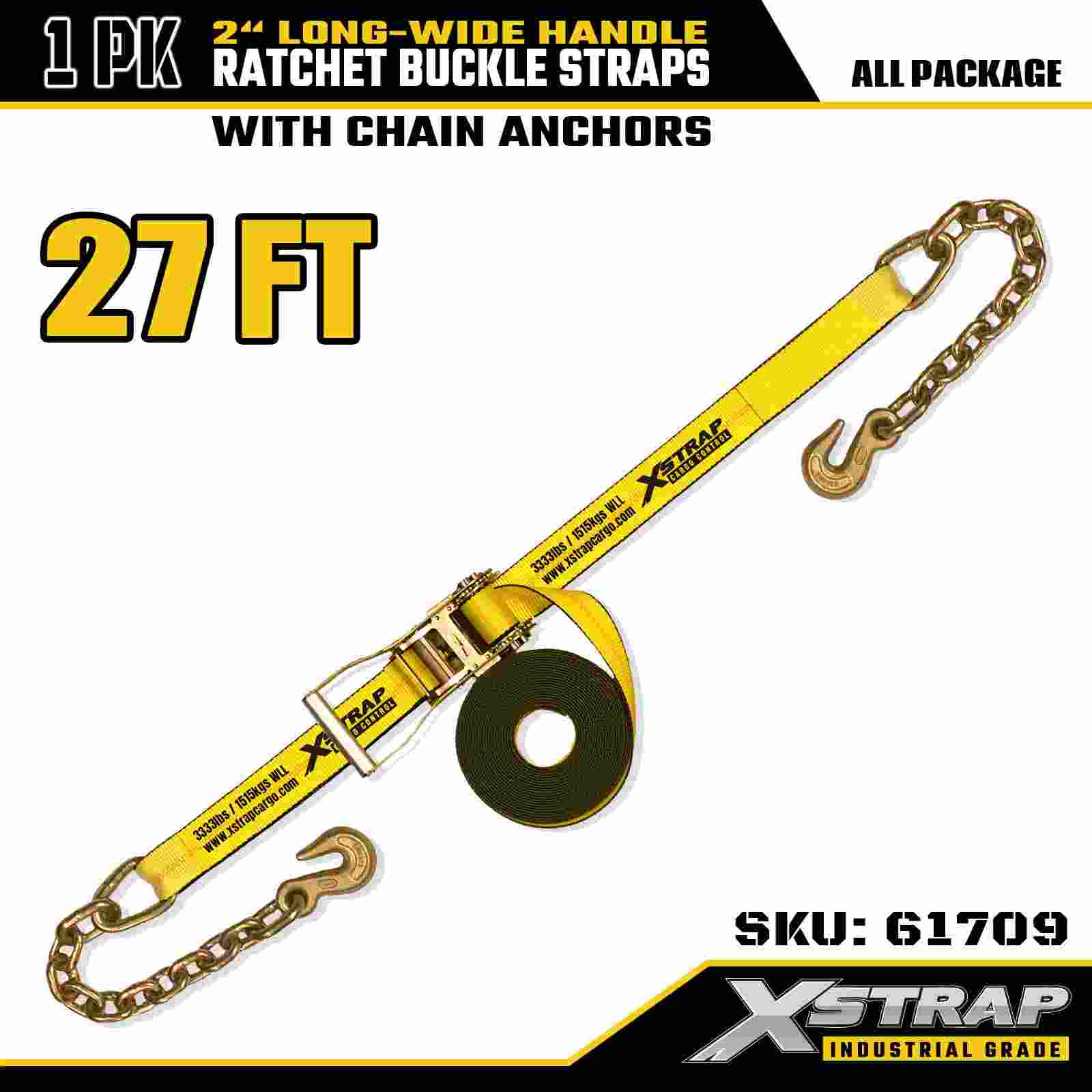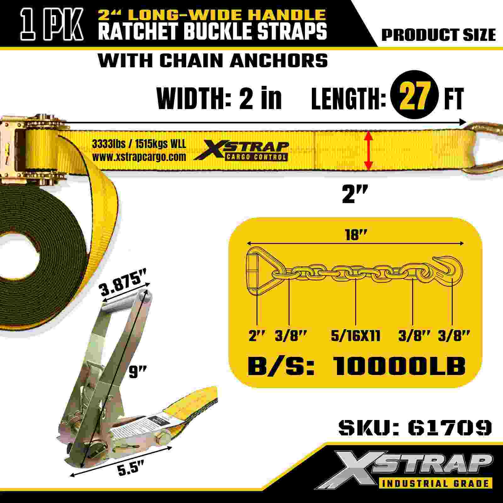 Xstrap 61709 Strapaí búcla Raitchet Láimhseála Fada Leathan 2" x 27 troigh (1-Phaca) le Hooks Slabhra, 10,000 lbs Neart Briseadh, Strap Ceangail Síos Dleachta Trom le haghaidh Iompar Slán