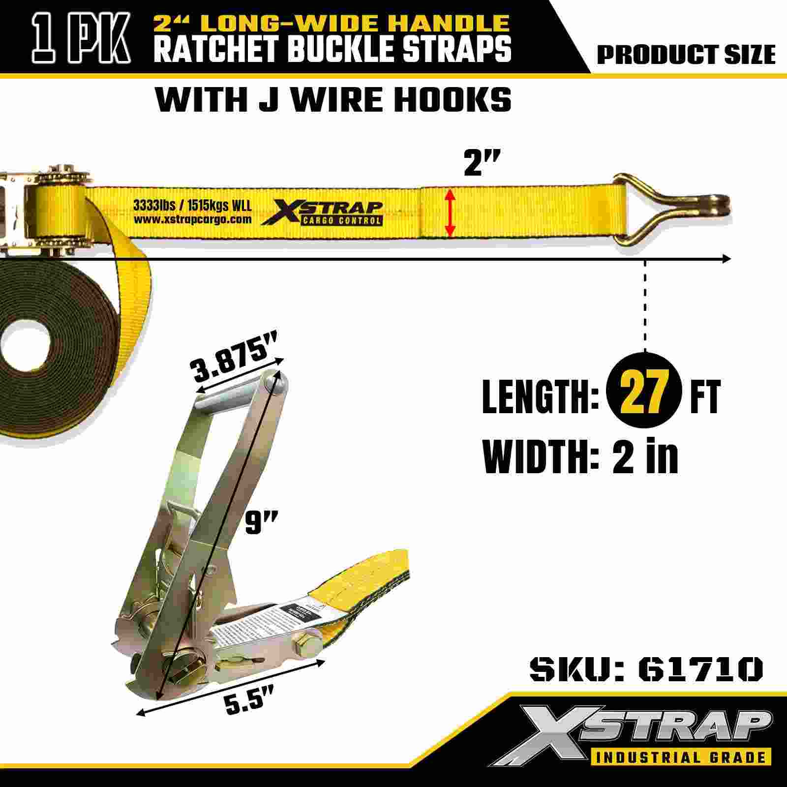 Xstrap 61710 Ceangal Ratchet Préimh Síos 2" x 27 troigh (1-Pacáiste) 10000 LBS Neart Briseadh Strapaí Cargo Dúbailte J Hook Foirfe le haghaidh Fearais Bogtha, Trealamh Lawn agus Gluaisrothair