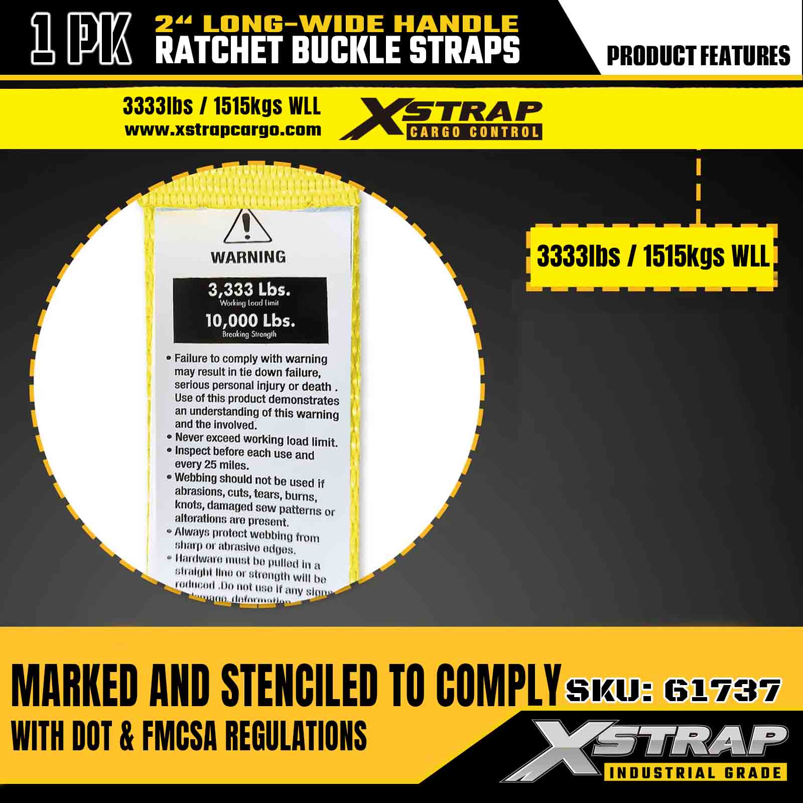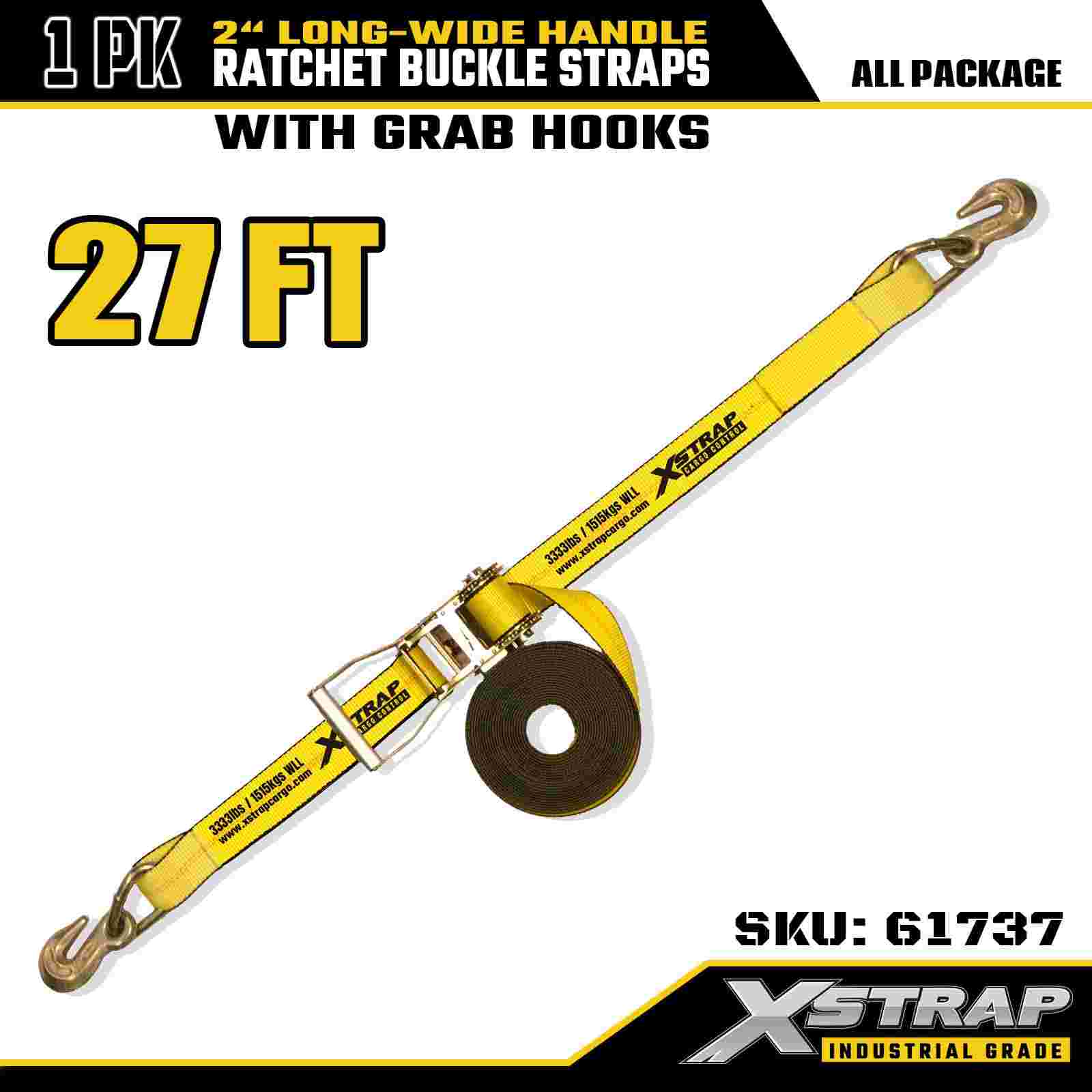 Xstrap 61737 Dualgas Trom 2" x 27' 1PK Strap Ratchet le Grab Hooks Buí, WLL 3,333 lb, Liathróid Láimhe Fada Leathan Ceangail Síos Strap le haghaidh Innealra & Trealamh