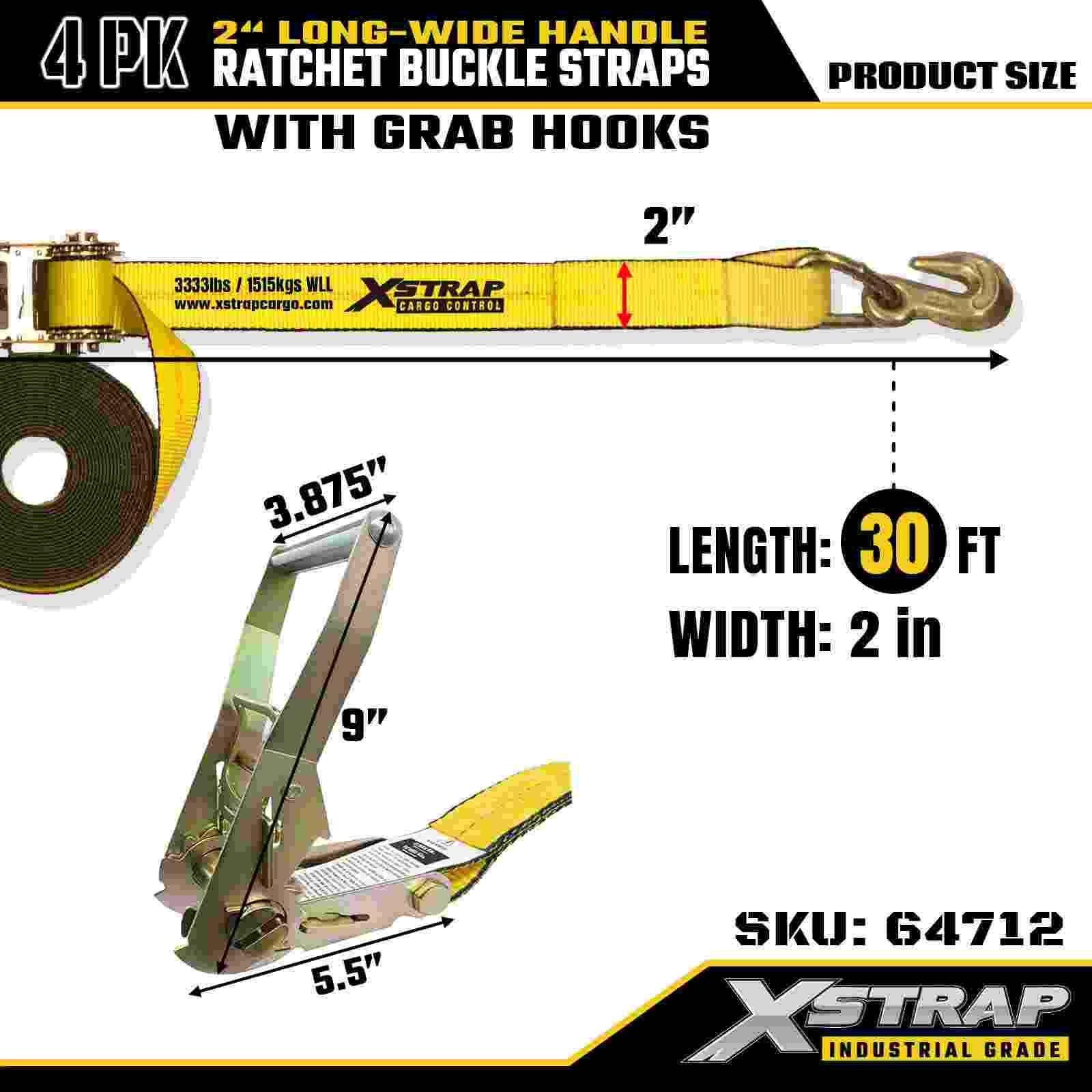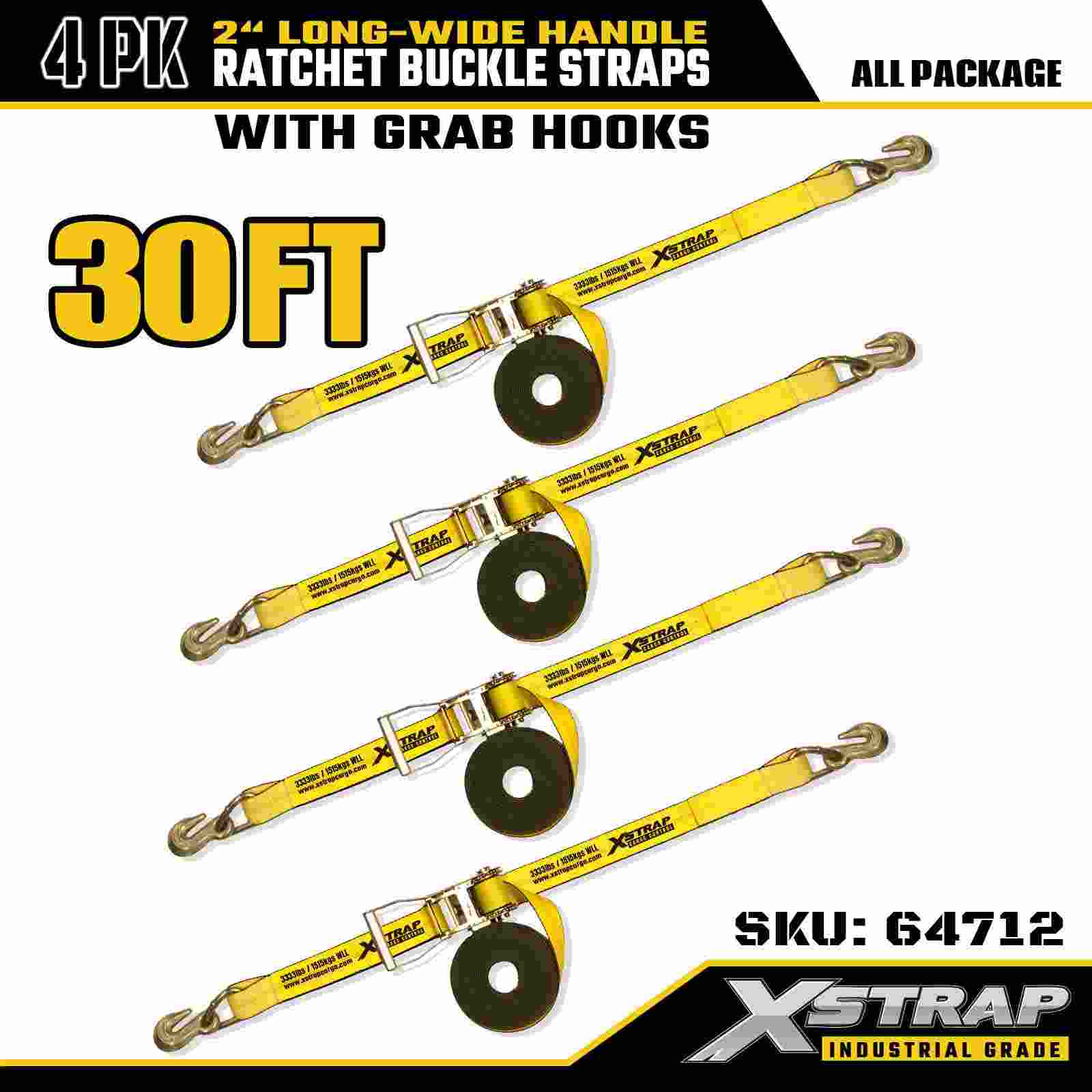 Xstrap 64712 2" x 30 troigh ar Leathan Láimhsiú Búcla Ratchet Strapaí (4-Pacáiste) – Crúcaí Grab, Cumas 10,000 lb, Ceangail Síos Trom Dleachta le haghaidh Iompar Trealaimh Mhóir