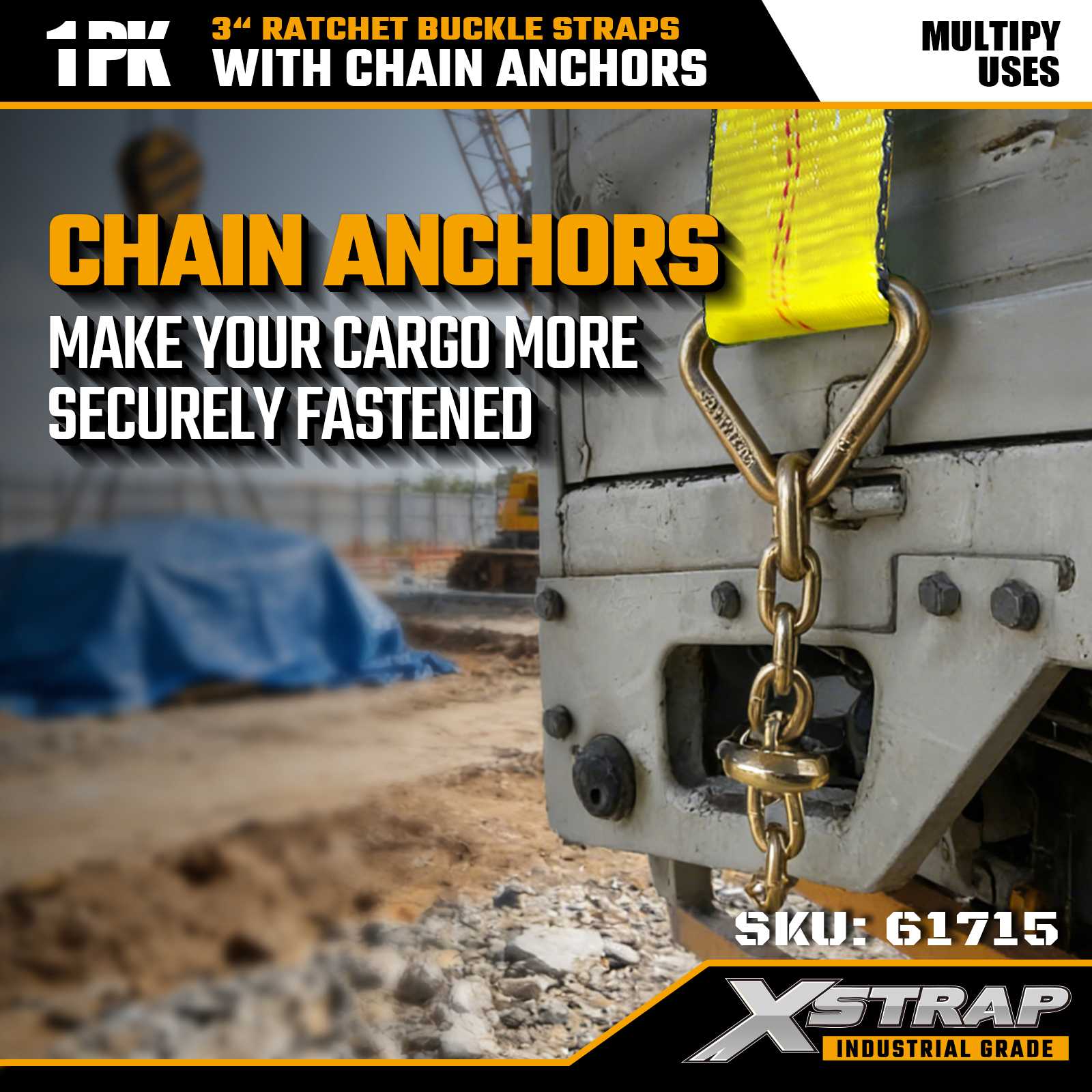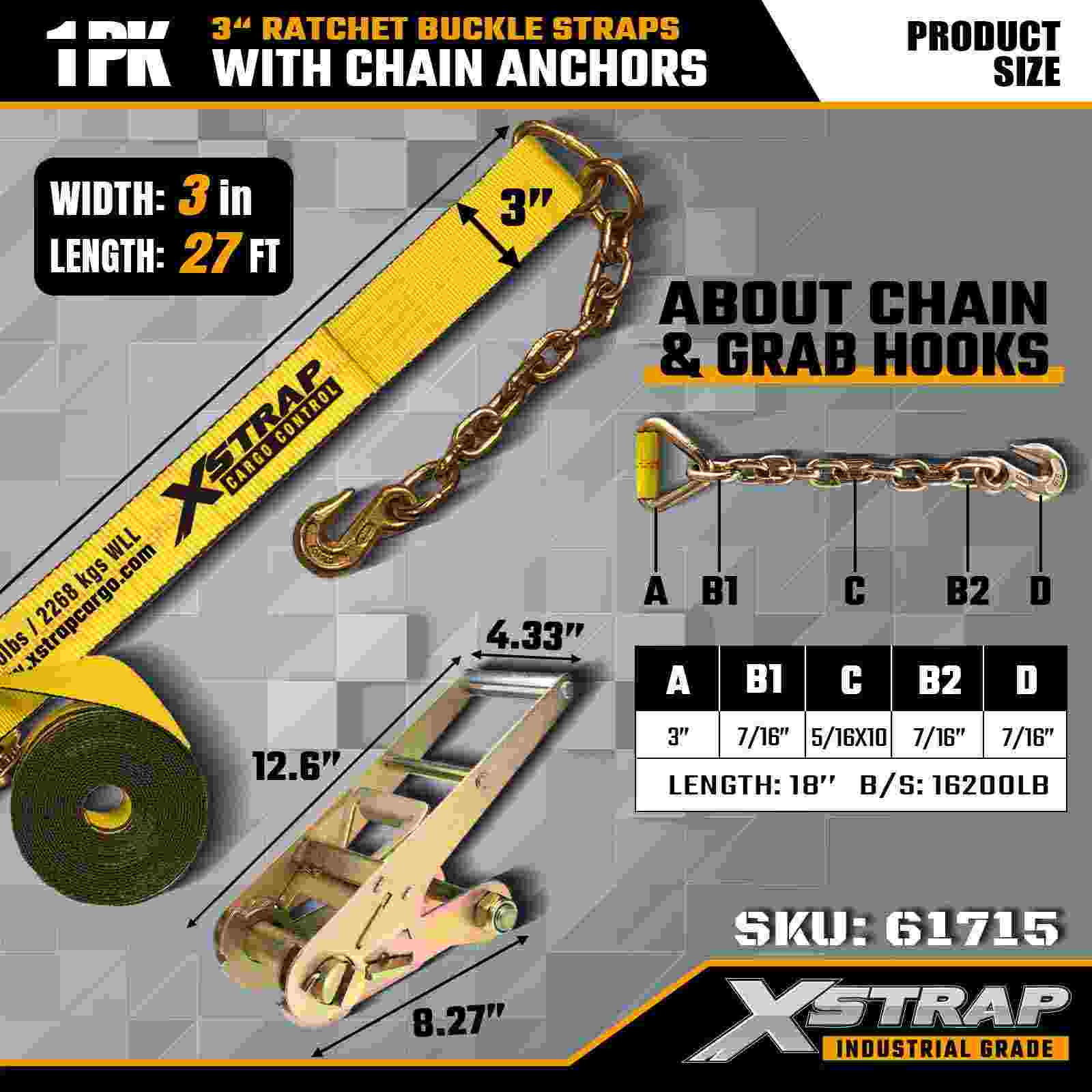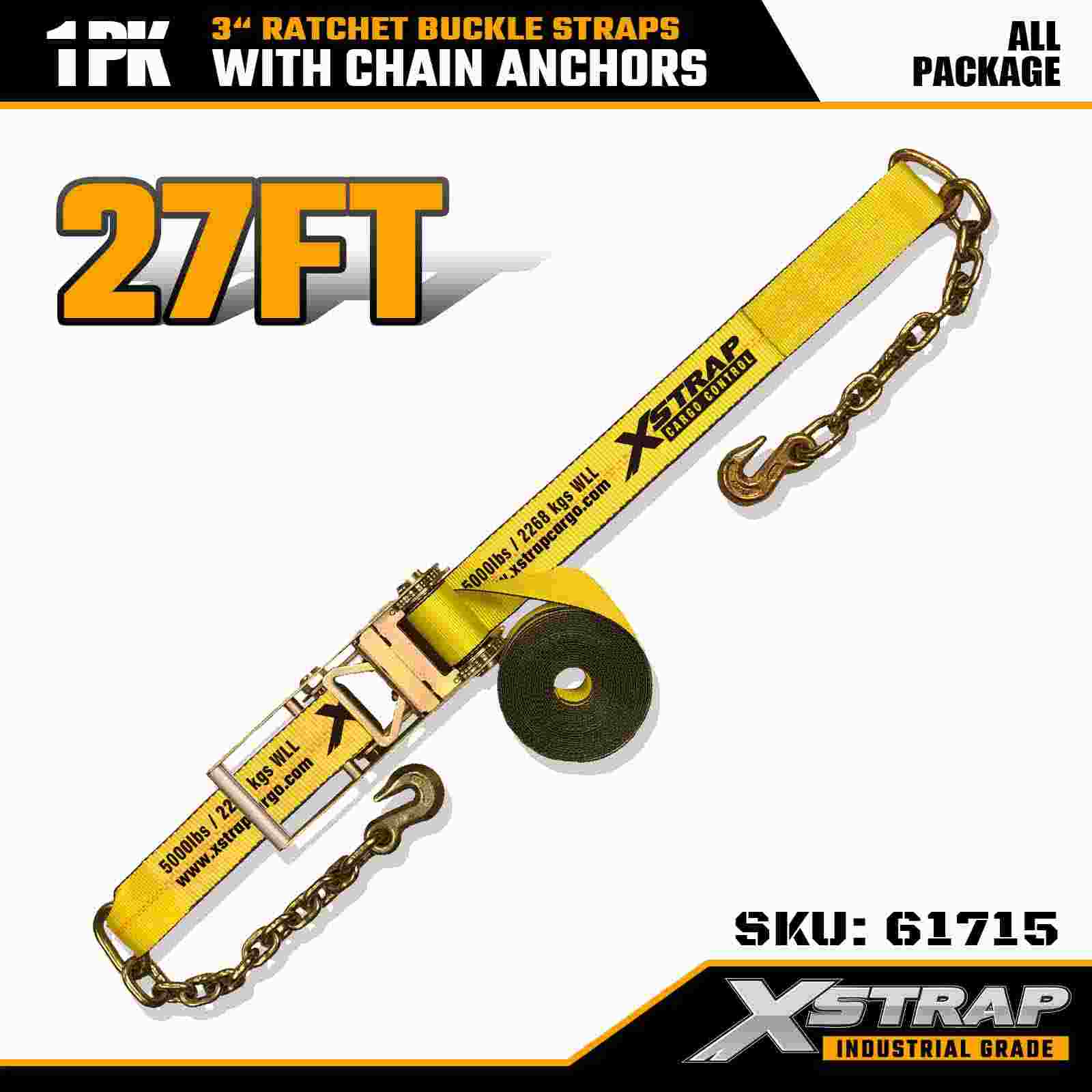 Xstrap 61715 3" x Strapaí Búcla Ratchet 27 troigh (1-Phacáiste) – Ancairí Slabhra, Acmhainn Ualach 5,000 lb, Neart Briseadh 15,000 lb. Deartha do rialú lasta tromshaothair, comhcheanglaíonn na strapaí seo uigí de ghrád tionsclaíochta le foircinn slabhrach iompair agus leantóirí slabhracha.