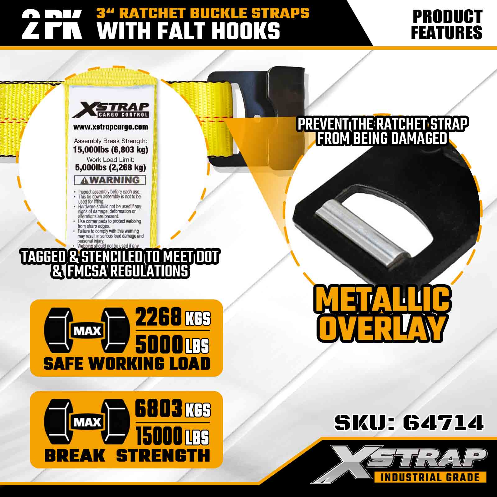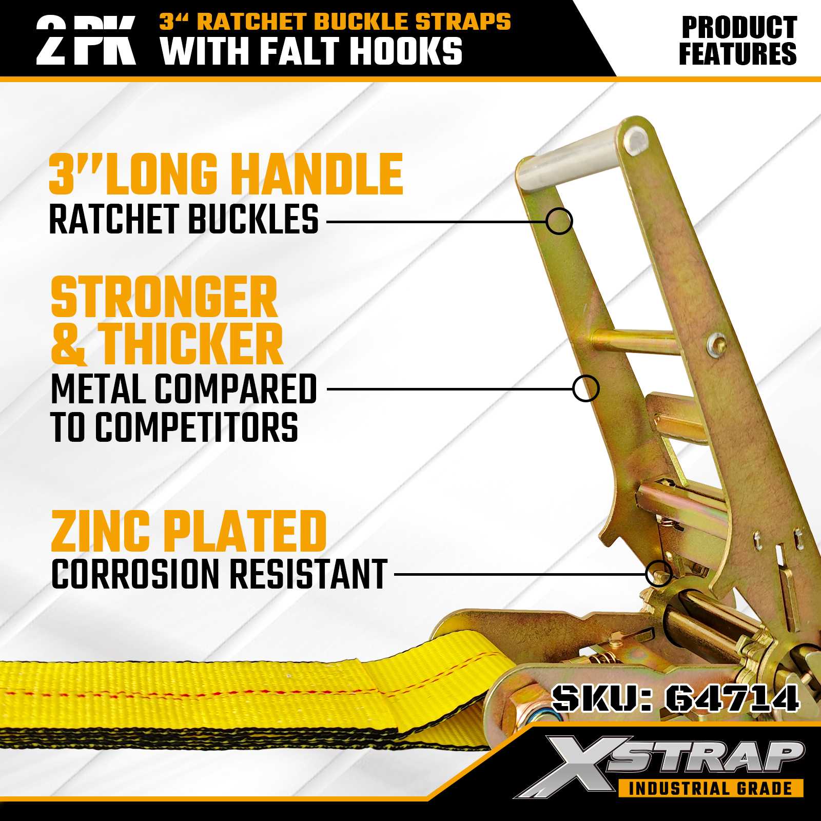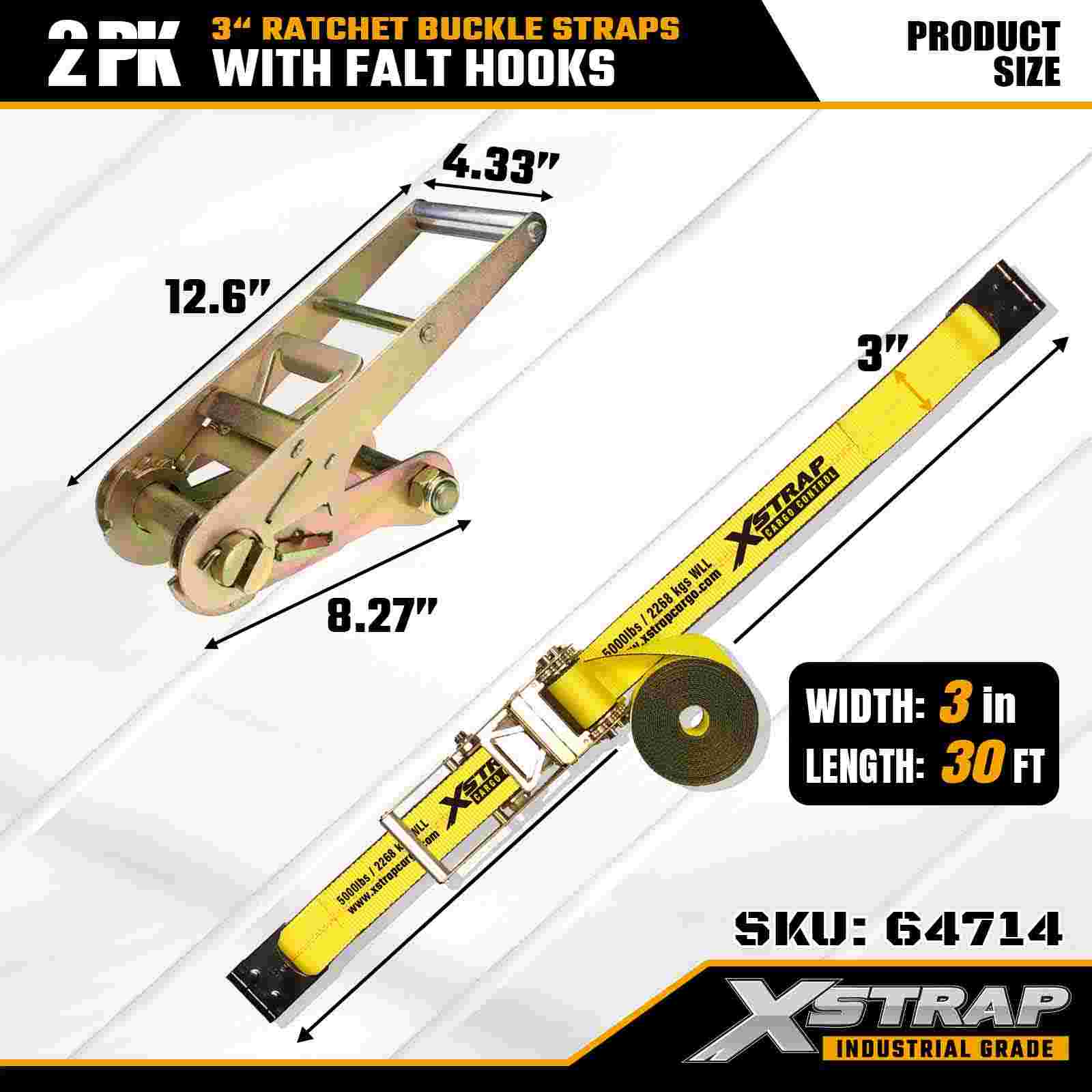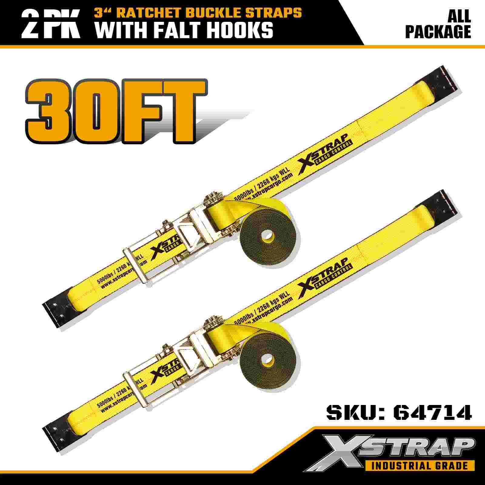 Xstrap 64714 3" x Strapaí Búcla Ratchet 30 troigh (2-Phaca) – Crúcaí Maol, Acmhainn Ualach 5,000 lb, Neart Briseadh 15,000 lb. Deartha do rialú lasta gairmiúil, soláthraíonn na strapaí tromshaothair seo síneadh leathnaithe agus áis dé-phacáiste do thrucailí, leantóirí agus leantóirí.