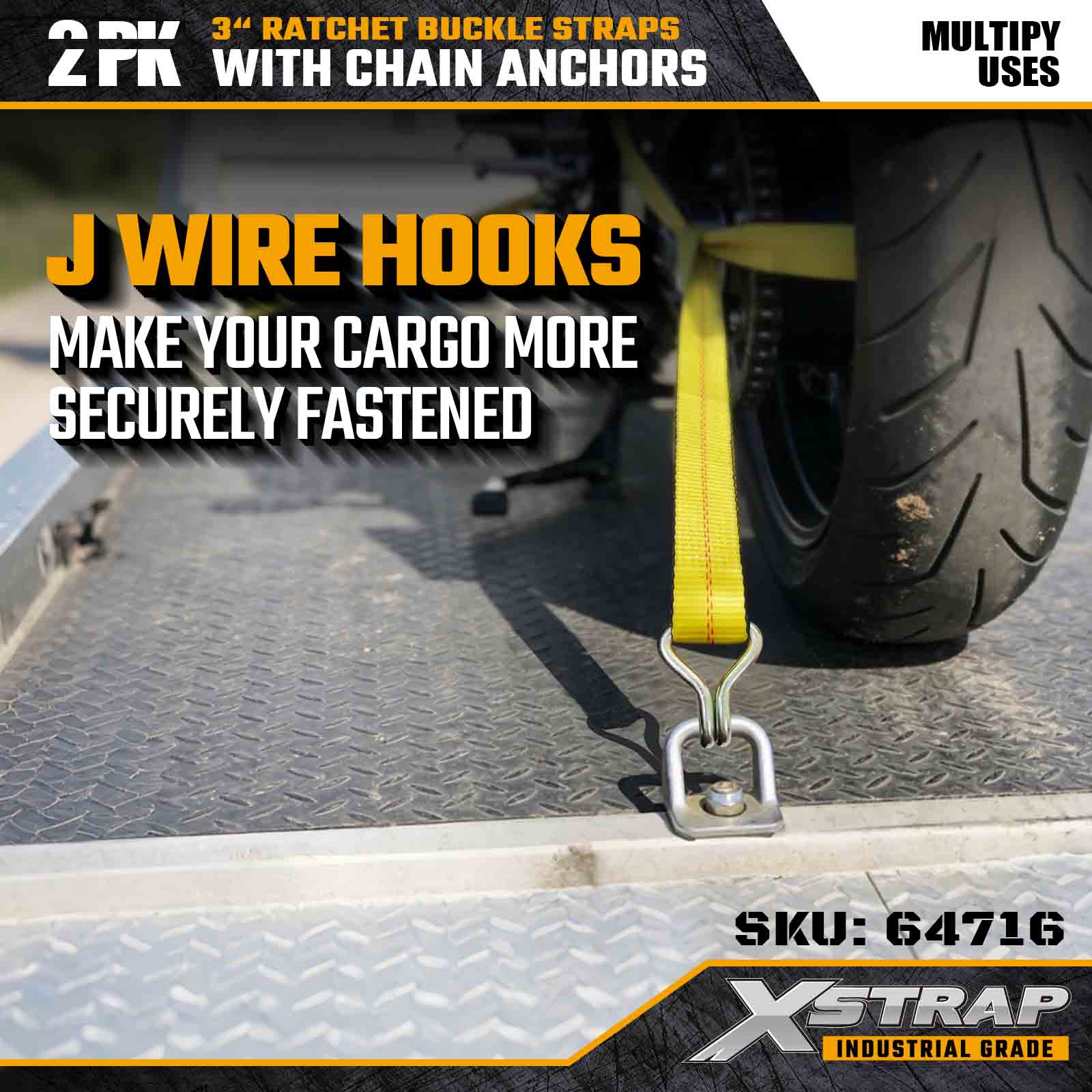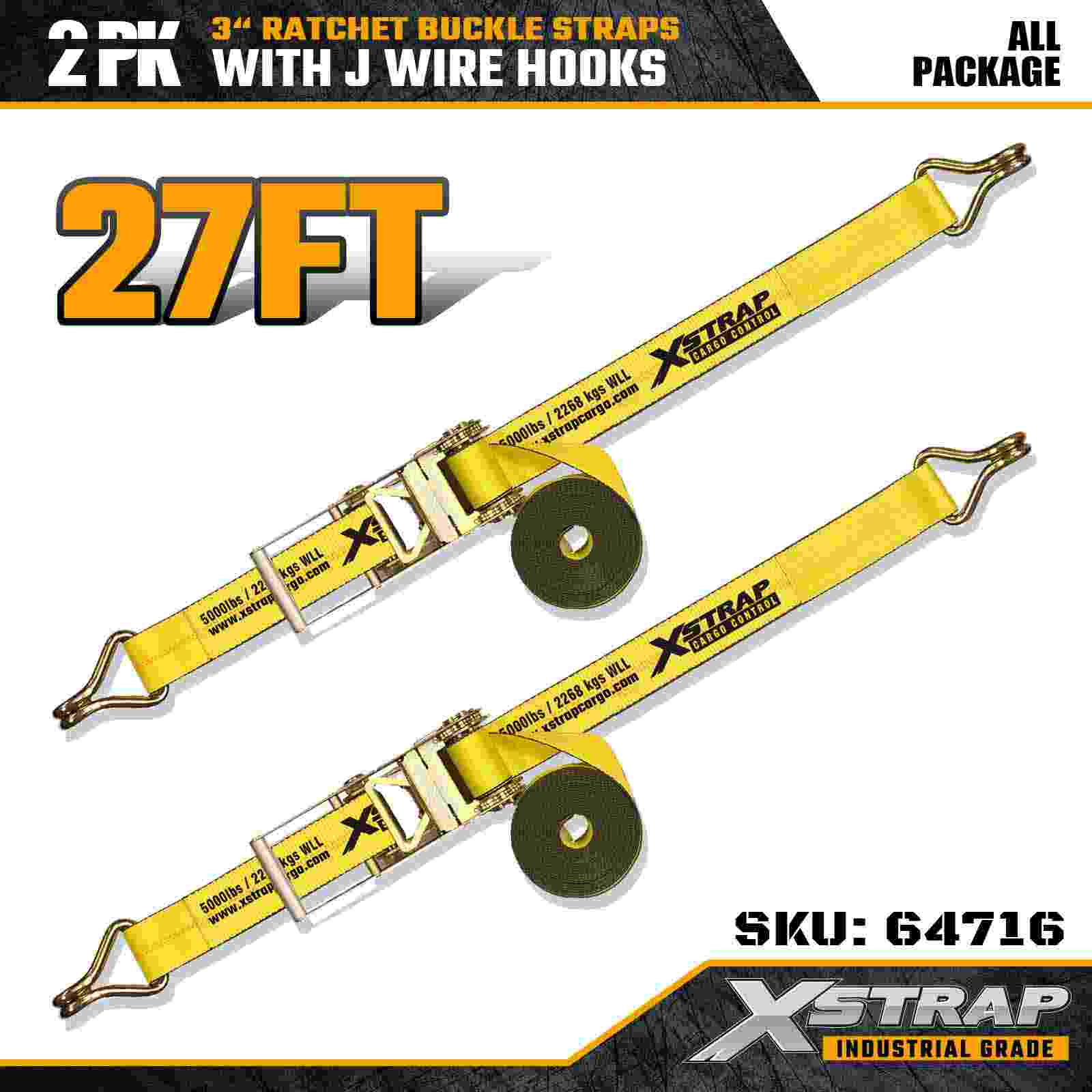 Tá Strapaí Búcla Ratchet Xstrap 64716 3" × 27 troigh (2-phacáiste) deartha le haghaidh urrús gairmiúil lasta, ina bhfuil Hooks Sreanga ard-neart agus meicníocht raicín marthanach. Le Teorainn Ualach Oibre 5,000 lb agus 15,000 lb Neart Briseadh, tá na strapaí seo ag brath ar fheidhmíocht iompair, trealamh leaba cothrom agus tarlaithe.