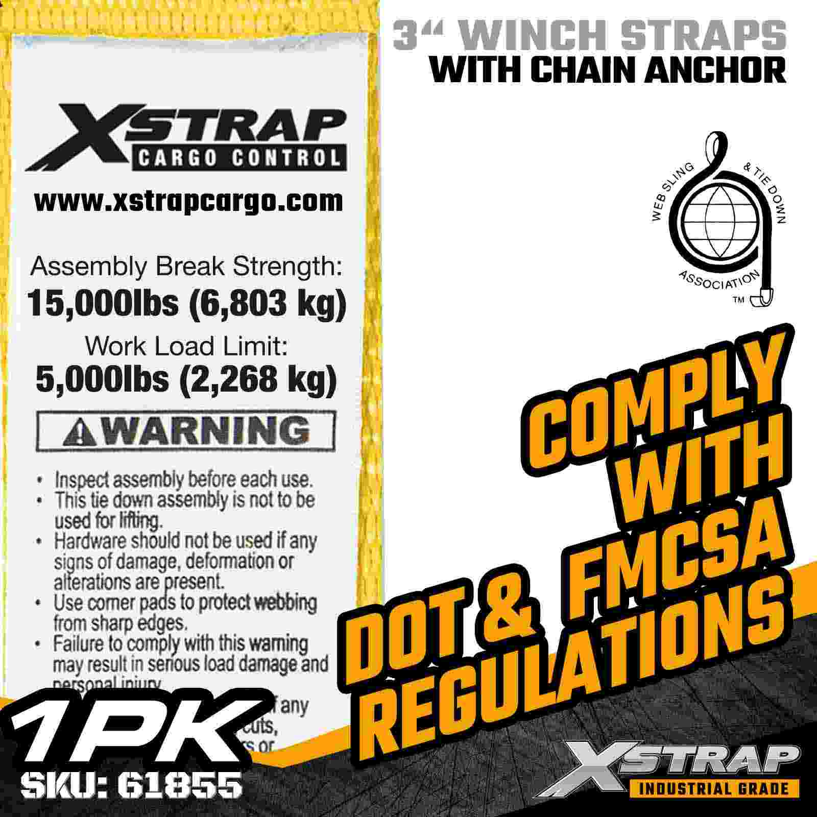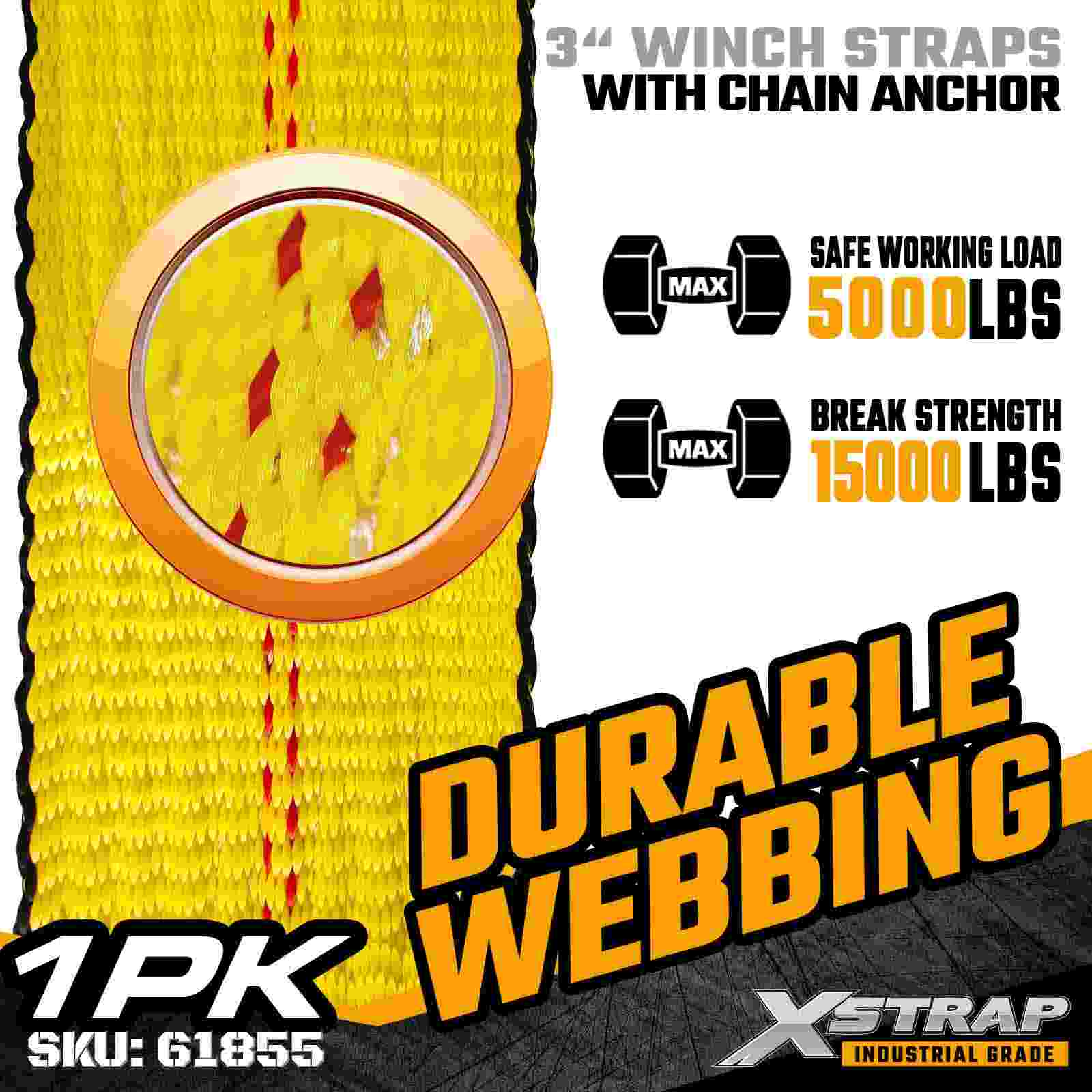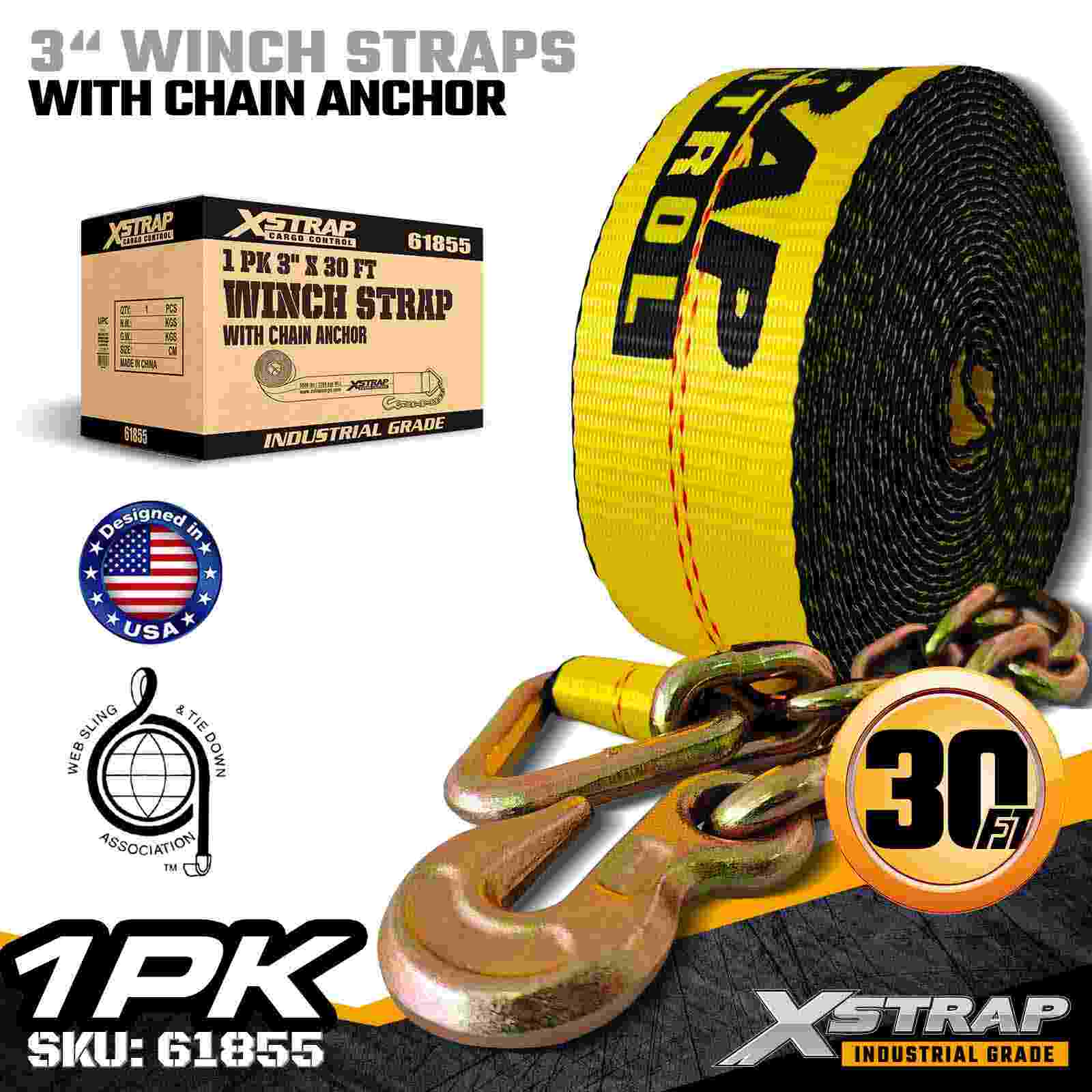 Is strap daingnithe lasta tionsclaíoch tromshaothair é an Xstrap 61855 61855 3" × 30 troigh Standard Winch Strap atá deartha le haghaidh leantóirí leabaithe agus lasta rómhór. Feistithe le Ancaire Slabhra brionnaithe agus uigí poileistear 3-orlach seach-leathan, seachadann an strap winch 3 orlach seo 5,000 lbs Teorainn Ualach Oibre, Briseadh 15 lb. agus 15 lb. Déanann fad 30 troigh an-oiriúnach é chun ualaí níos leithne, níos airde nó de chruth neamhrialta a dhaingniú a dteastaíonn rochtain agus cobhsaíocht bhreise uathu.