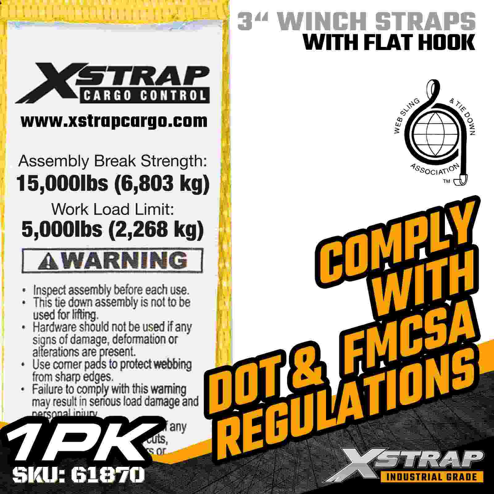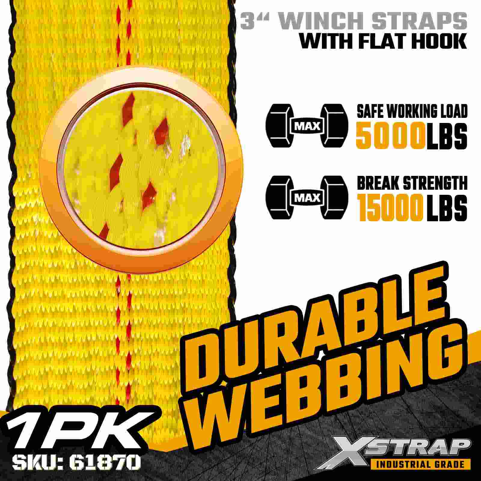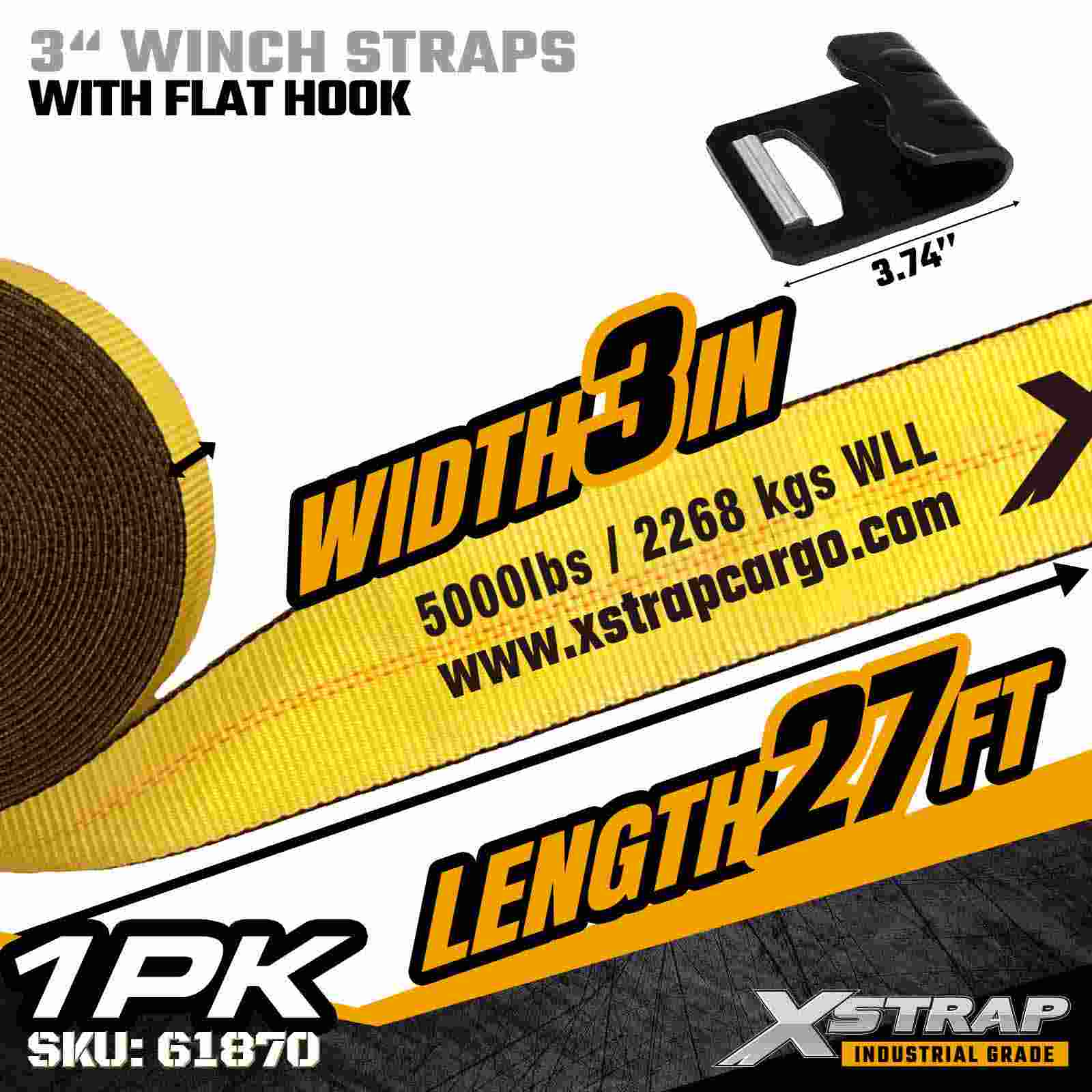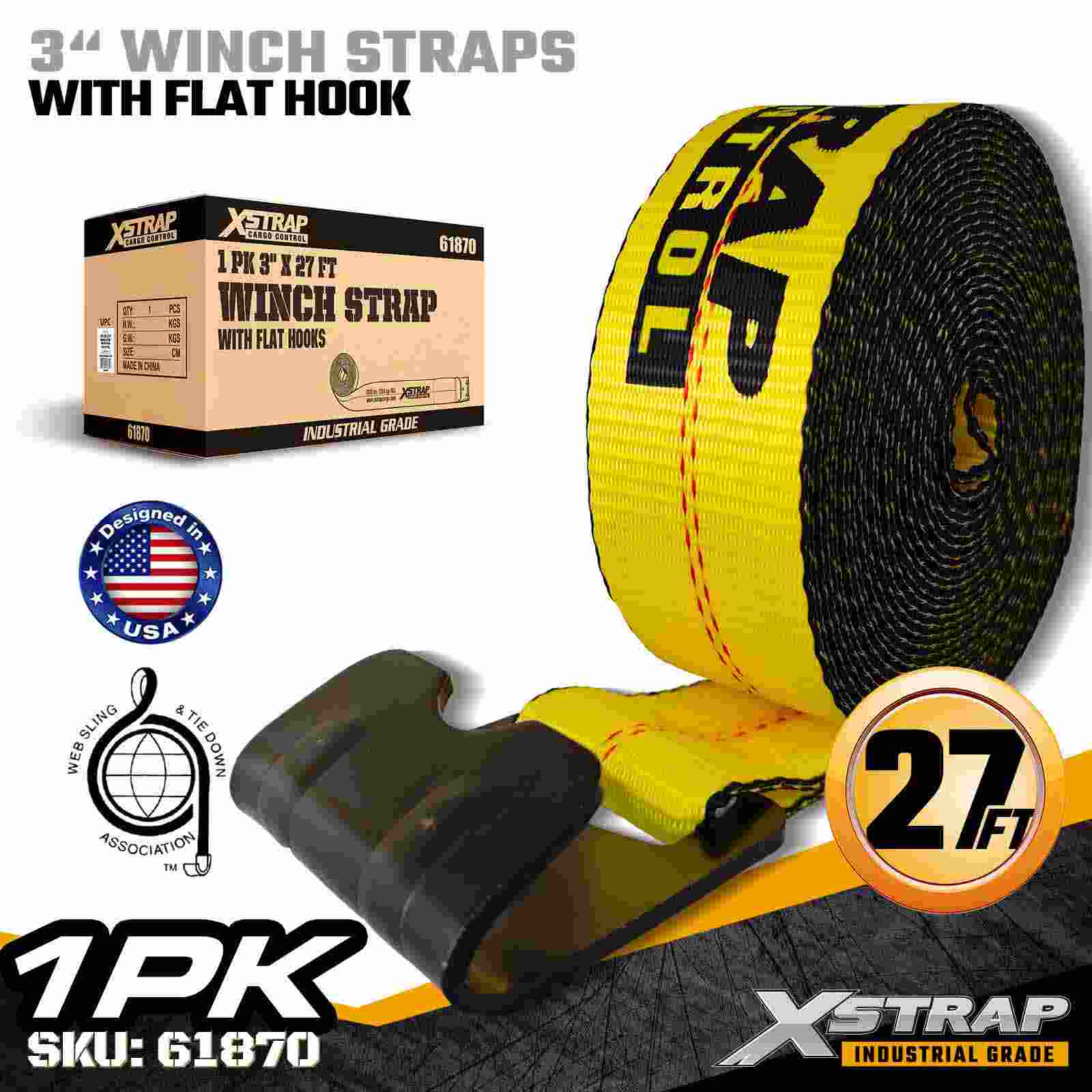 Is strap daingnithe lasta tromshaothair é an Xstrap 61870 3" × 27 troigh Standard Winch Strap atá deartha le haghaidh leantóirí leabaithe agus iompar ard-acmhainne. Ina bhfuil Hook Maol athneartaithe agus uigí poileistear 3-orlach seach-leathan, seachadann an strap winch 3 orlach seo teorainn 5,000 lbs do Lucht Oibre agus 1 £ eng. lumber, cruach, innealra, agus lasta tionsclaíoch le linn oibríochtaí tarlaithe éilitheach.