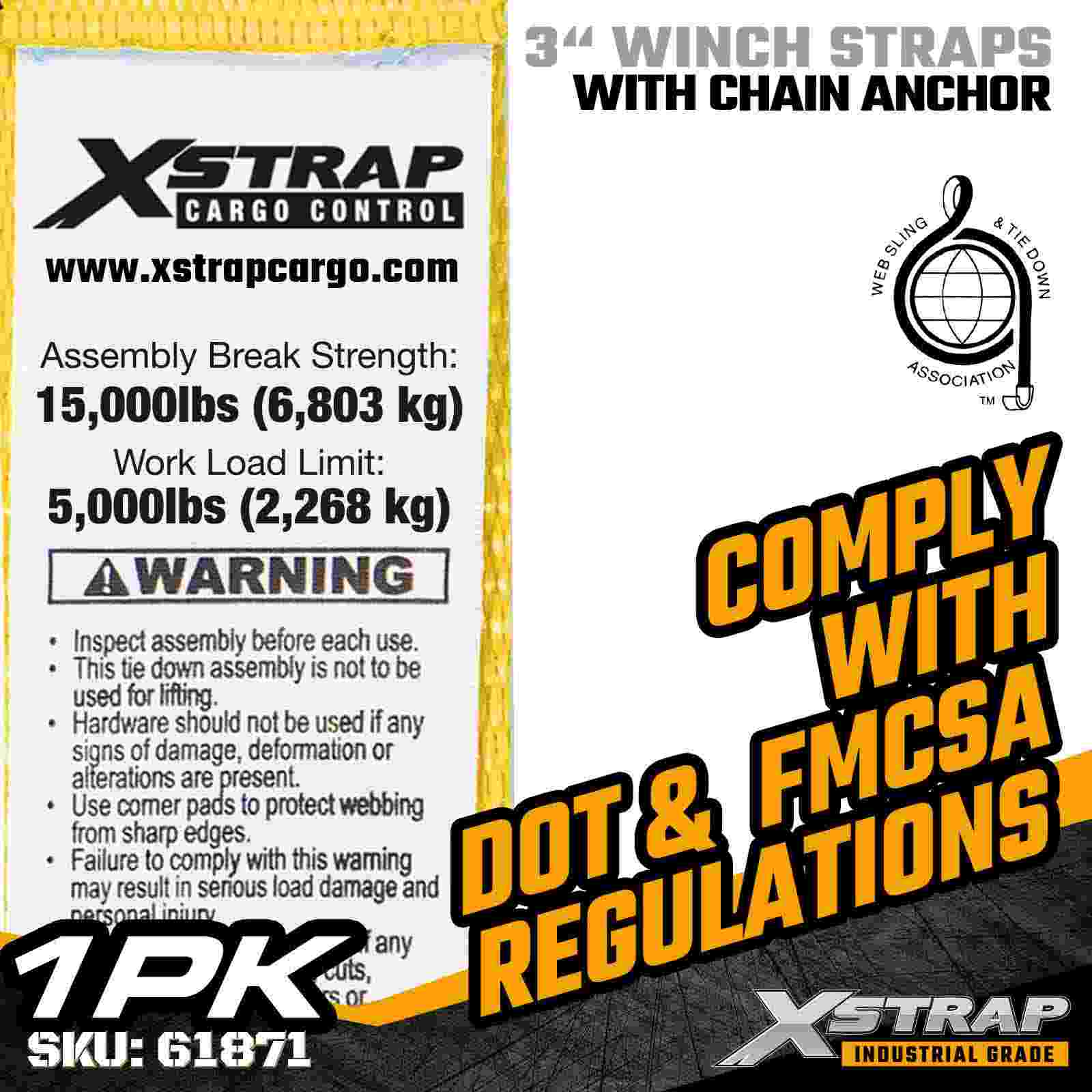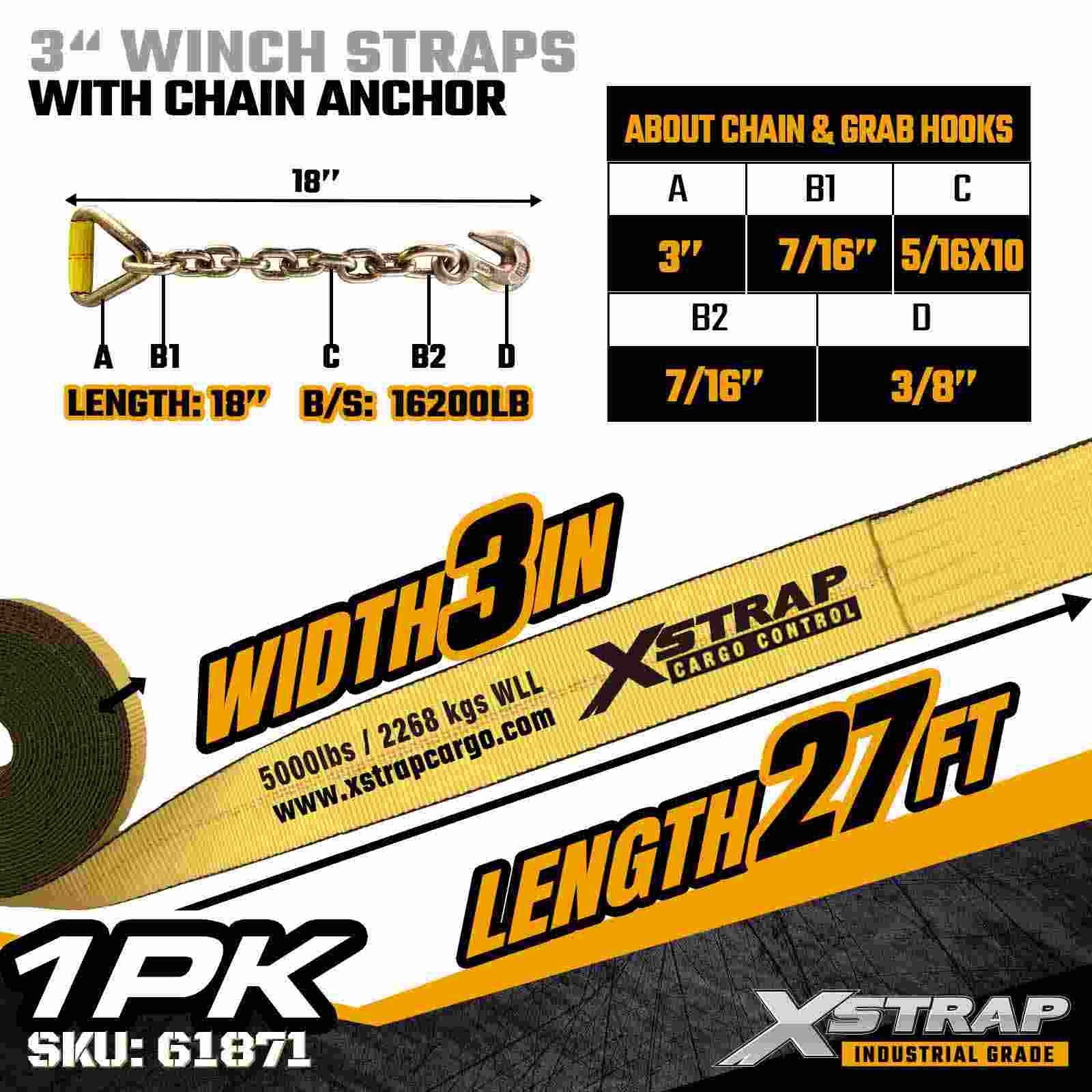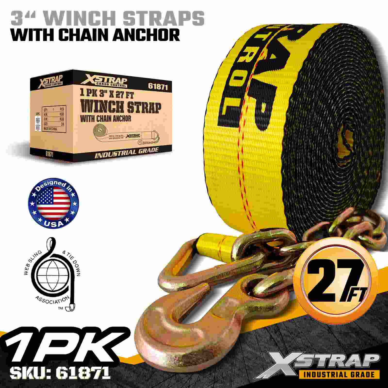 Déantar an Strap Winch Caighdeánach Xstrap 61871 3" × 27 troigh a innealtóireacht le haghaidh lasta tromshaothair a dhaingniú ar leantóirí leaba cothroma. Agus Ancaire Slabhra brionnaithe agus uigí poileistear 3-orlach seach-leathan ann, seachadann an strap winch 3 orlach seo Teorainn Ualach Oibre 5,000 lb. agus 15,000 lb. Neart uasta Briseadh áit a bhfuil sé deartha le haghaidh feidhmeanna tionsclaíochta uasta. agus cobhsaíocht ag teastáil.