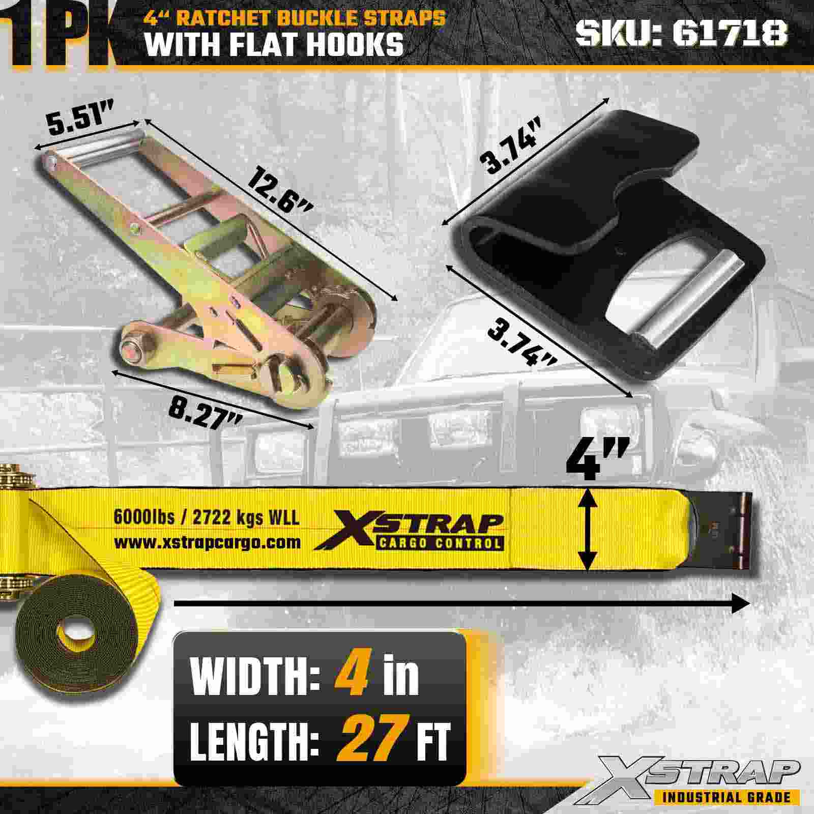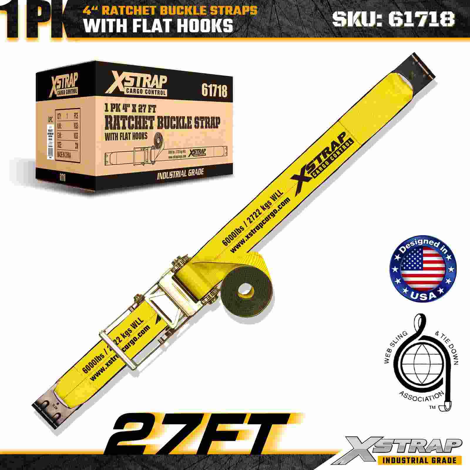 Tá an Strap Búcla Ratchet Xstrap 61718 4" × 27 troigh (1-Pacáiste) tógtha le haghaidh lasta fíor-dhualgais a urrú, ina bhfuil Hooks Flat treisithe agus meicníocht raicéid tromshaothair. Le Teorainn Ualach Oibre 6,000 lbs agus 18,000 lbs le haghaidh lóistíocht ghairmiúil, innealra iompair agus uasneart tarlaithe, áit a ndéantar innealtóireacht uas-neart iompair, lóistíochta tógála agus trealaimh thionsclaíoch. tá iontaofacht riachtanach.