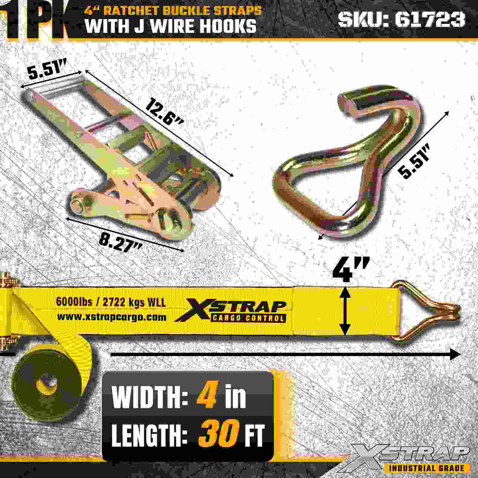 Tá an Strap Búcla Ratchet Xstrap 61723 4" × 30 troigh (1-Pacáiste) tógtha le haghaidh lasta tromshaothair a dhaingniú, le Hooks Sreang athneartaithe agus meicníocht raicín marthanach. Le Teorainn Ualach Oibre 6,000 lbs agus 18,000 lb Neart, tá an strap seo oiriúnach le haghaidh iompair lódála, lódála agus lódála gluaisteán tionsclaíoch iarratais.