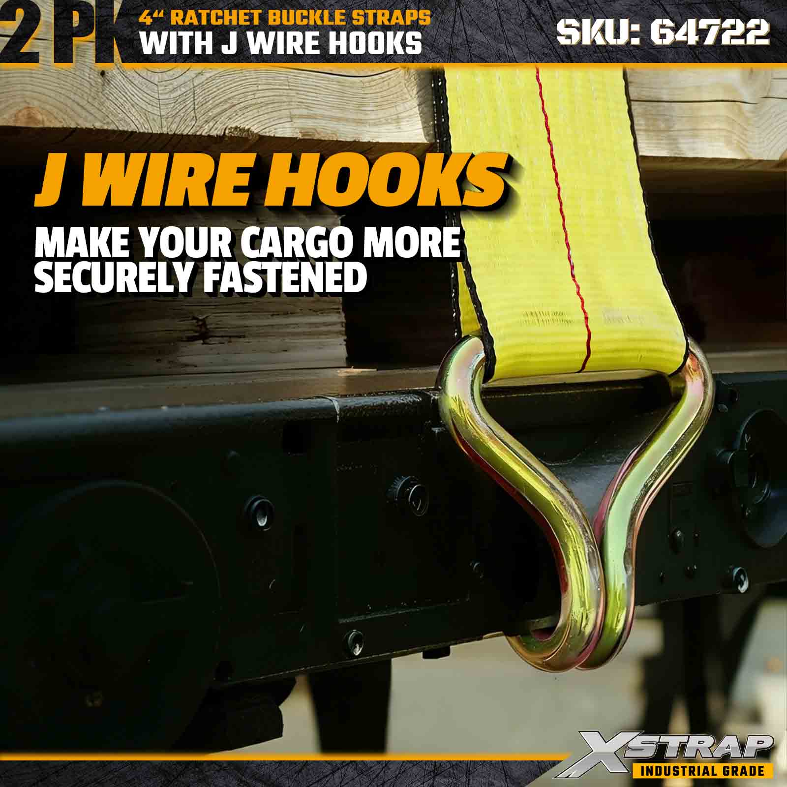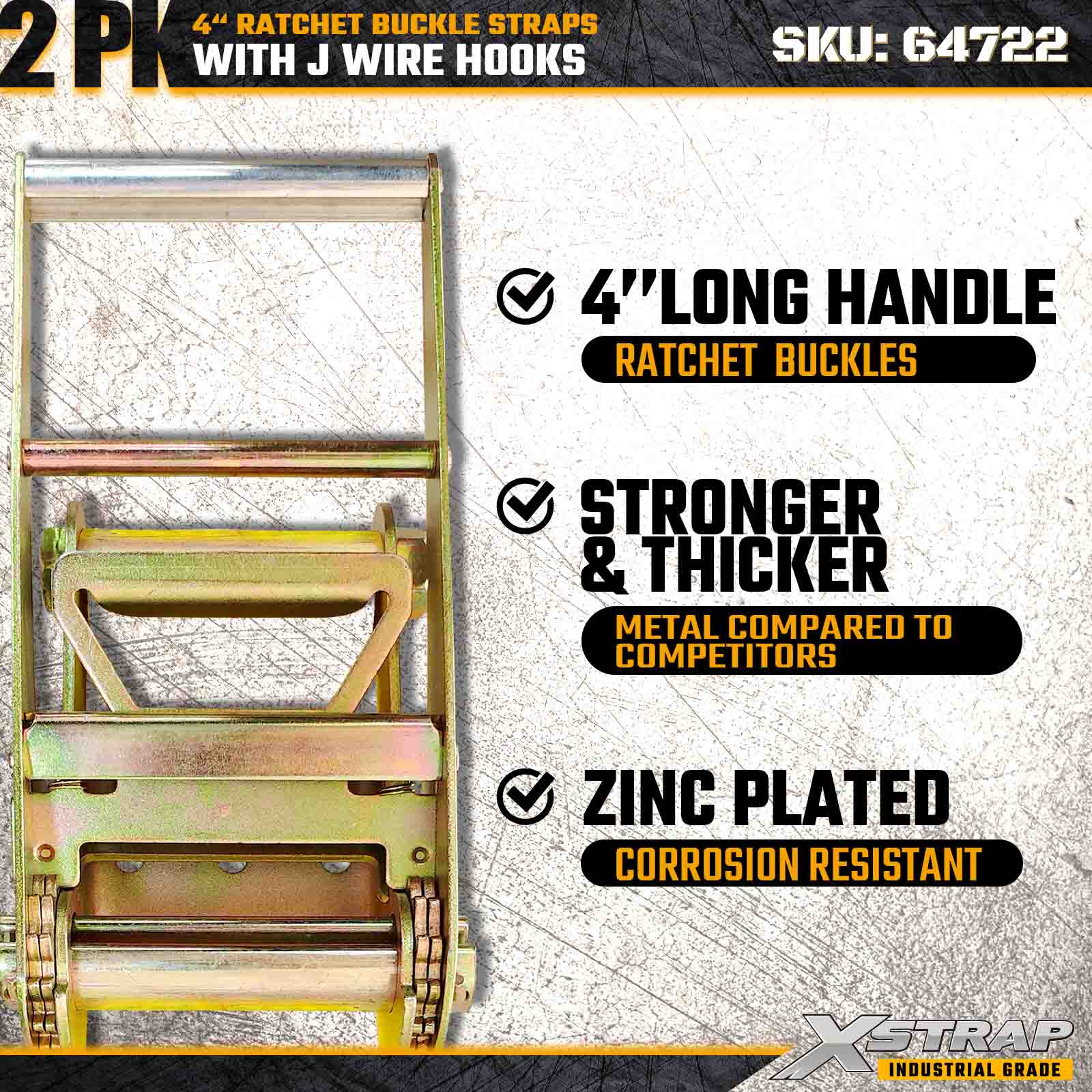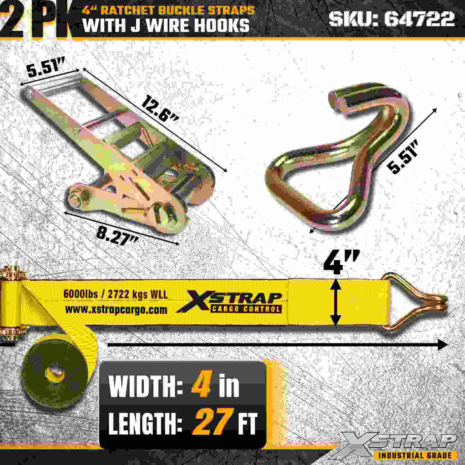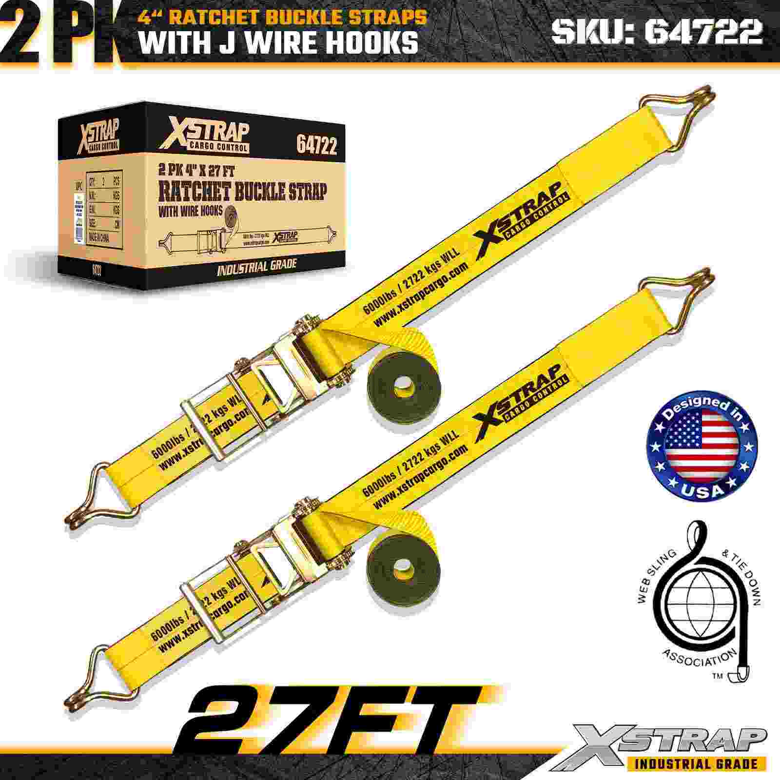 Tá na Strapaí Búcla Ratchet Xstrap 64722 4" × 27 troigh (2-phacáiste) deartha le haghaidh lasta tromshaothair a dhaingniú, le Hooks Sreang athneartaithe agus meicníocht raicín marthanach. Le Teorainn Ualach Oibre 6,000 lbs agus 18,000 lb Neart, is innealra iompair, lódála agus lódála cruach árasán iad na strapaí lódálacha agus lódálacha cruach réidh seo. iarratais.