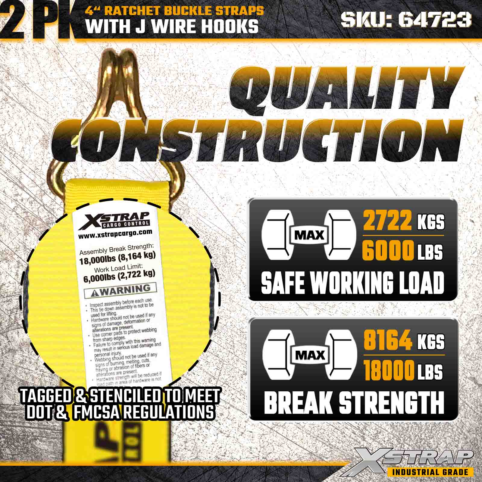 Déantar na Strapaí Búcla Ratchet Xstrap 64723 4" × 30 troigh (2-Pacáiste) a innealtóireacht le haghaidh lasta tromshaothair a dhaingniú, le Hooks Sreang athneartaithe agus meicníocht raicín marthanach. Le Teorainn Ualach Oibre 6,000 lb agus 18,000 lbs, is oiriúnach iad na strapaí iompair, lódála, lódála agus cruach tionsclaíochta seo. iarratais lasta.