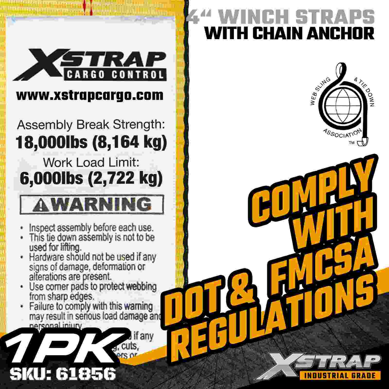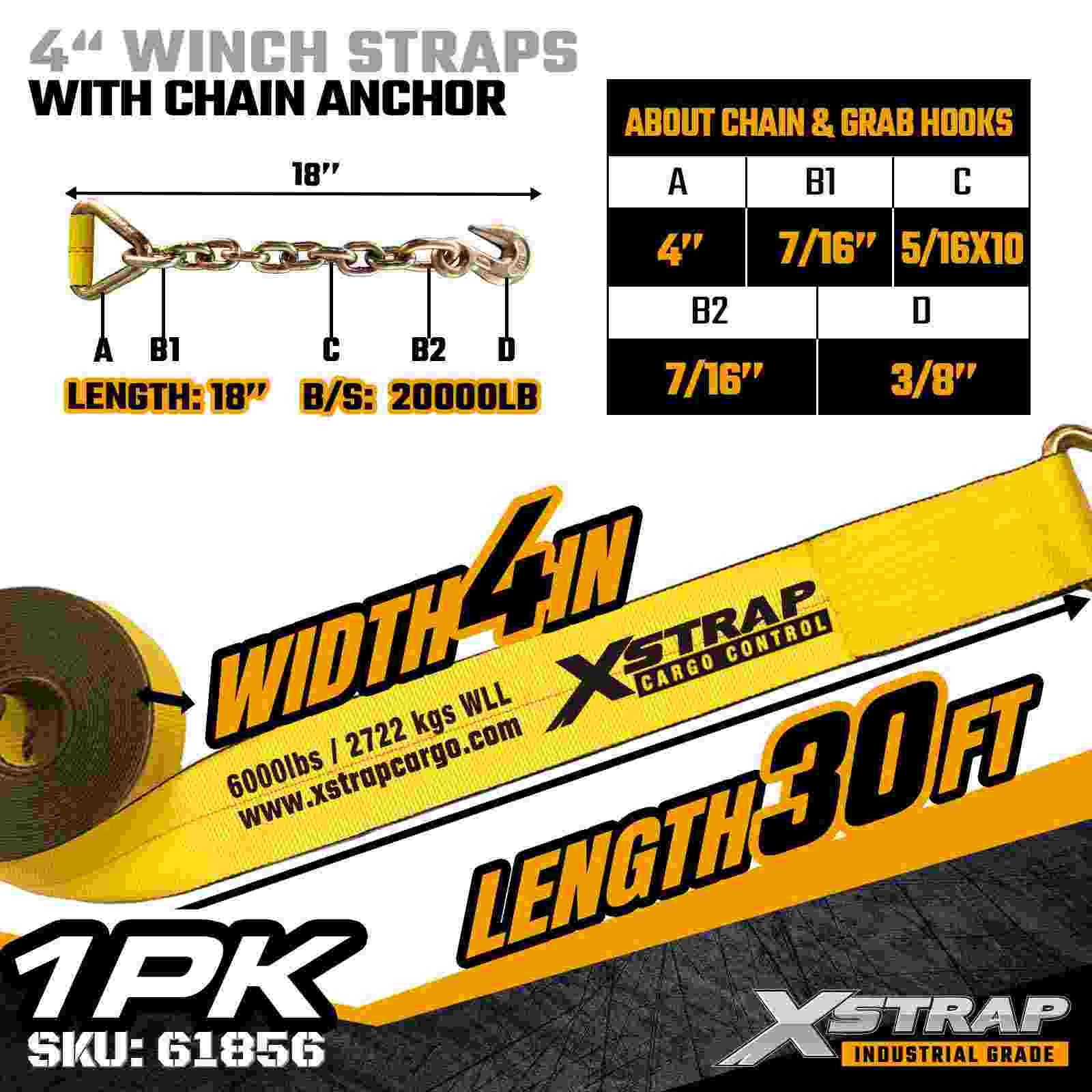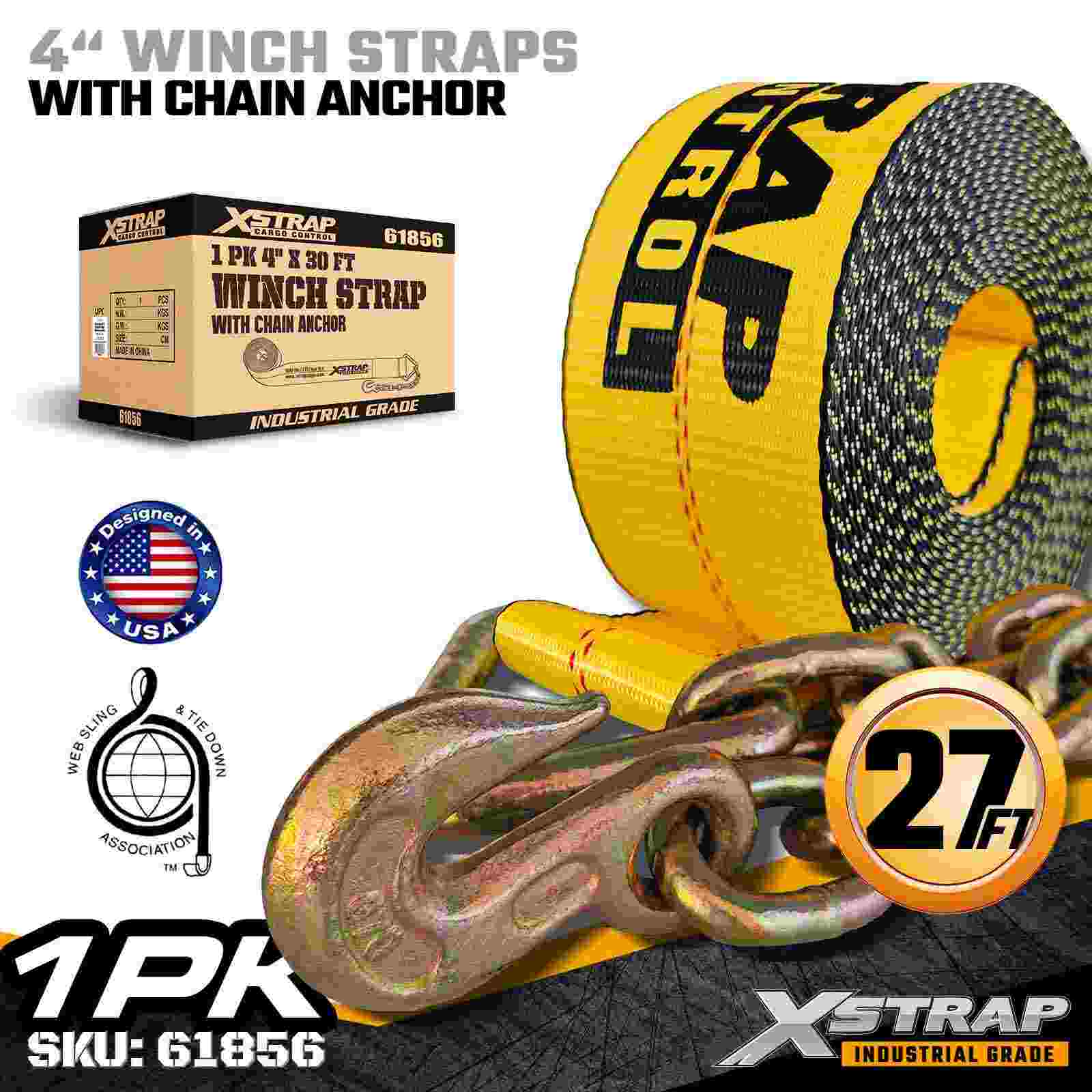 Is strap daingnithe lasta ard-acmhainne é an Xstrap 61856 4" × 30 troigh Standard Winch Strap a innealtóireacht do leantóirí leabaithe agus lasta tionsclaíoch rómhór. Ina bhfuil Ancaire Slabhra brionnaithe agus uigí poileistear 4-orlach ultra-leathan, seachadann an strap winch 4 orlach seo 6,000 orlach Ualach Oibre agus Briseadh 1 lb. Soláthraíonn an fad sínte 30 troigh sroicheadh breise chun ualaí leathana, ard nó neamhrialta a dhaingniú a dteastaíonn an neart agus an chobhsaíocht uasta sealúchais.