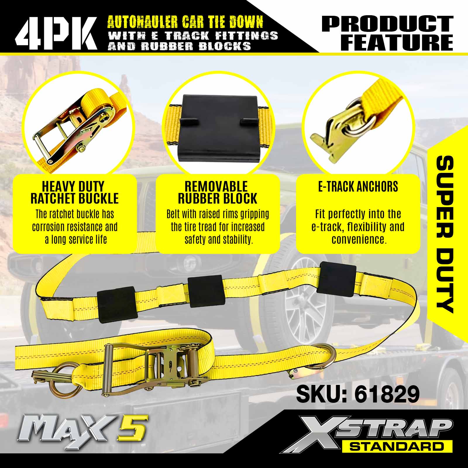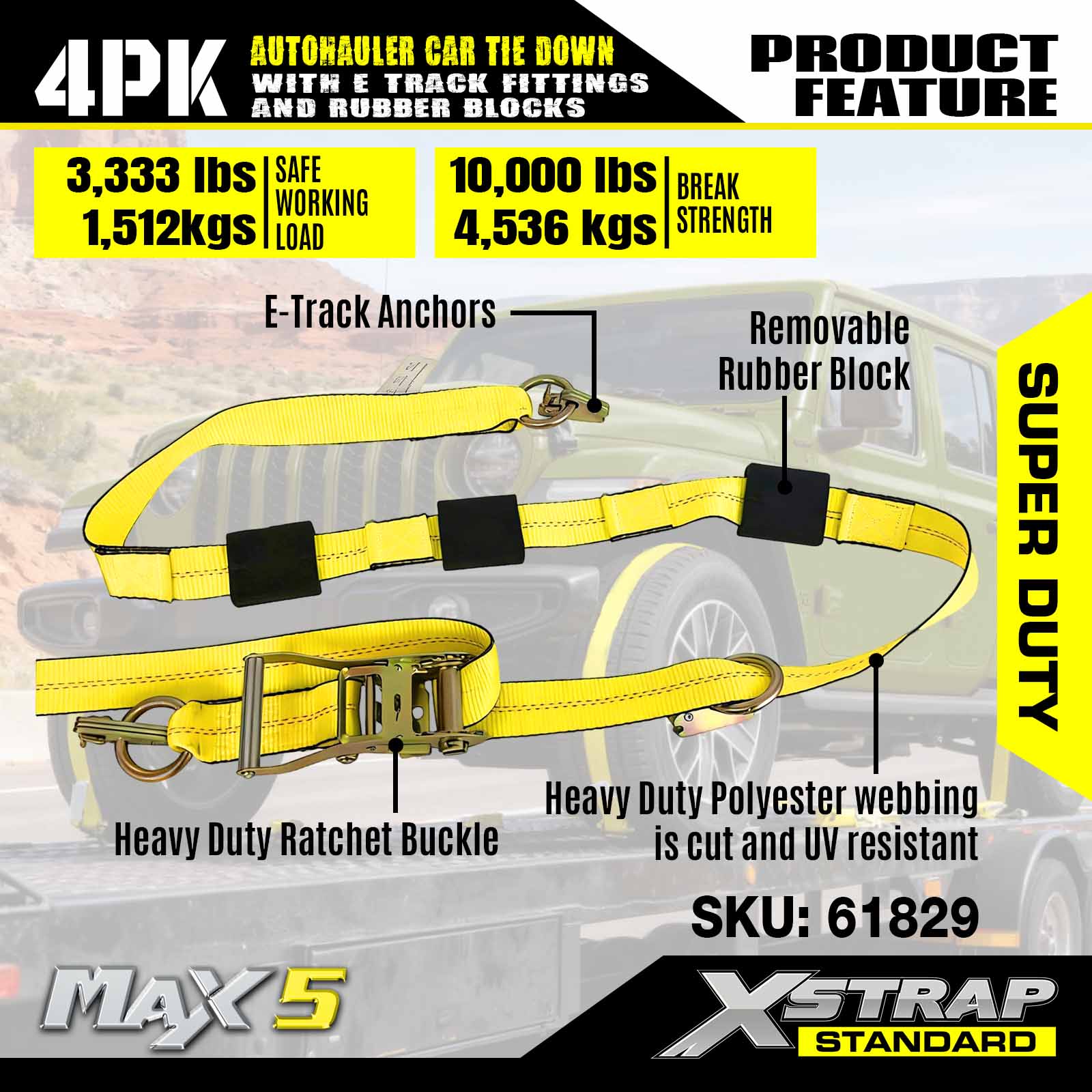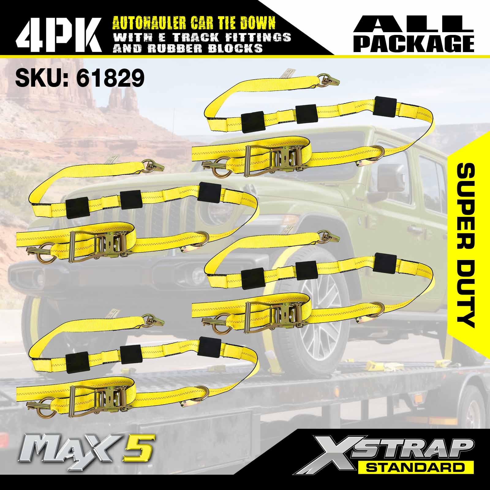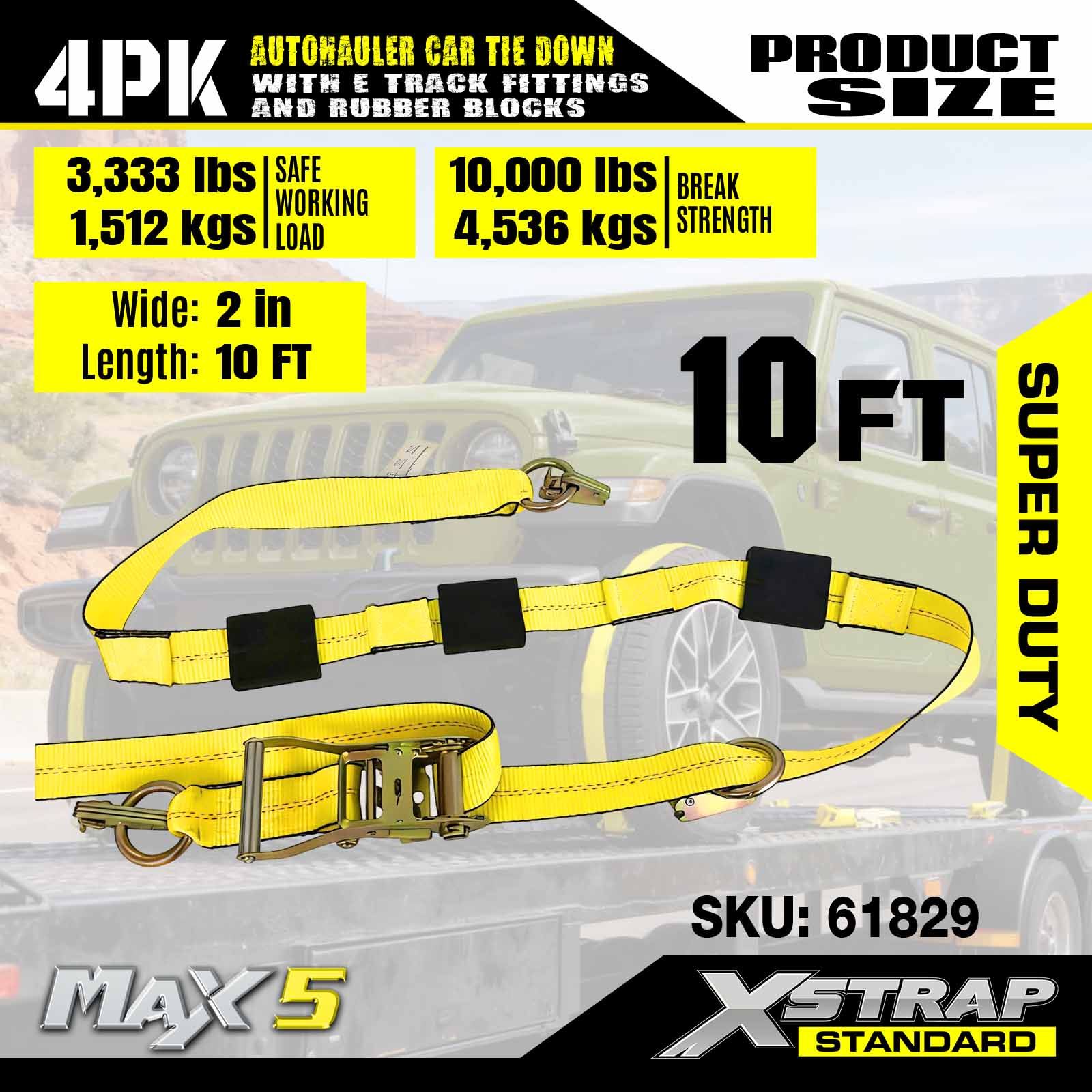 Strapaí Boinn Rian Xstrap E le haghaidh Dualgas Trom Leantóra 2" x 10' Auto-Hauler Strap-10,000lb Neart Briseadh Ráthaithe-(4) Préimh Feithicle Ceangail Dúin Pacáiste le Bloic Rubair Ceangail-Síos le Rothaí le haghaidh Trucail, UTV