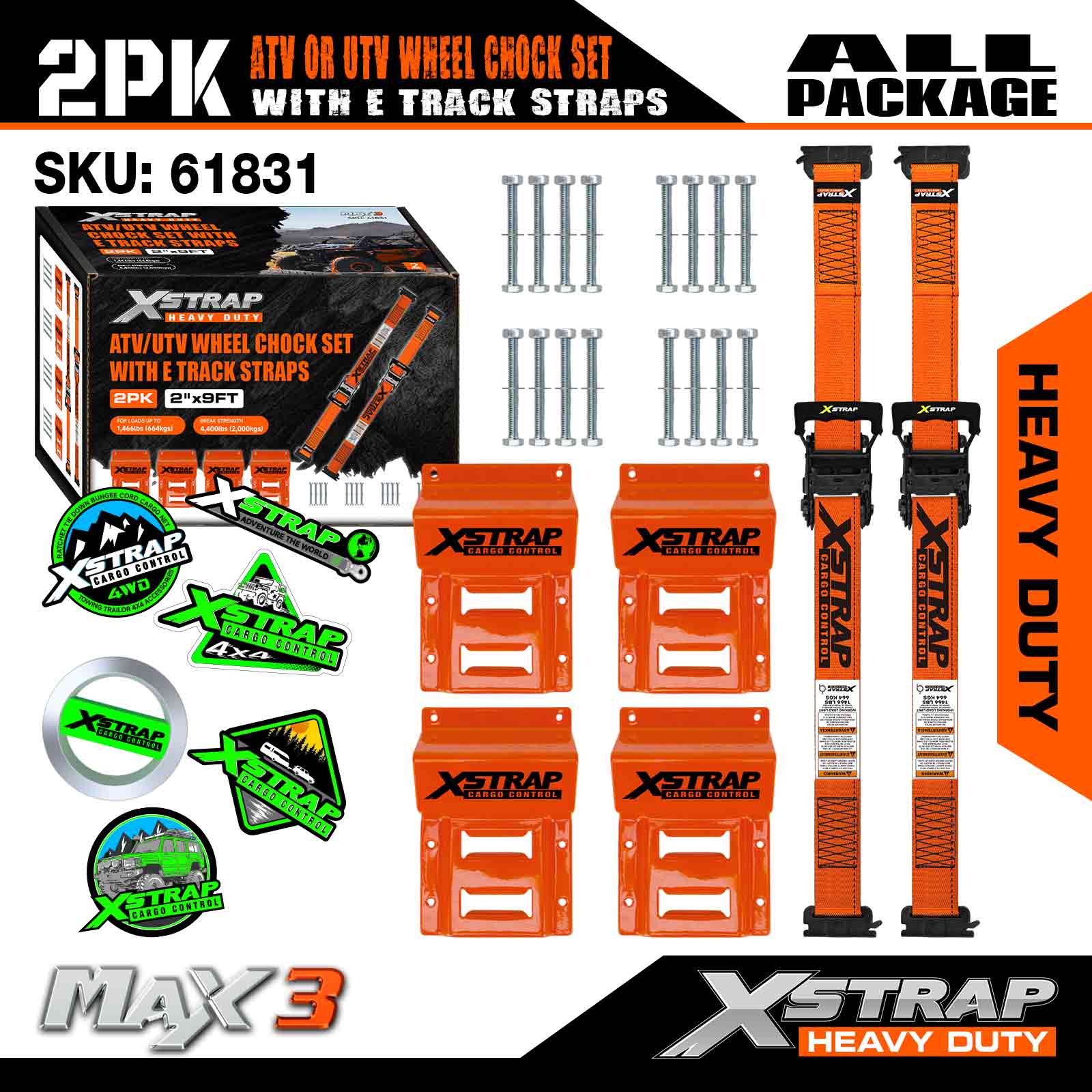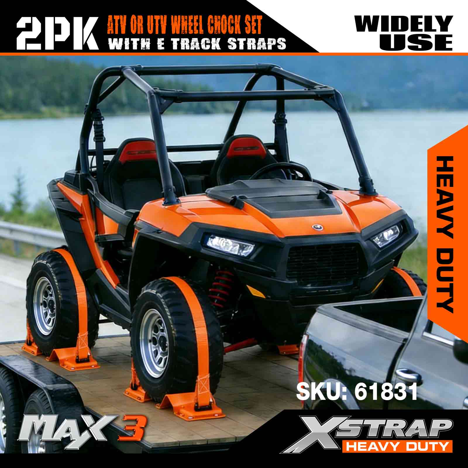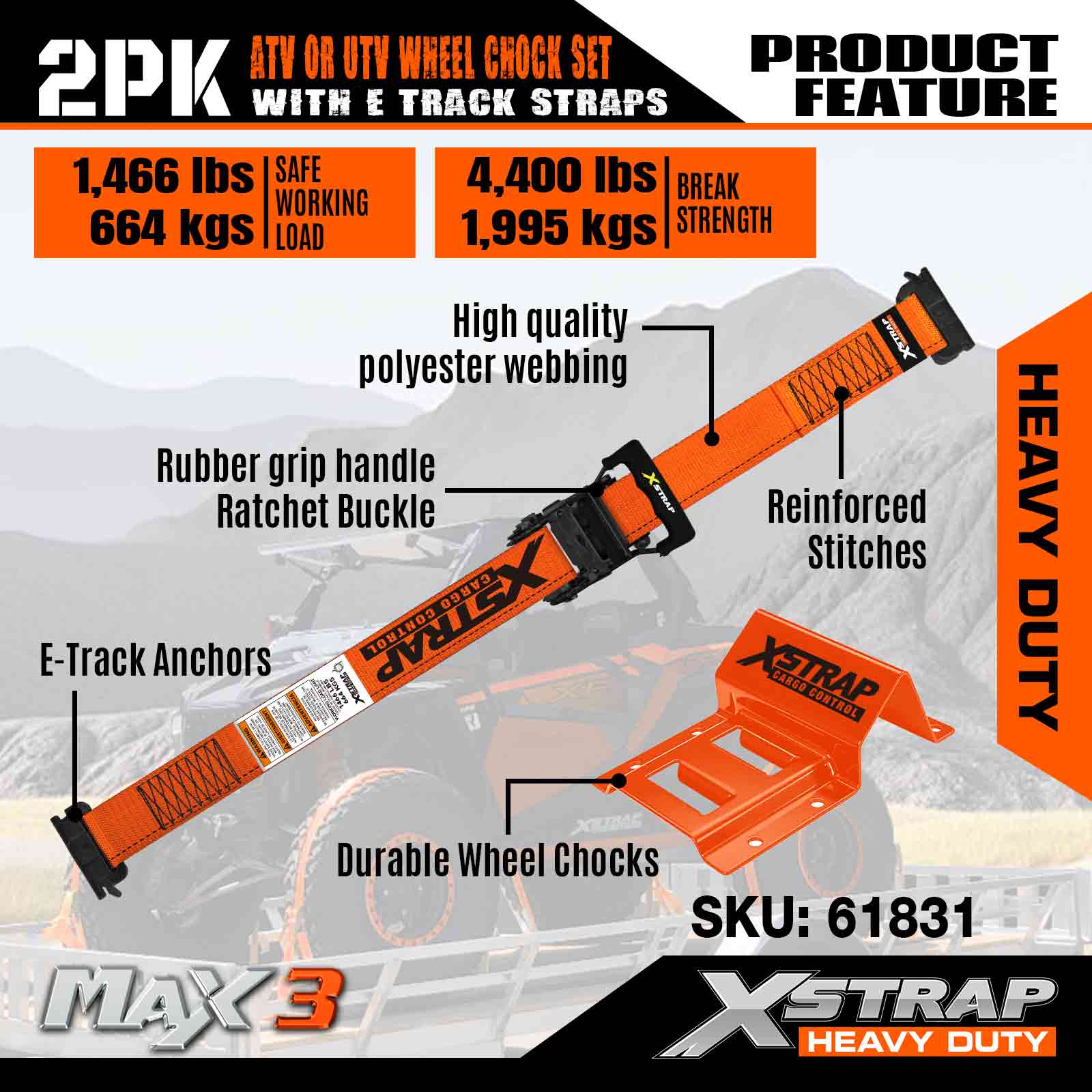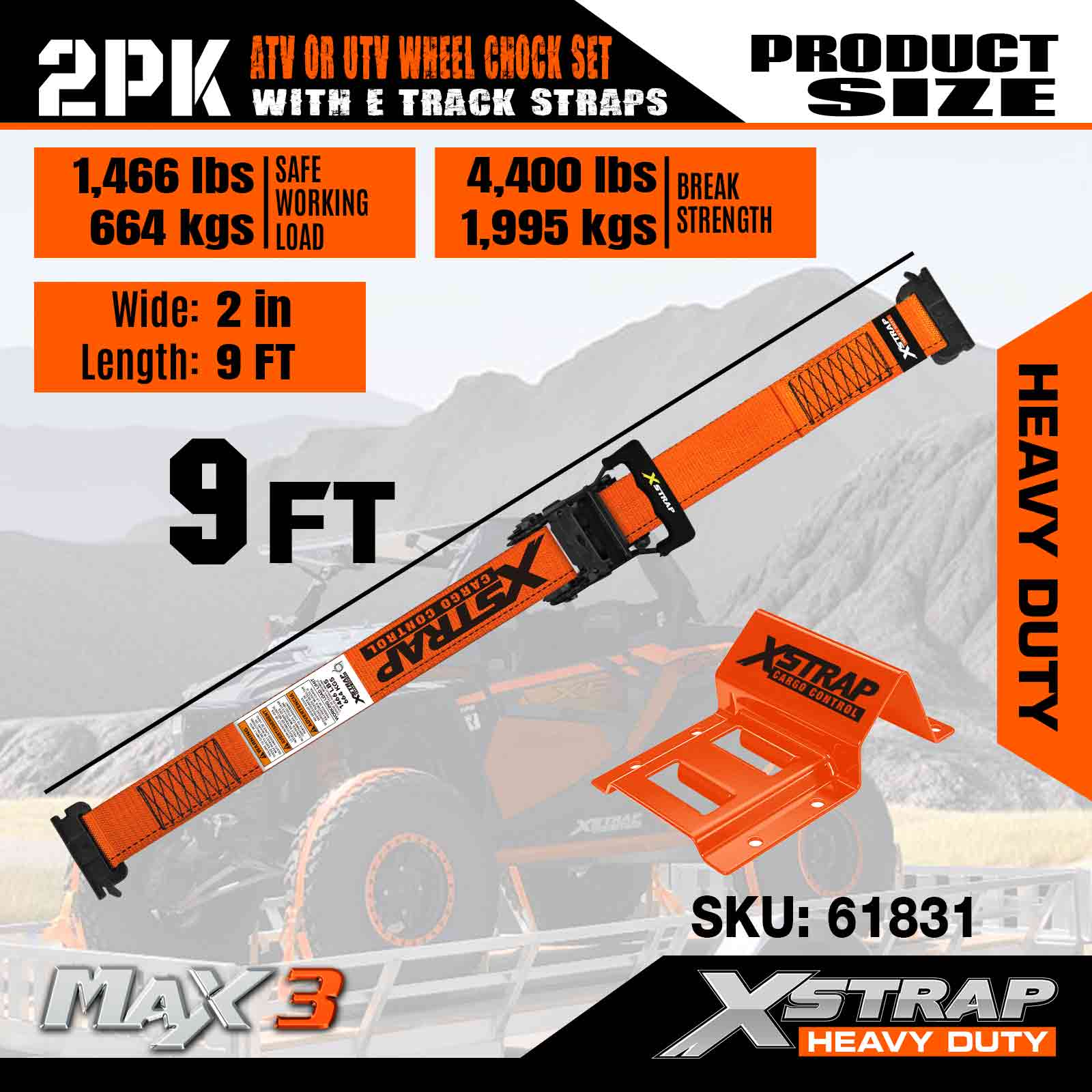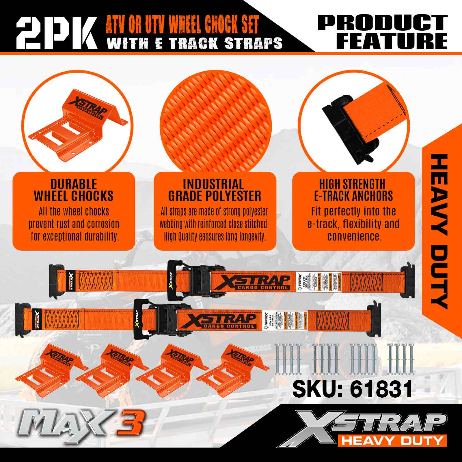 Xstrap UTV Roth Chock Ceangail Síos Kit 4,400lb Neart Briseadh (4) Leantóir Dualgas Trom Strapaí Ratchet mBonn (8) Chocks Rothaí - Córas Rian E le haghaidh ATV, UTV, lomaire faiche Ceithre Roth - Oráiste