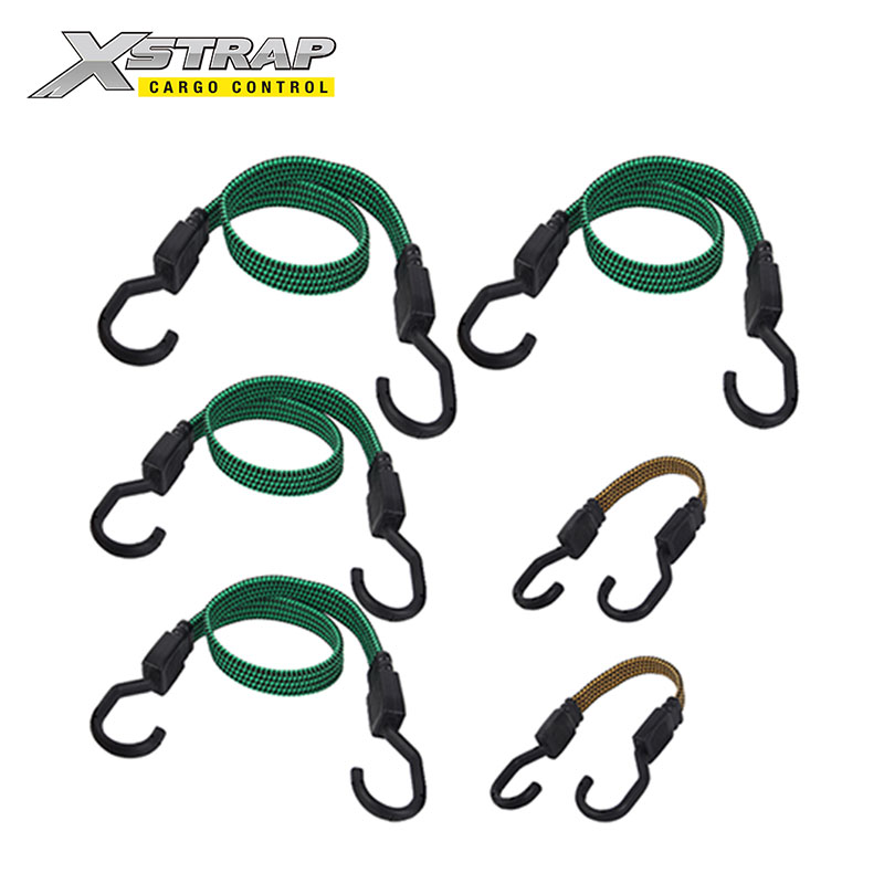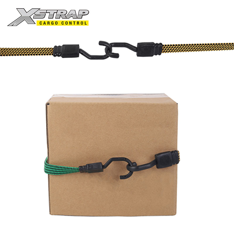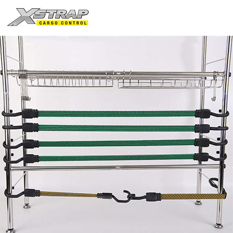 Is é seo ár cordaí bungee cothrom le crúcaí. Úsáidtear cordaí bungee comhréidh tromshaothair le crúcaí le haghaidh campála, díon raca, leantóir agus rialú lasta.
