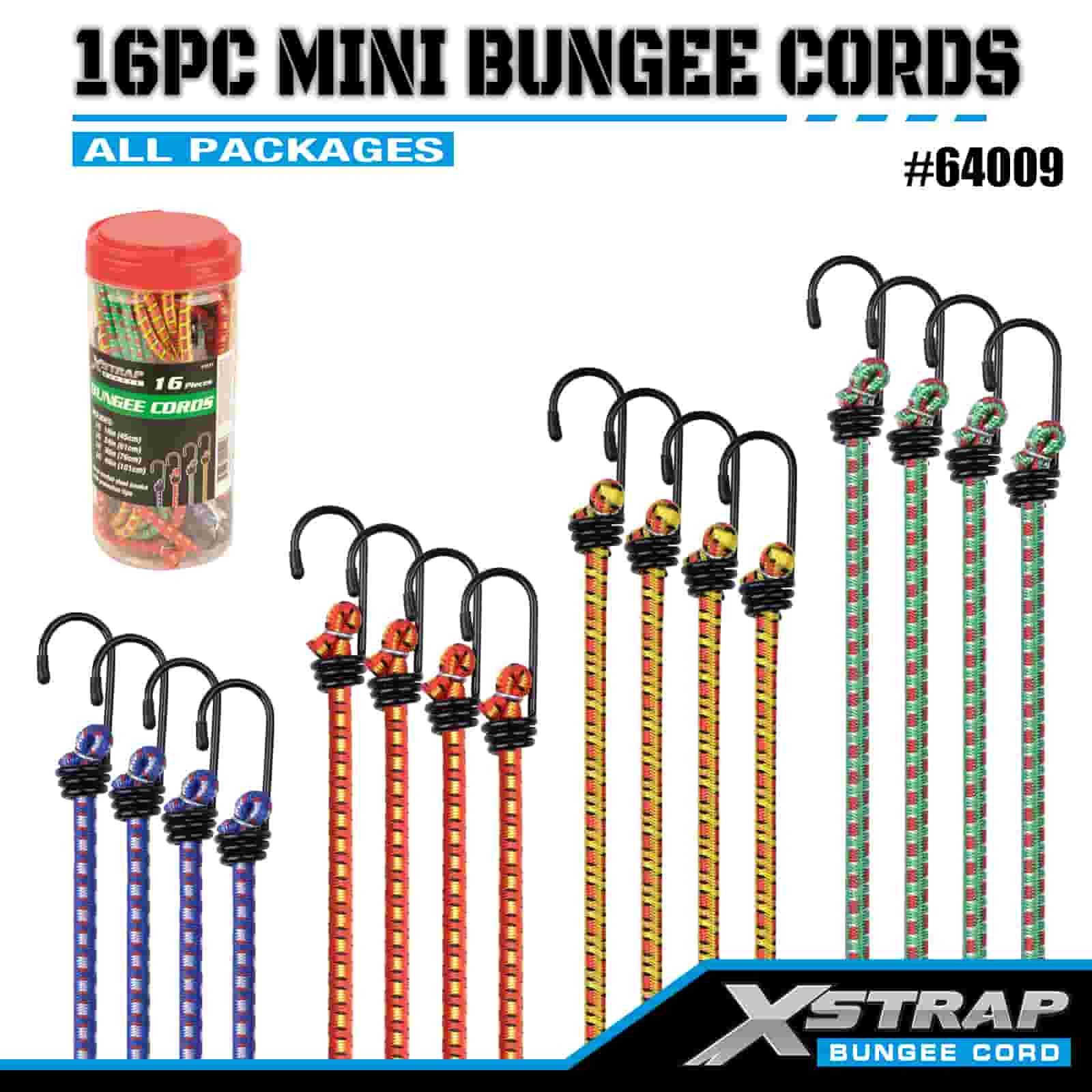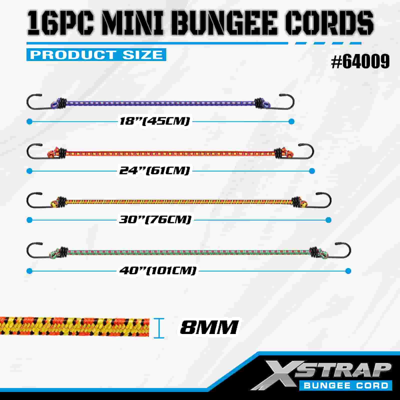Cordaí Bungee Xstrap 16PK 8mm x 18"/24" /30"/ 40", neart briste 44-55 punt le crúcaí cruach le leideanna cosanta agus crúcaí caighdeánacha earraigh.
