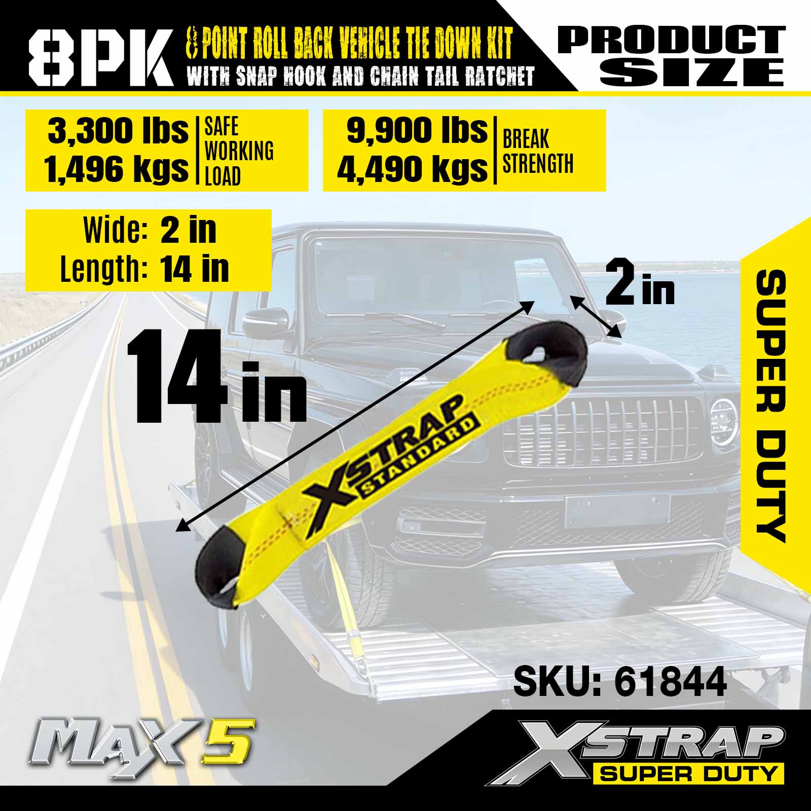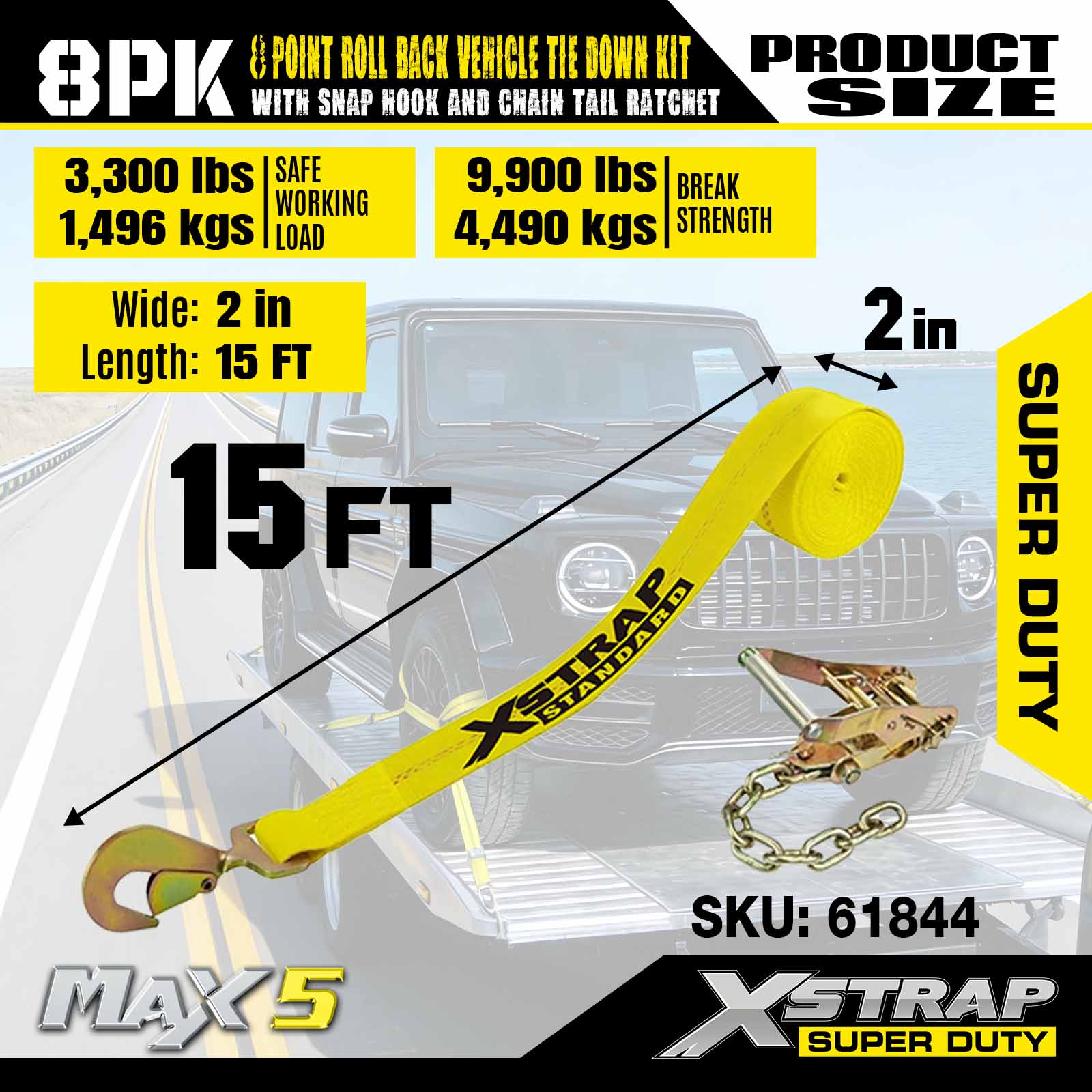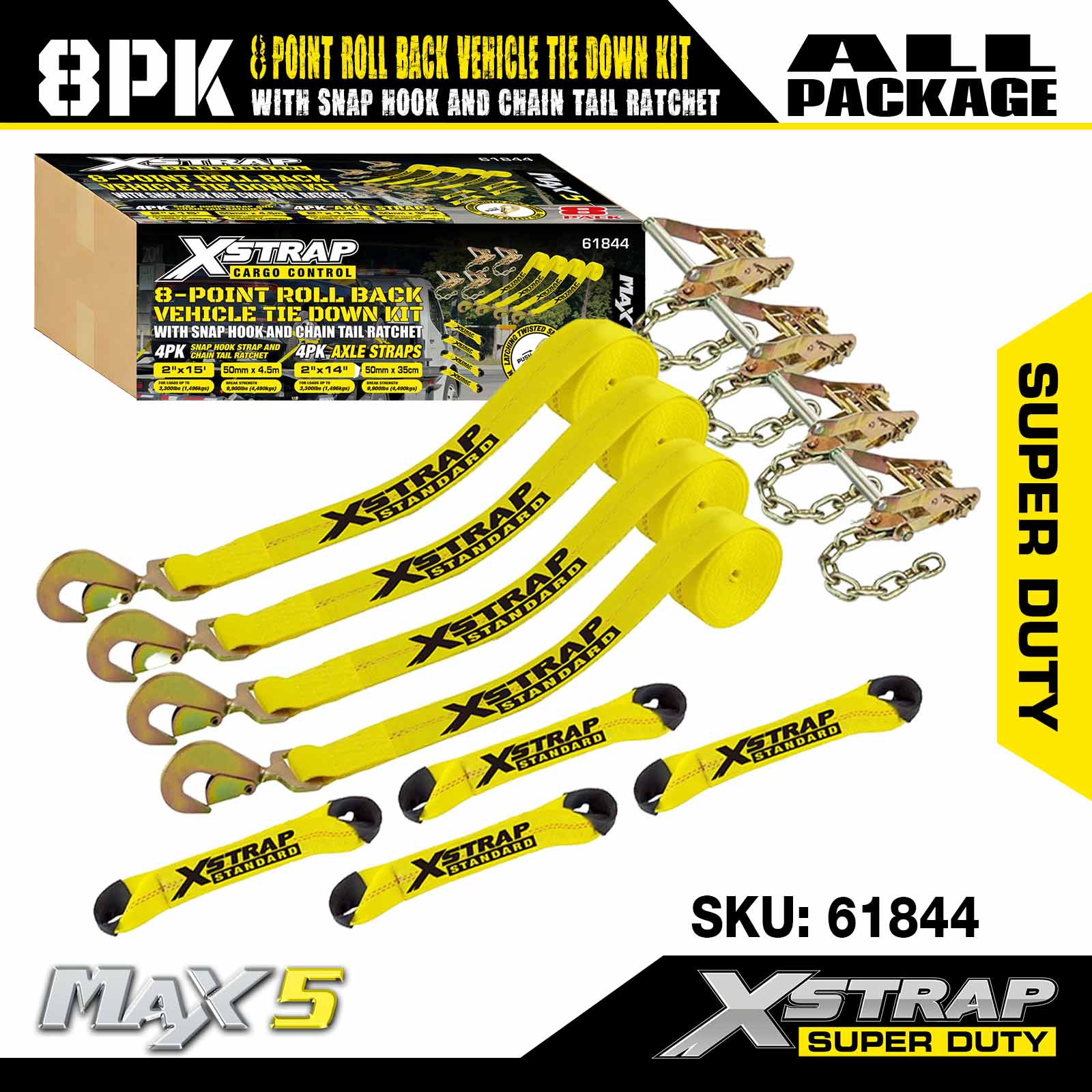 Trealamh Ceangail Feithicle Síos Rollta Ais Xstrap 8-Point le Hooks Snap agus Ratchet Eireaball Slabhra ar an dá cheann - Sraith de 4 - Buí Clasaiceach