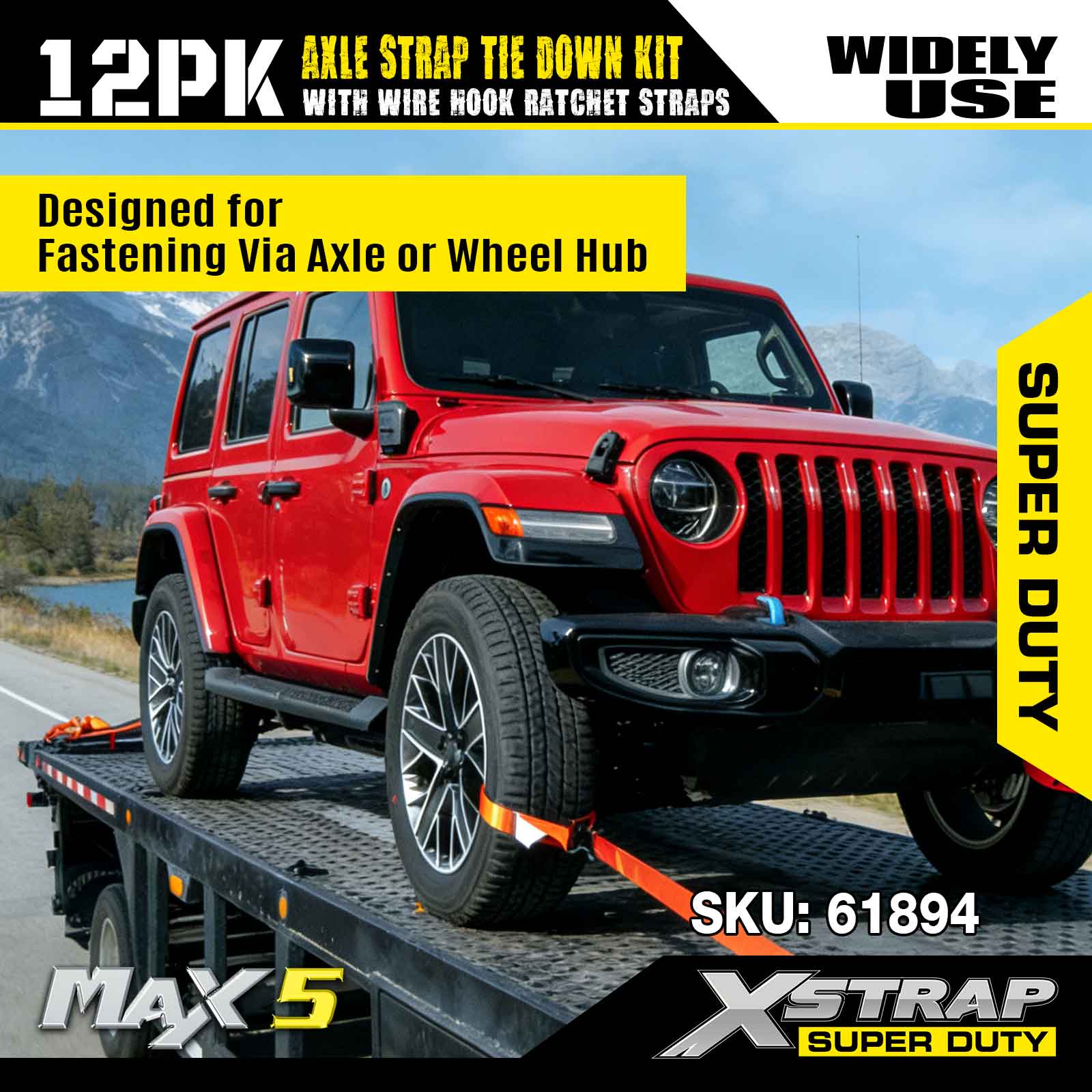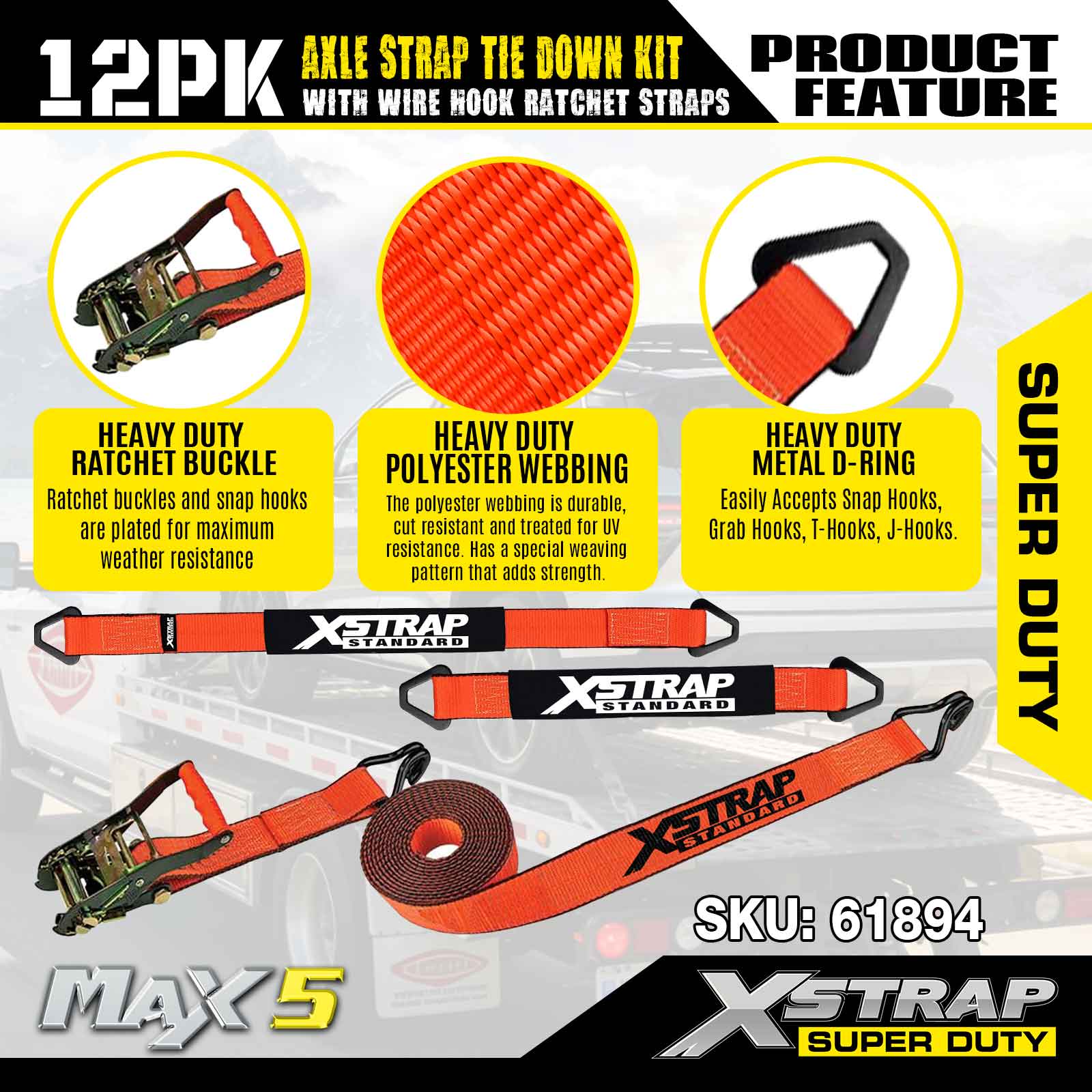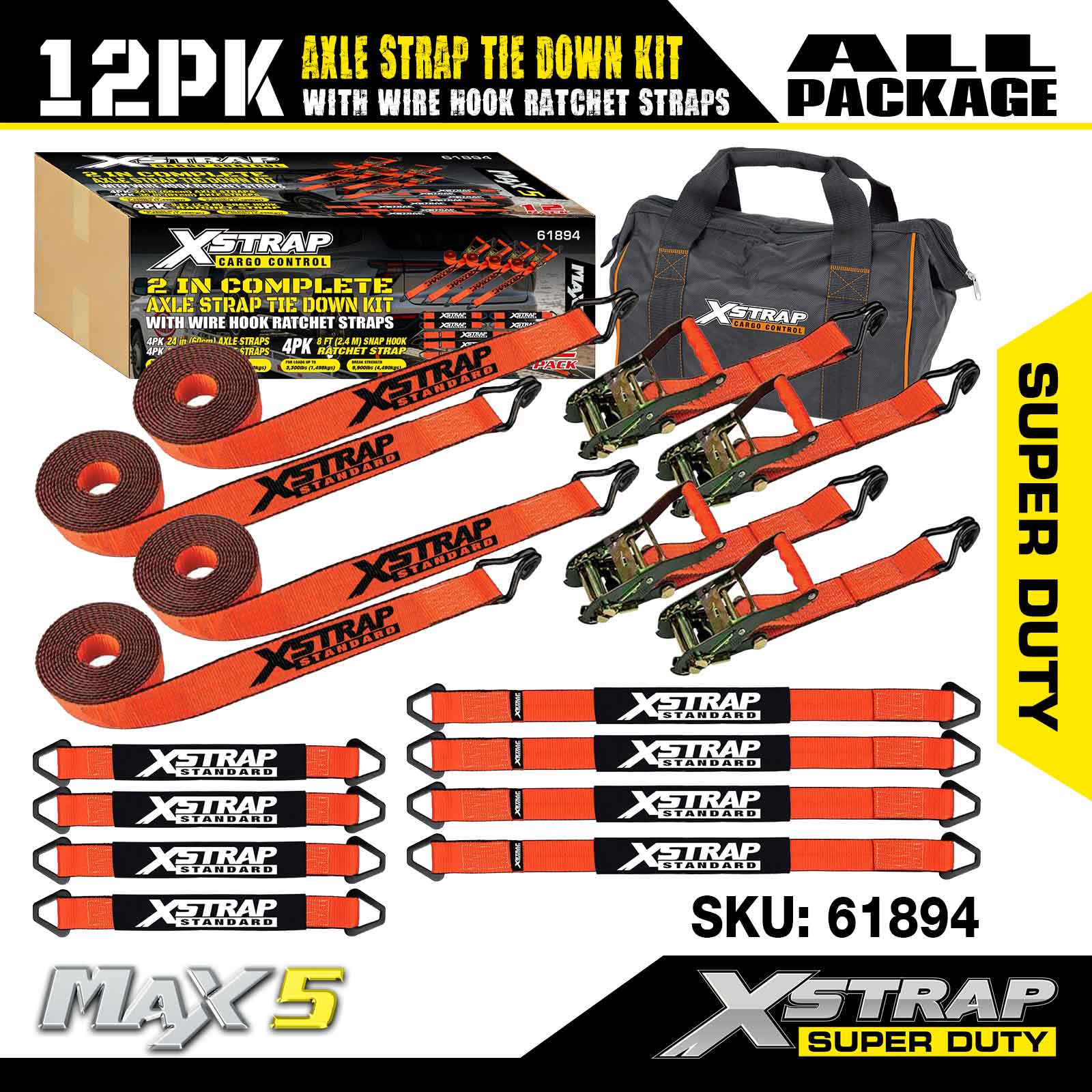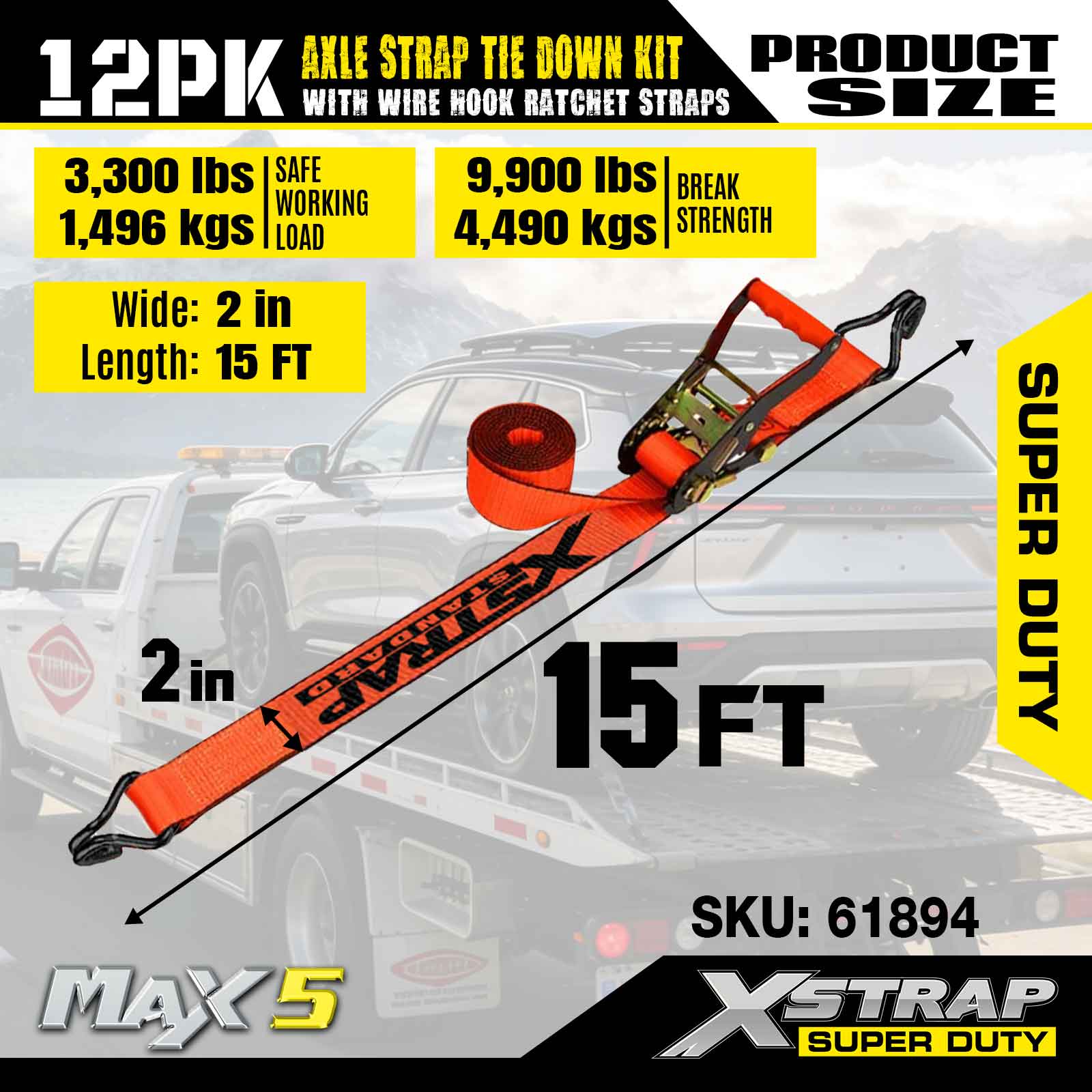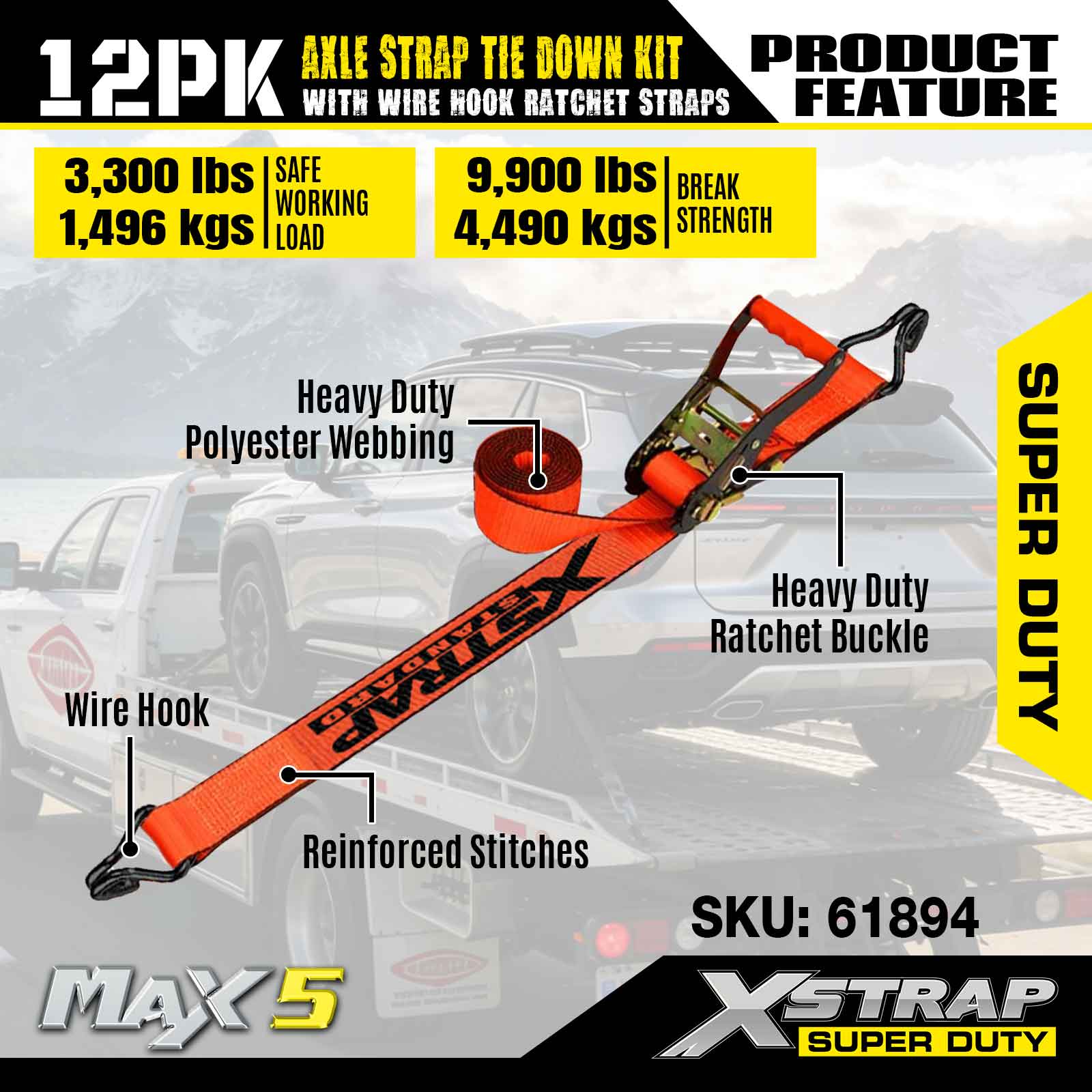 Kit Ceangail Síos Strap Acastóra Xstrap 12PK (le Strapaí Ratchet Hook Wire) - Super Duty. Tá ualach oibre sábháilte aige de 3,300LBS (1,496KGs) agus neart briseadh de 9,900LBS (4,490KG).