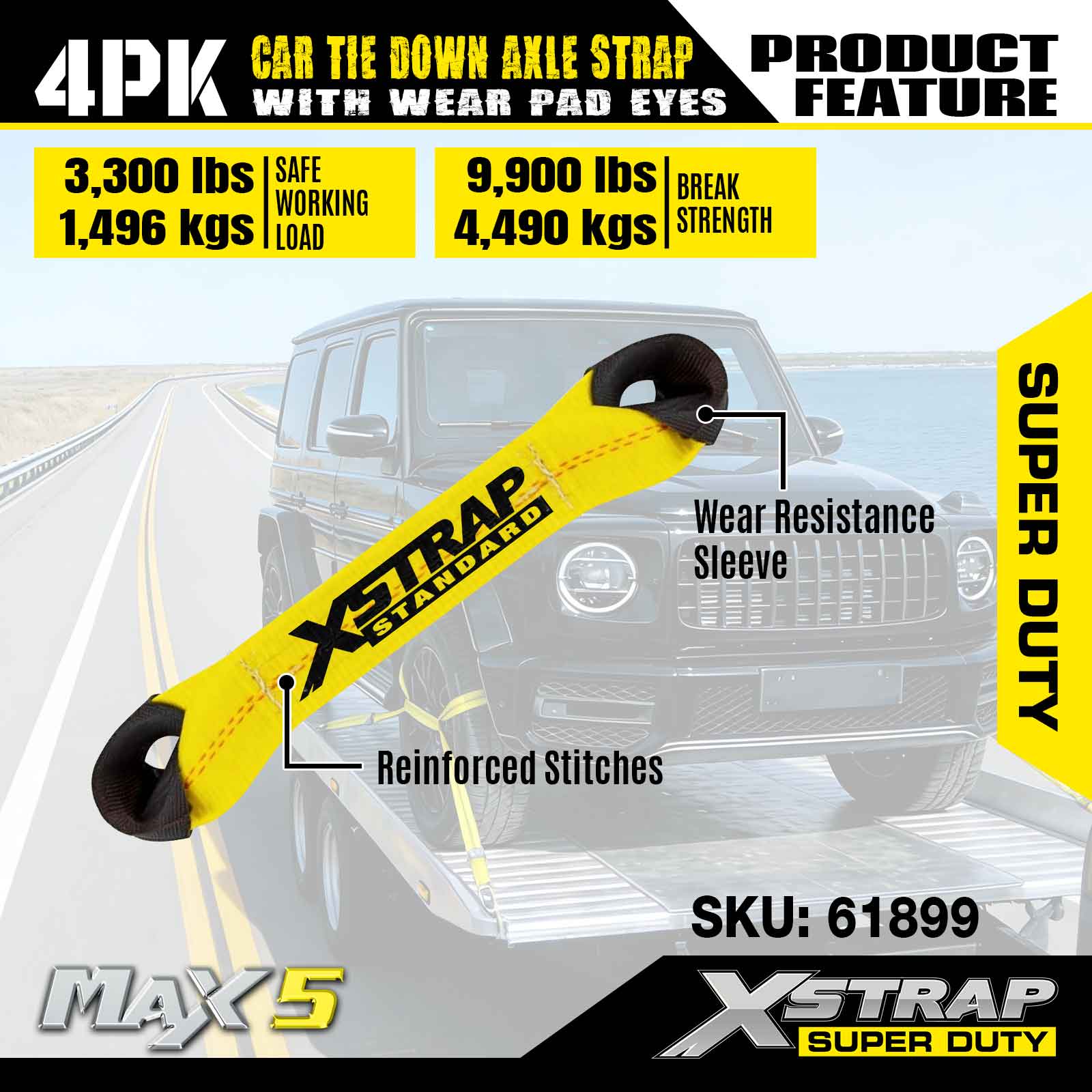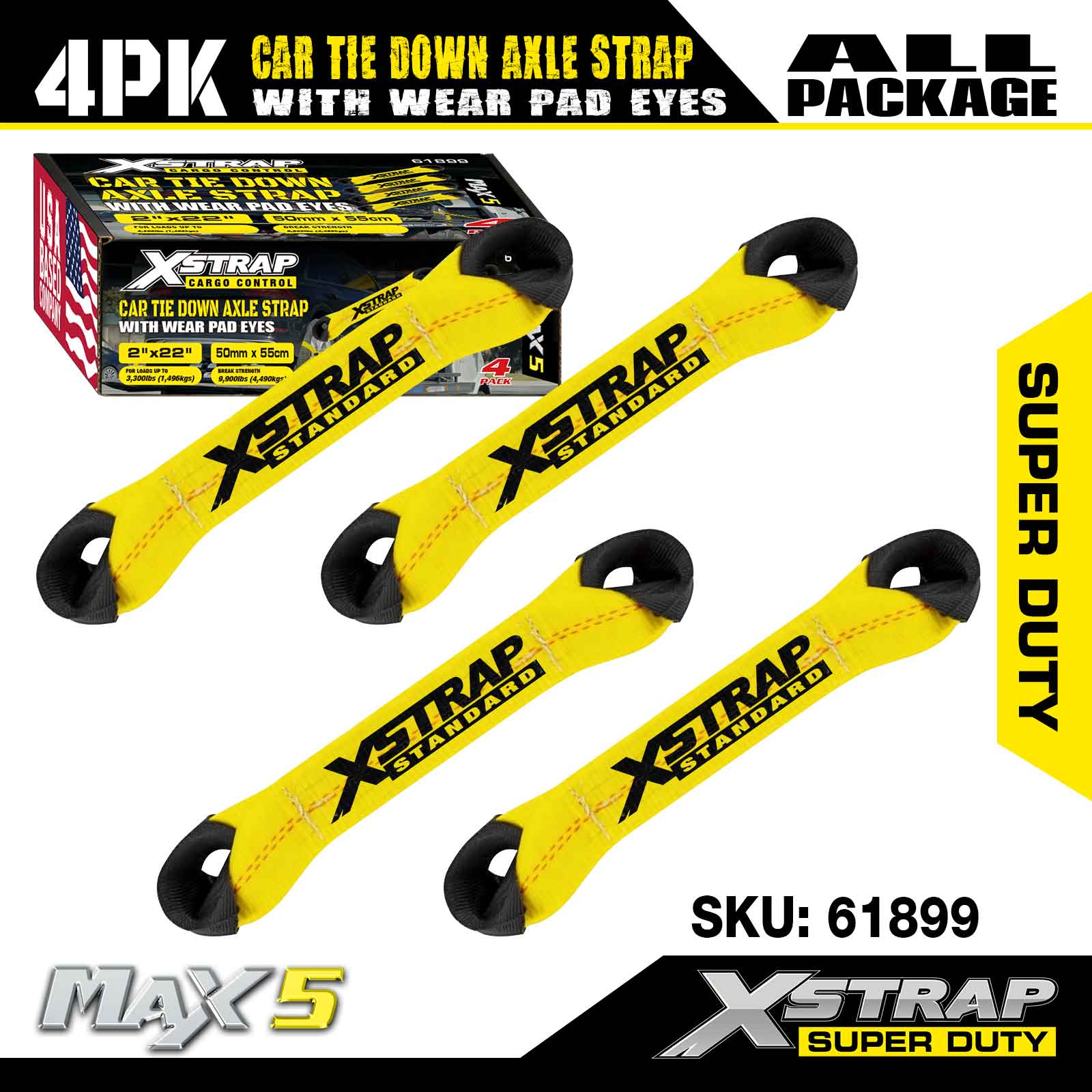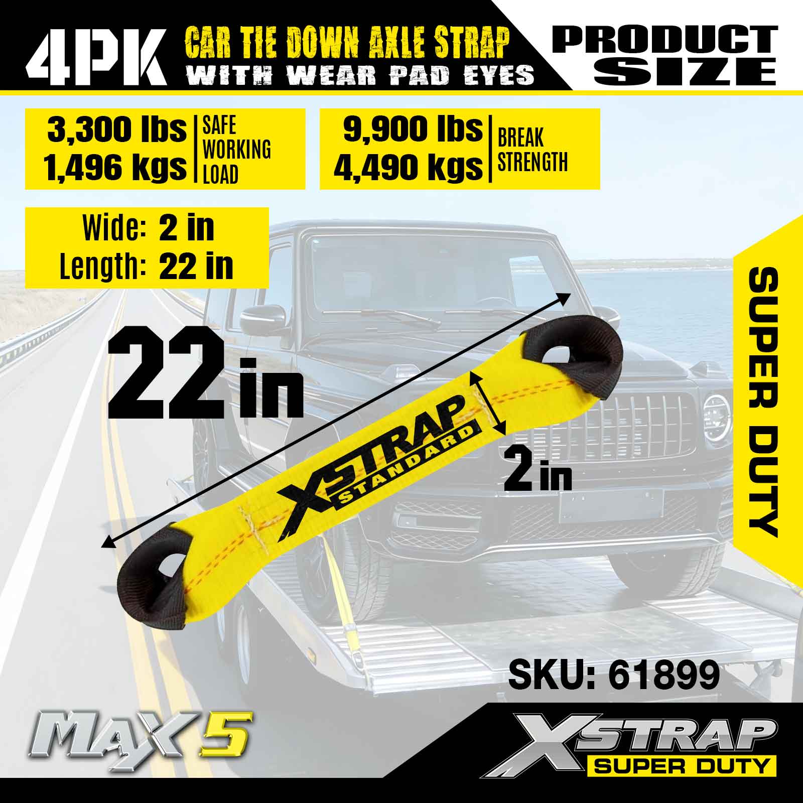Strap Acastóra Ceangail Car Xstrap 4PK (le Súile Caith Pad) - Sár-dhualgas. Tá ualach oibre sábháilte aige de 3,300LBS (1,496KGs) agus neart briseadh de 9,900LBS (4,490KG).