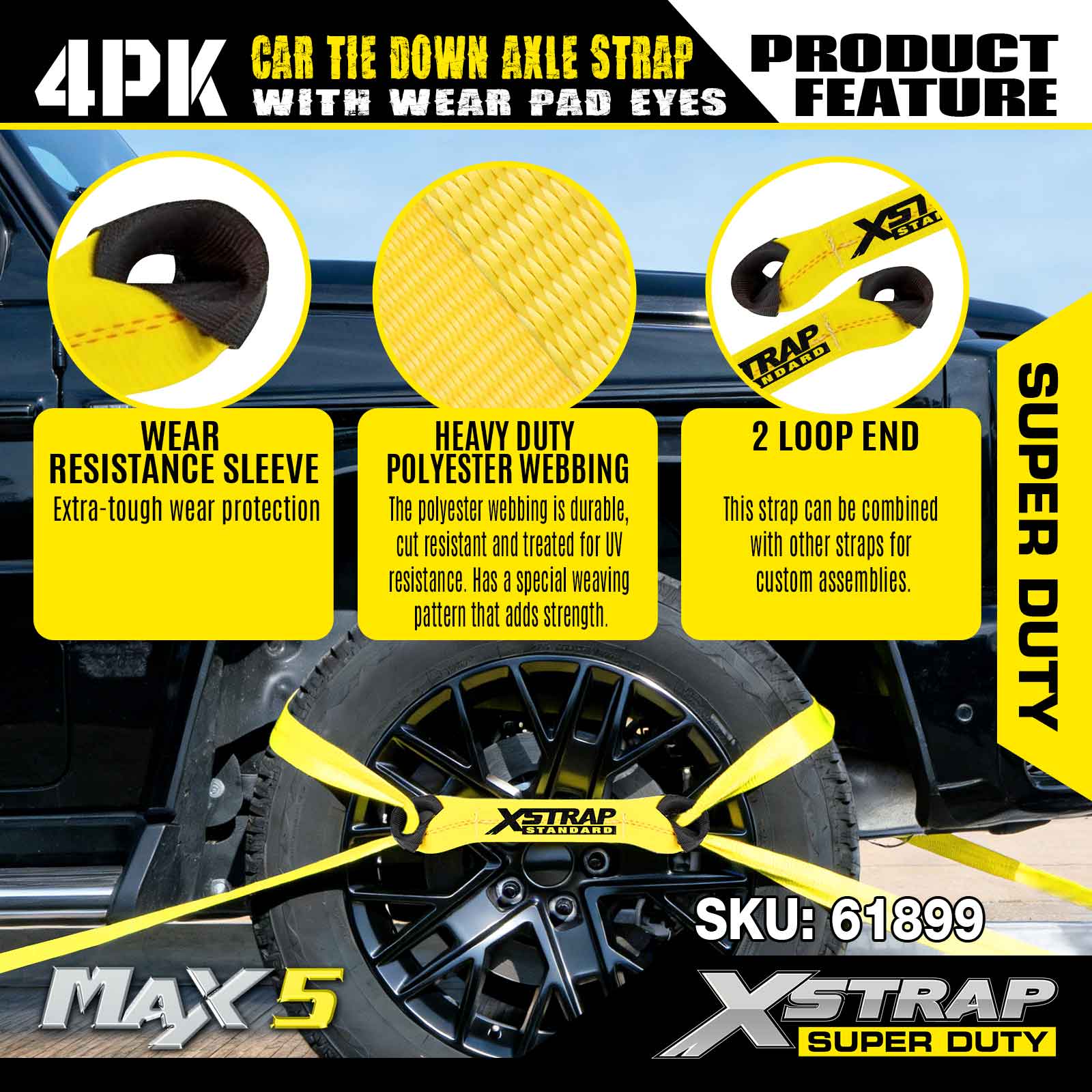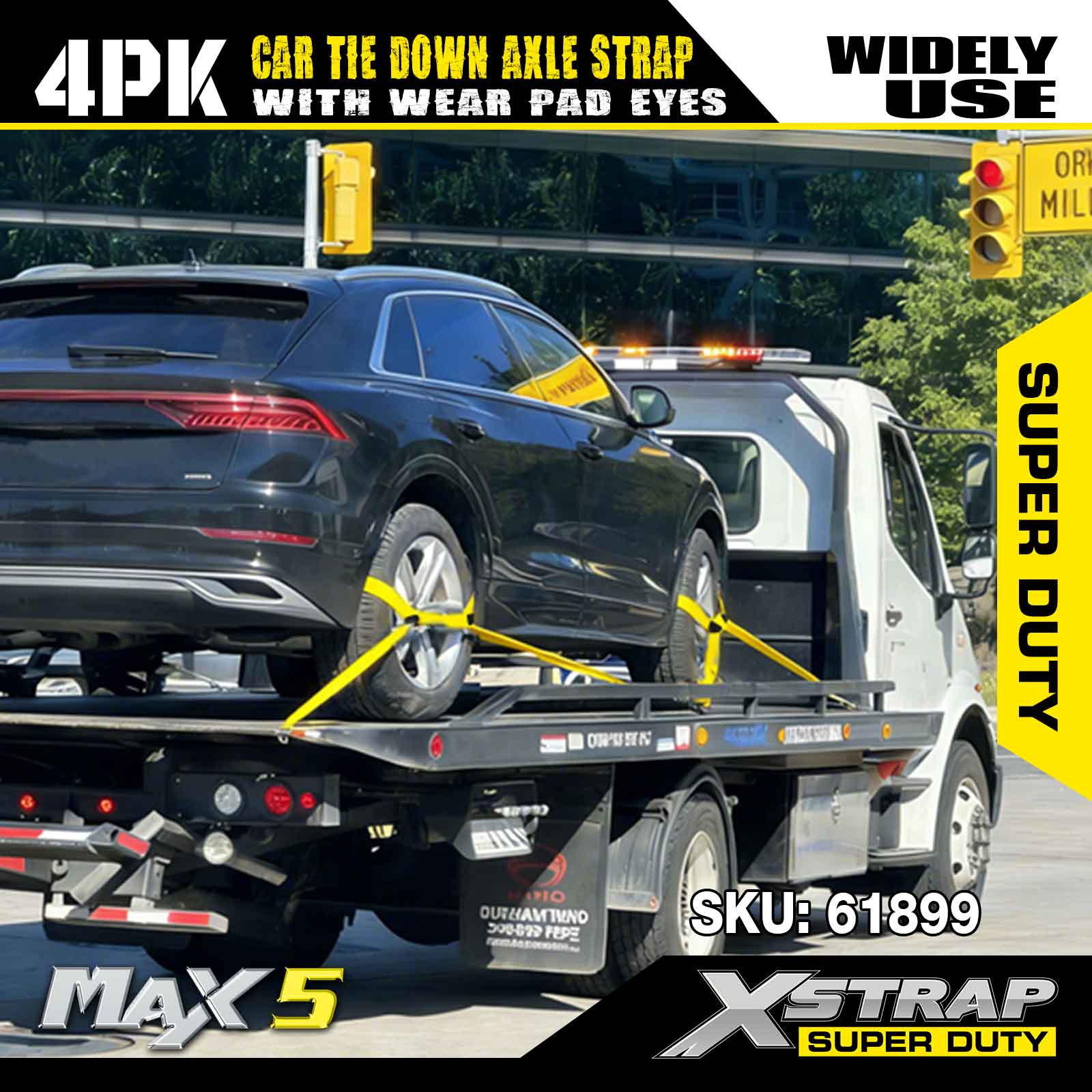- Soláthraíonn an sraith 4-phíosa clúdach iomlán chun feithicil amháin a dhaingniú (strap amháin in aghaidh an rotha/acastóra), rud a chuireann deireadh leis an ngá atá le ceannach ar leithligh. Leis an dearadh dlúth, in-chruachánach agus an pacáistiú atá réidh le haghaidh miondíola, éascaítear stóráil agus iompar, bíodh sé in urrann trucail tarraingthe nó garáiste.