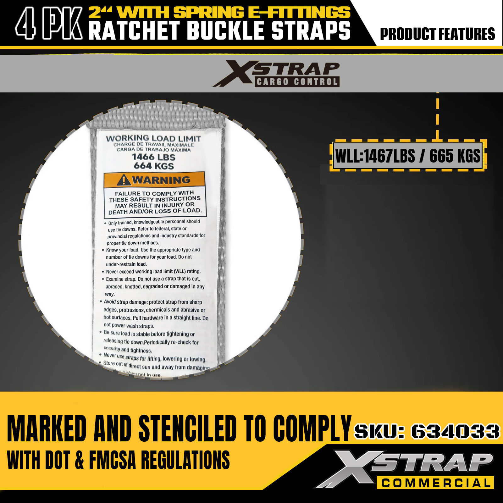 - Neart Briseadh 1467LBS SWL & 4401LBS Tá SWL ualach oibre sábháilte 1467 lbs agus uas-neart briseadh 4401 lb ag gach strap, ag cinntiú ualachiompartha láidir le haghaidh rialú lasta tromshaothair. Cuireann marcálacha soiléire sábháilteachta cosc ar ró-ualú agus cumasaíonn siad iompar slán trucailí, lomairí, ATVanna agus lasta ginearálta.