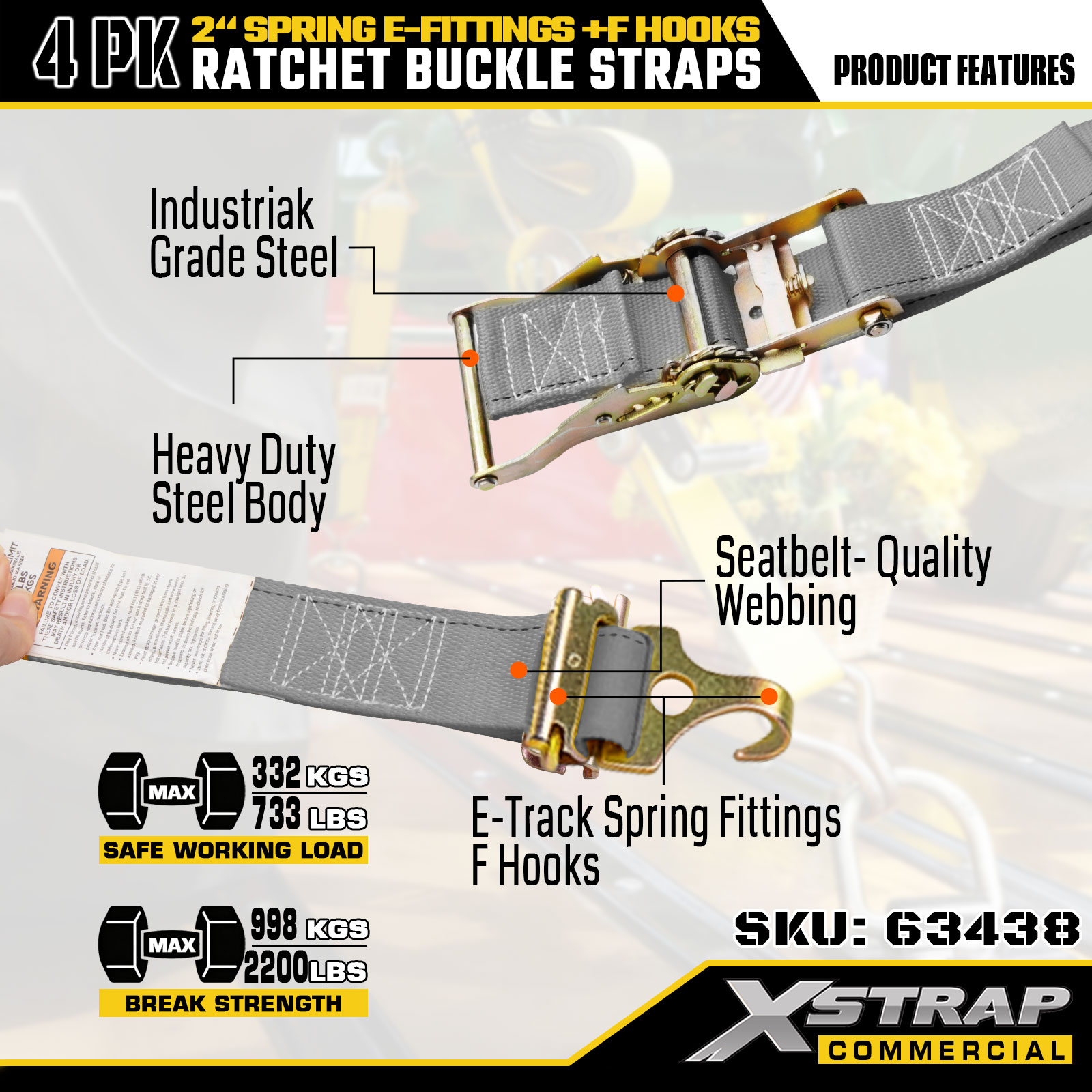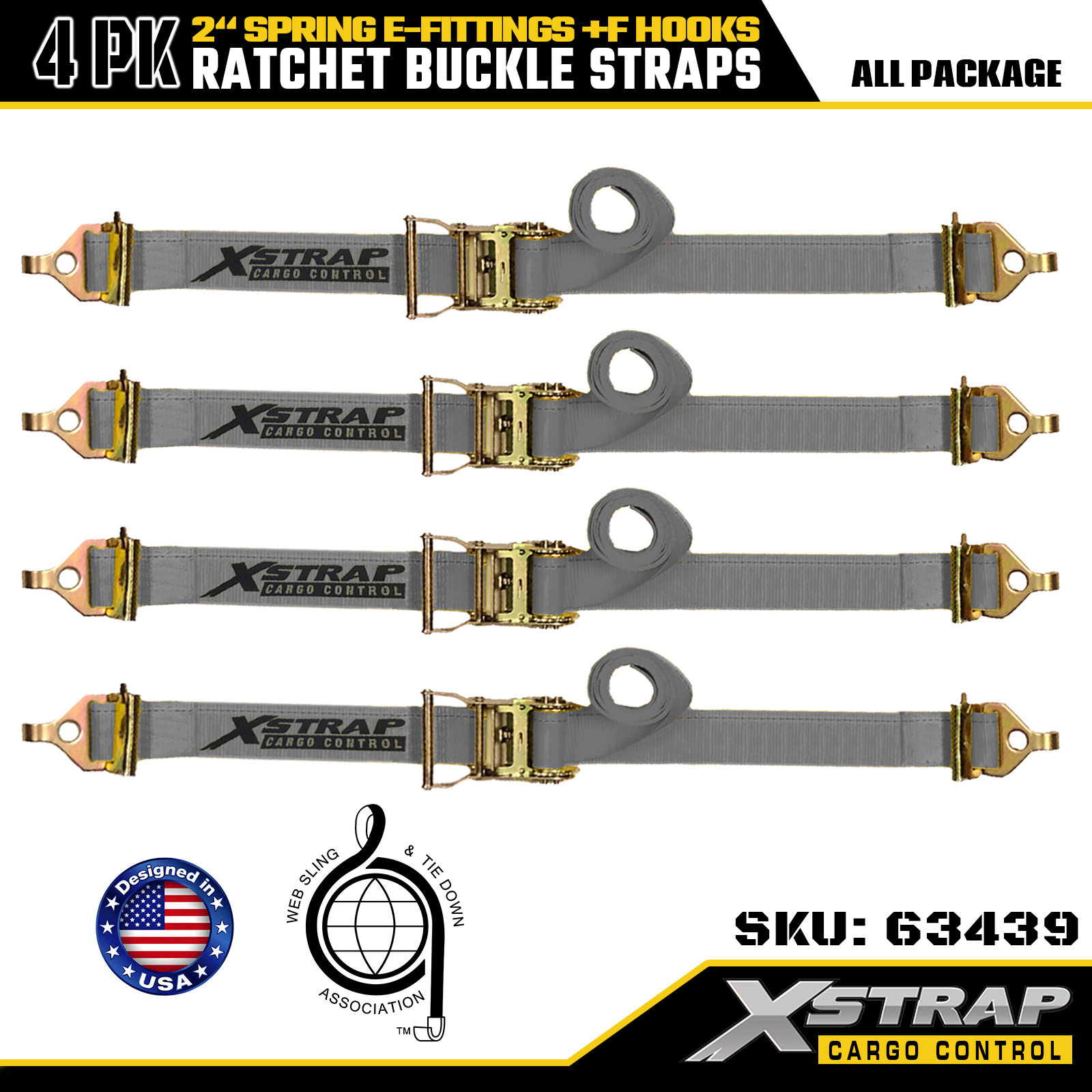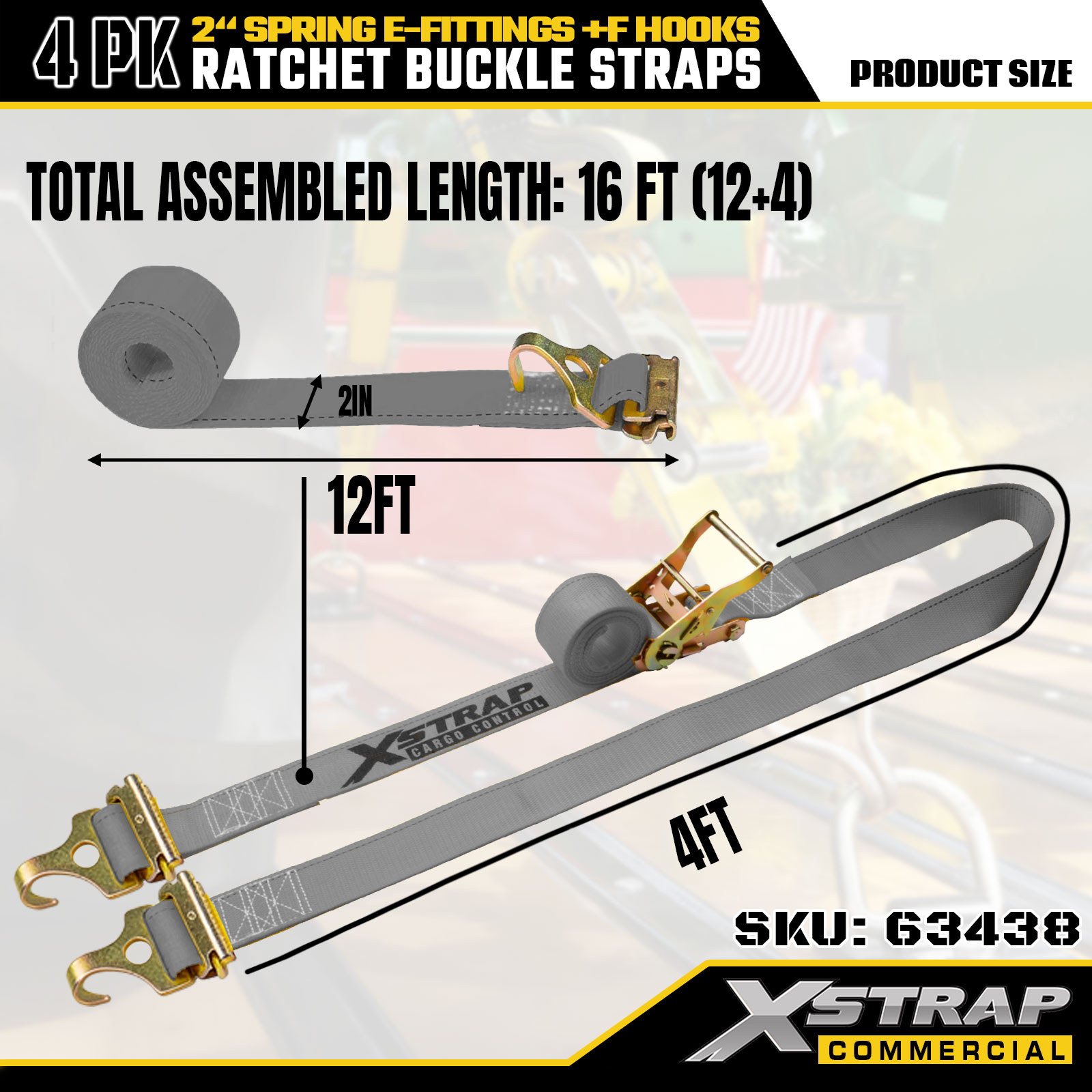 Pacáiste Xstrap 4 2" x 16' Strapaí Ceangail-Síos Ratchet - poileistir liath le E-Feistis Earraigh & Crúcaí F, 733 lb SWL le haghaidh Iompar Gluaisteán, Trucaile & Lastais Ginearálta