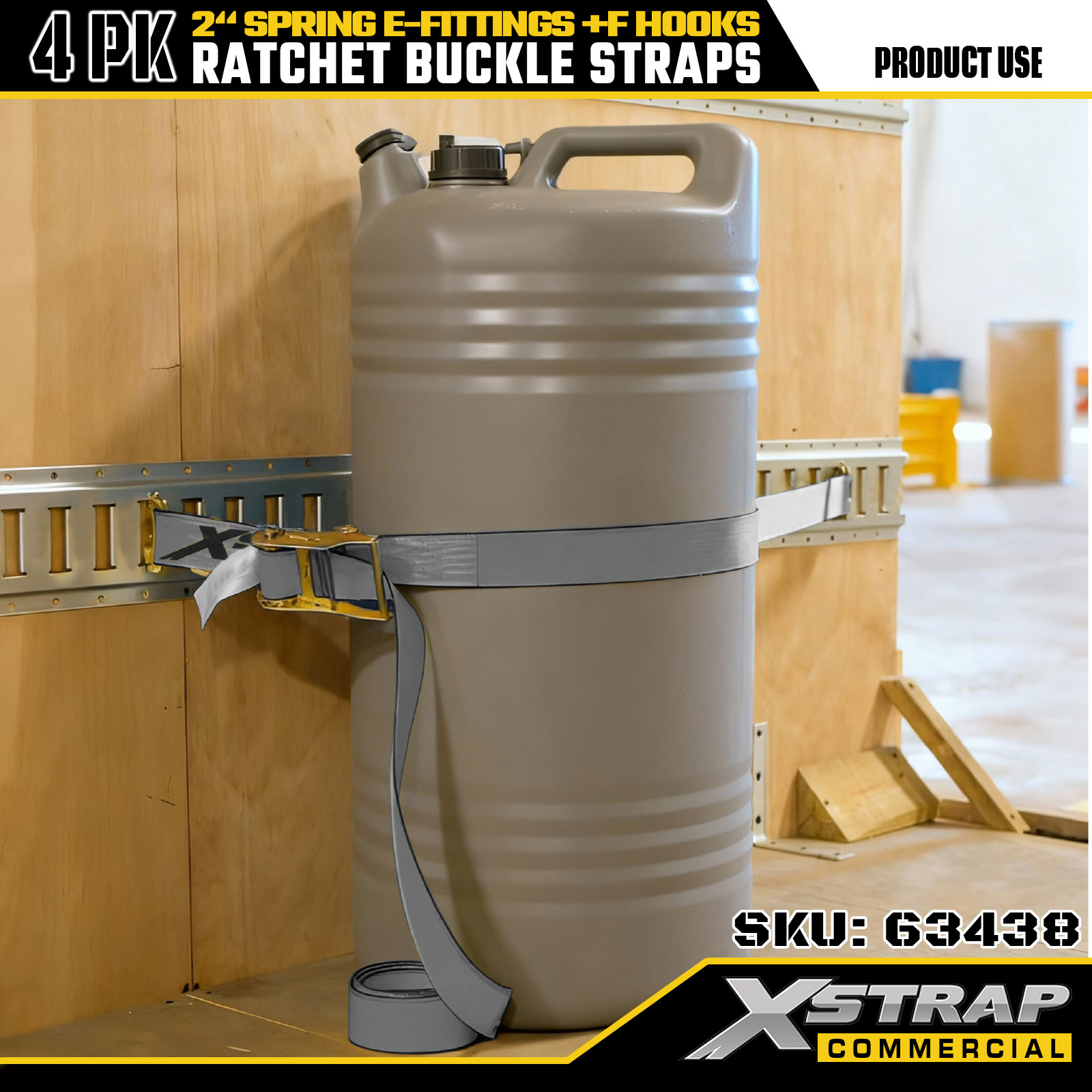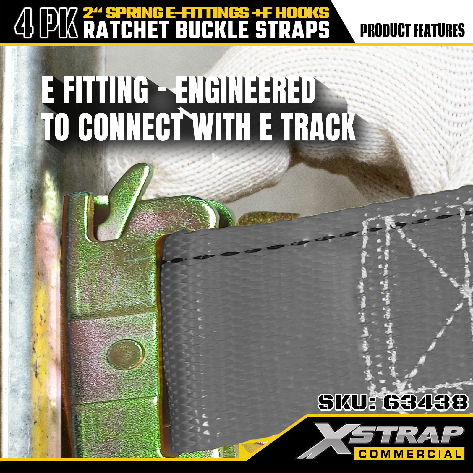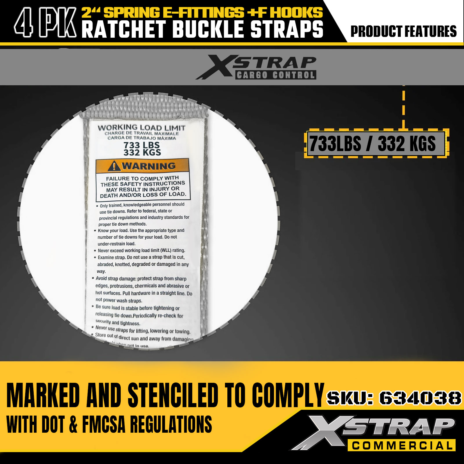 Pacáiste Xstrap 4 2" x 16' Strapaí Ceangail-Síos Ratchet - poileistir liath le E-Feistis Earraigh & Crúcaí F, 733 lb SWL le haghaidh Iompar Gluaisteán, Trucaile & Lastais Ginearálta