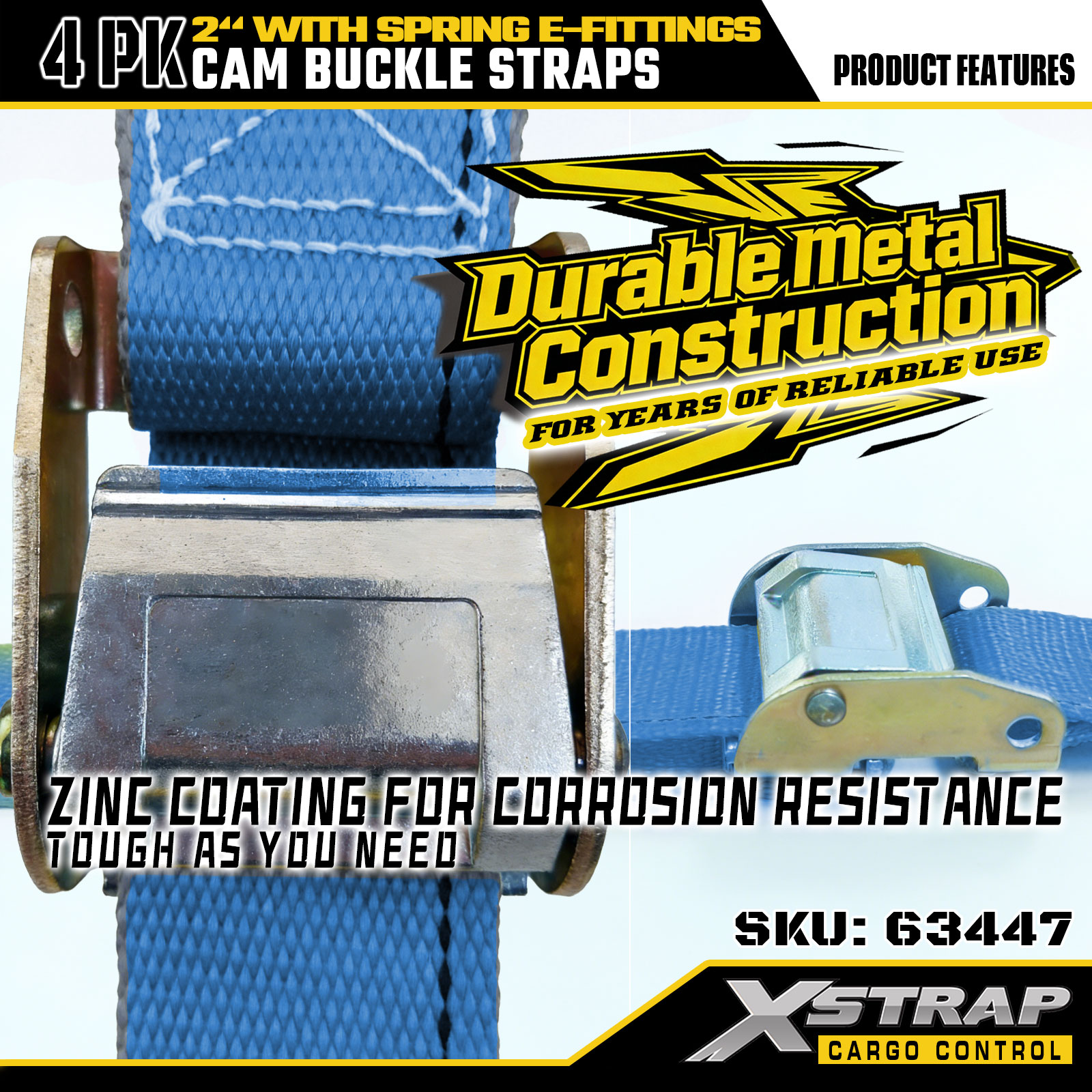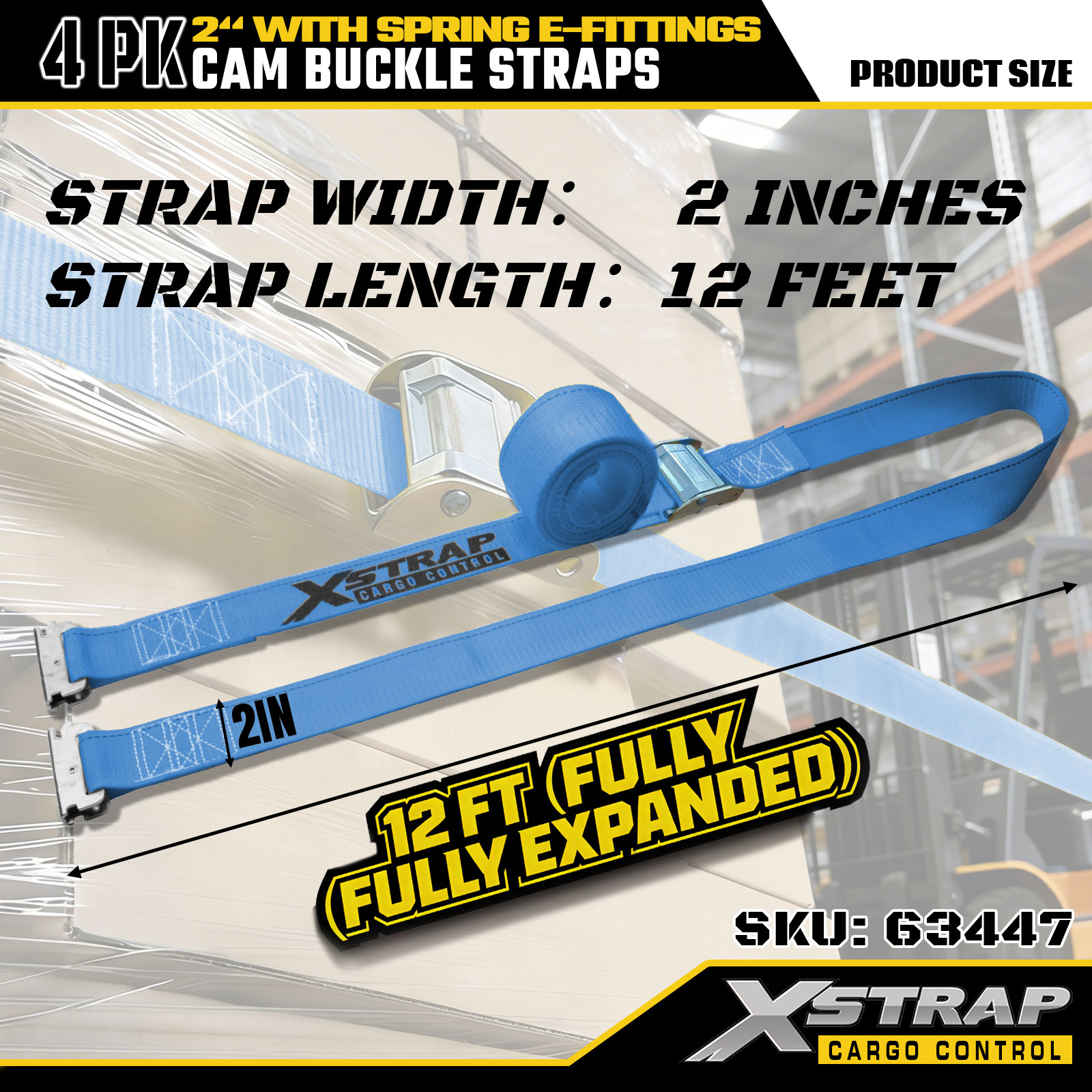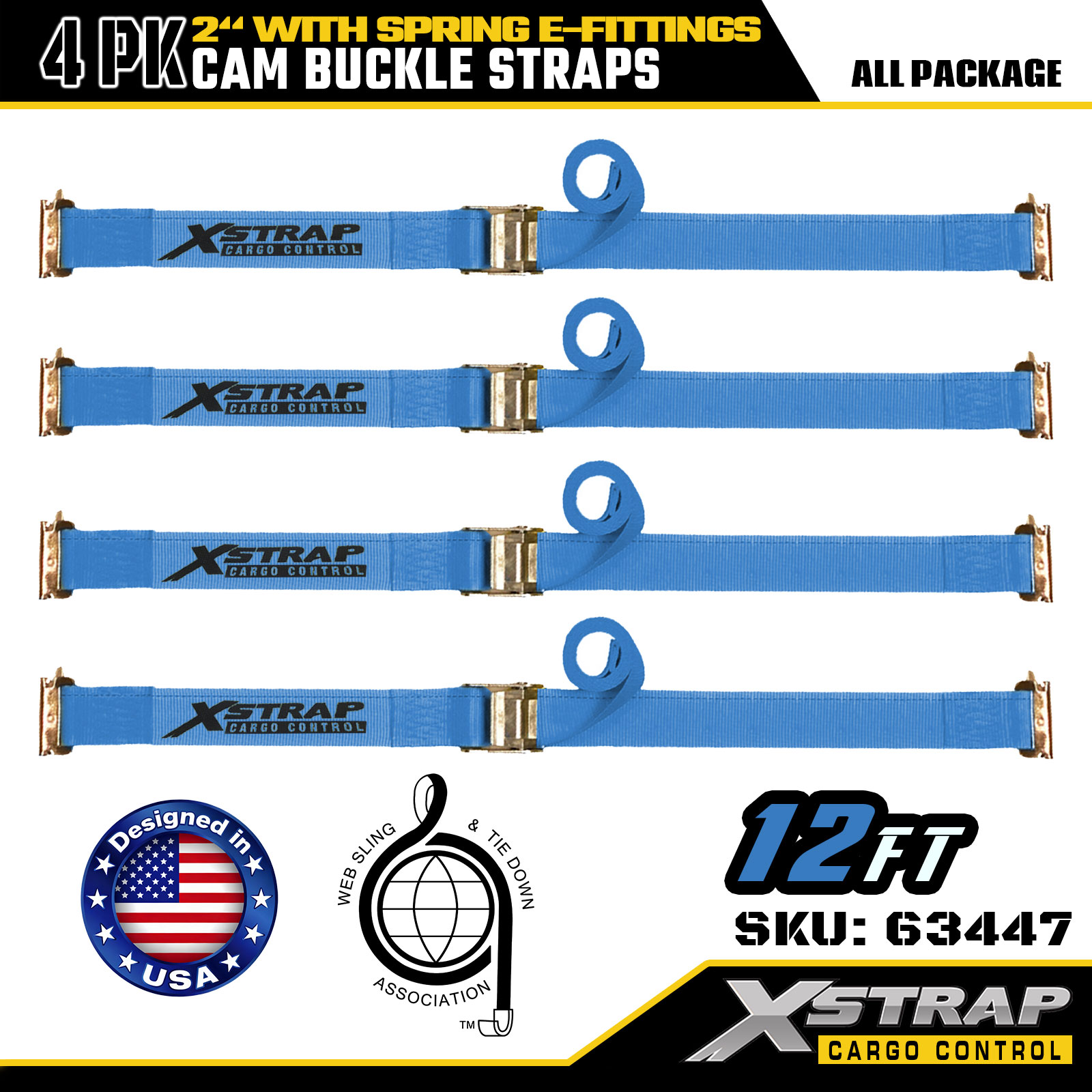 Xstrap 63447 4 Pacáiste Strapaí Raitse Gorm 2" x 12' le E-Feisteas Earraigh & Crúcaí F, 733 lb SWL & 332 lbs Neart Briseadh do Rialú lasta, Gluaiseacht & Iompar