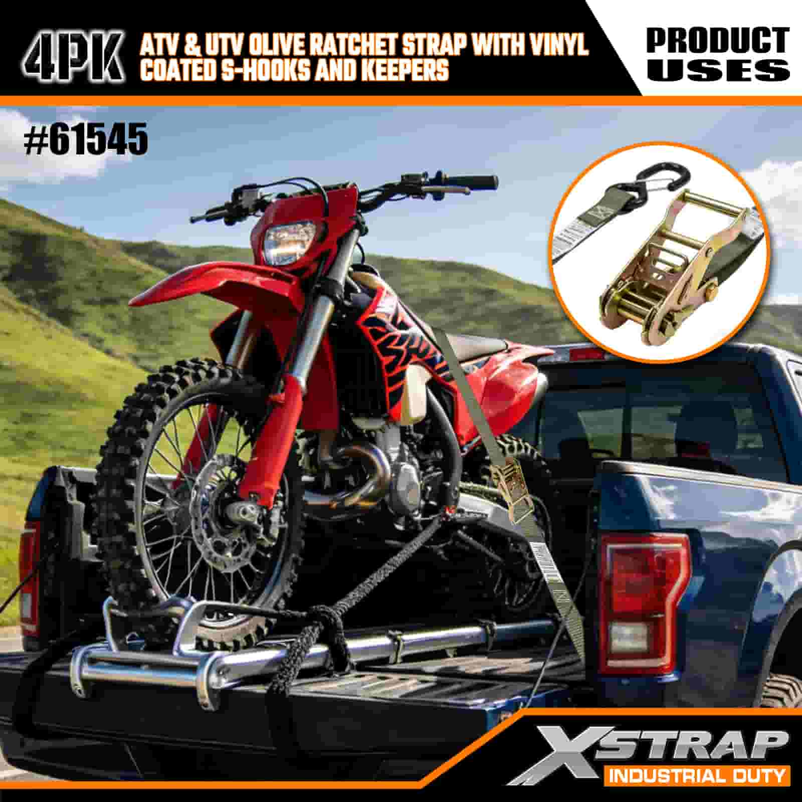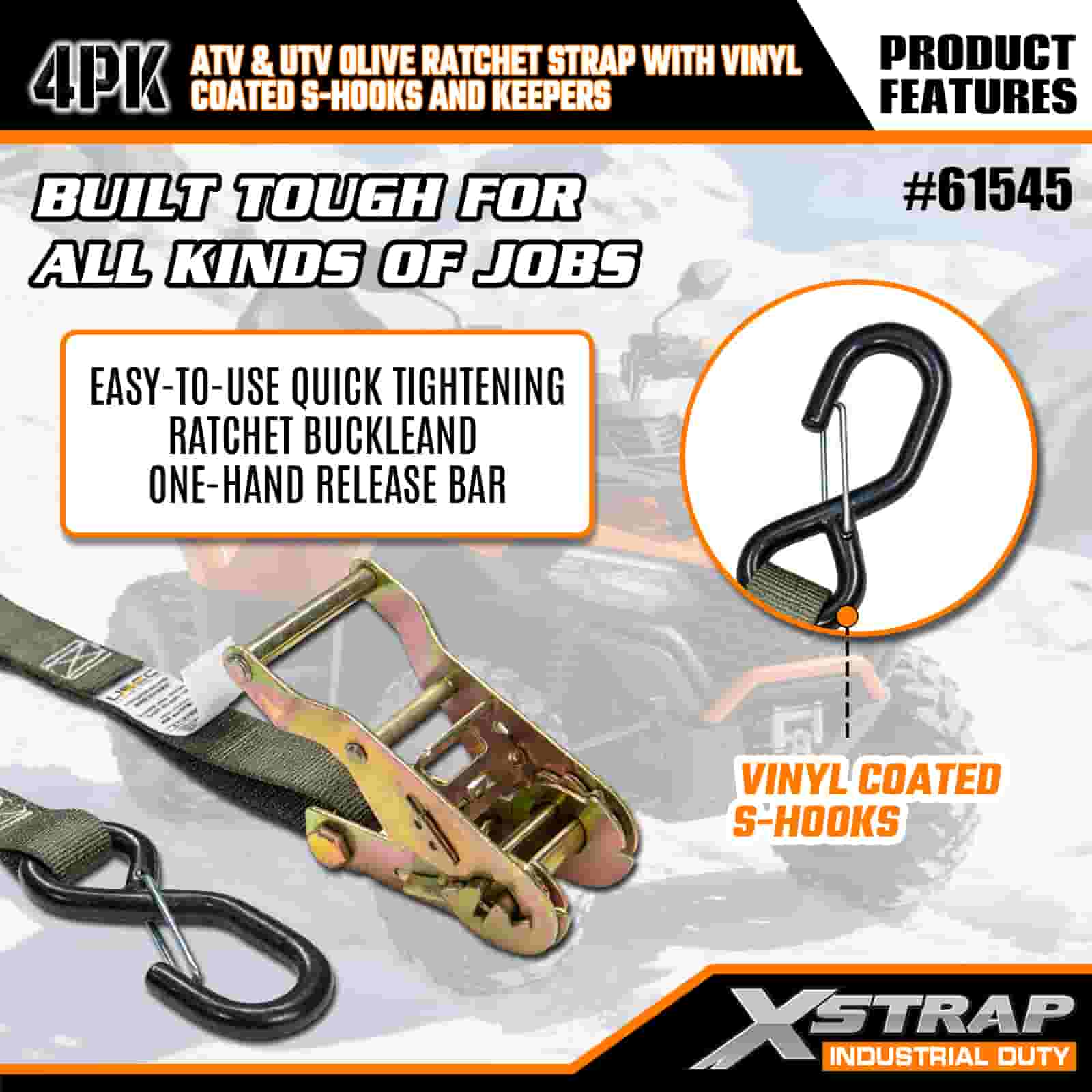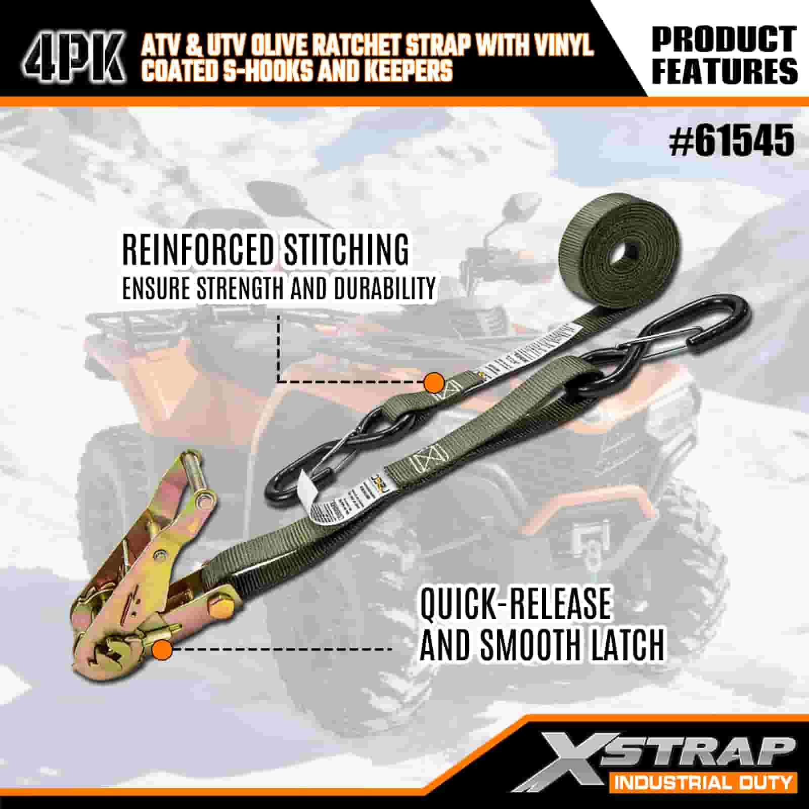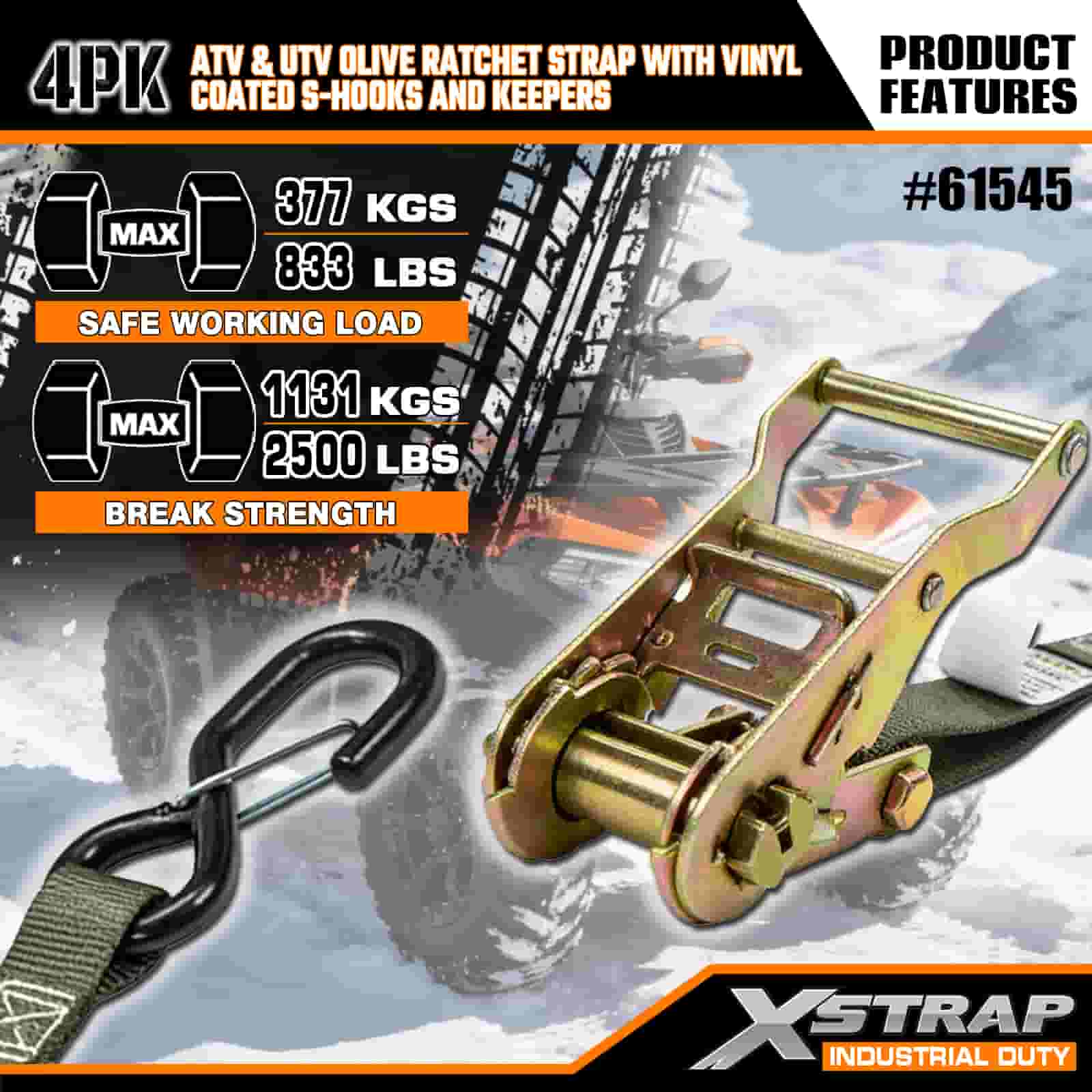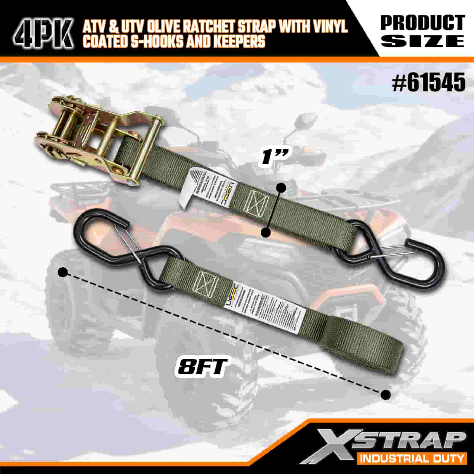 - 4 Pacáiste don Chlúdach Iomlán: Tá 4 strap sa tacar seo, rud a thugann go leor duit chun tosaigh agus ar chúl do ATV nó UTV a dhaingniú. Oireann an fad 8 troigh ar leapacha trucail, leantóirí, nó pointí ceangail, ionas gur féidir leat greim cobhsaí a fháil gach uair.