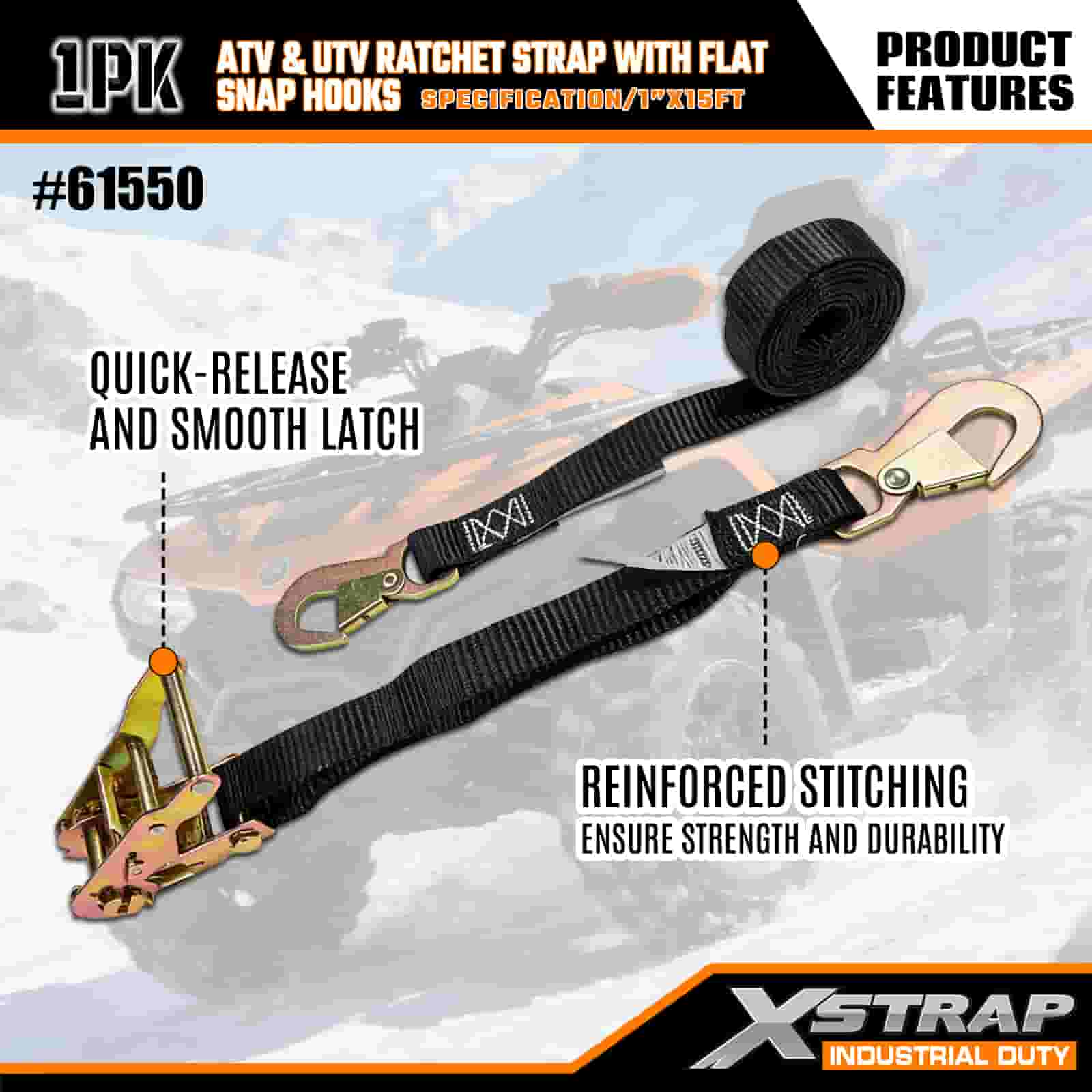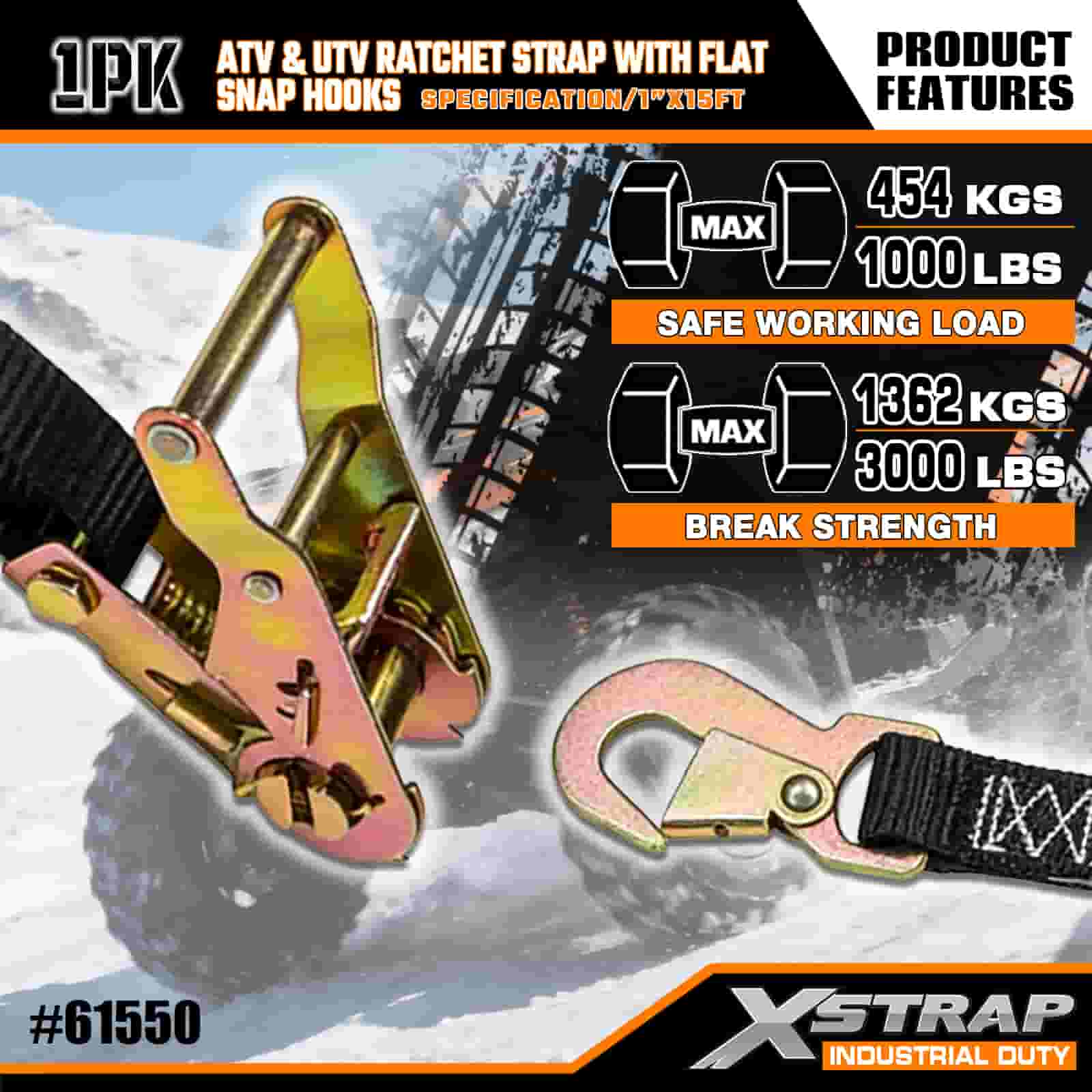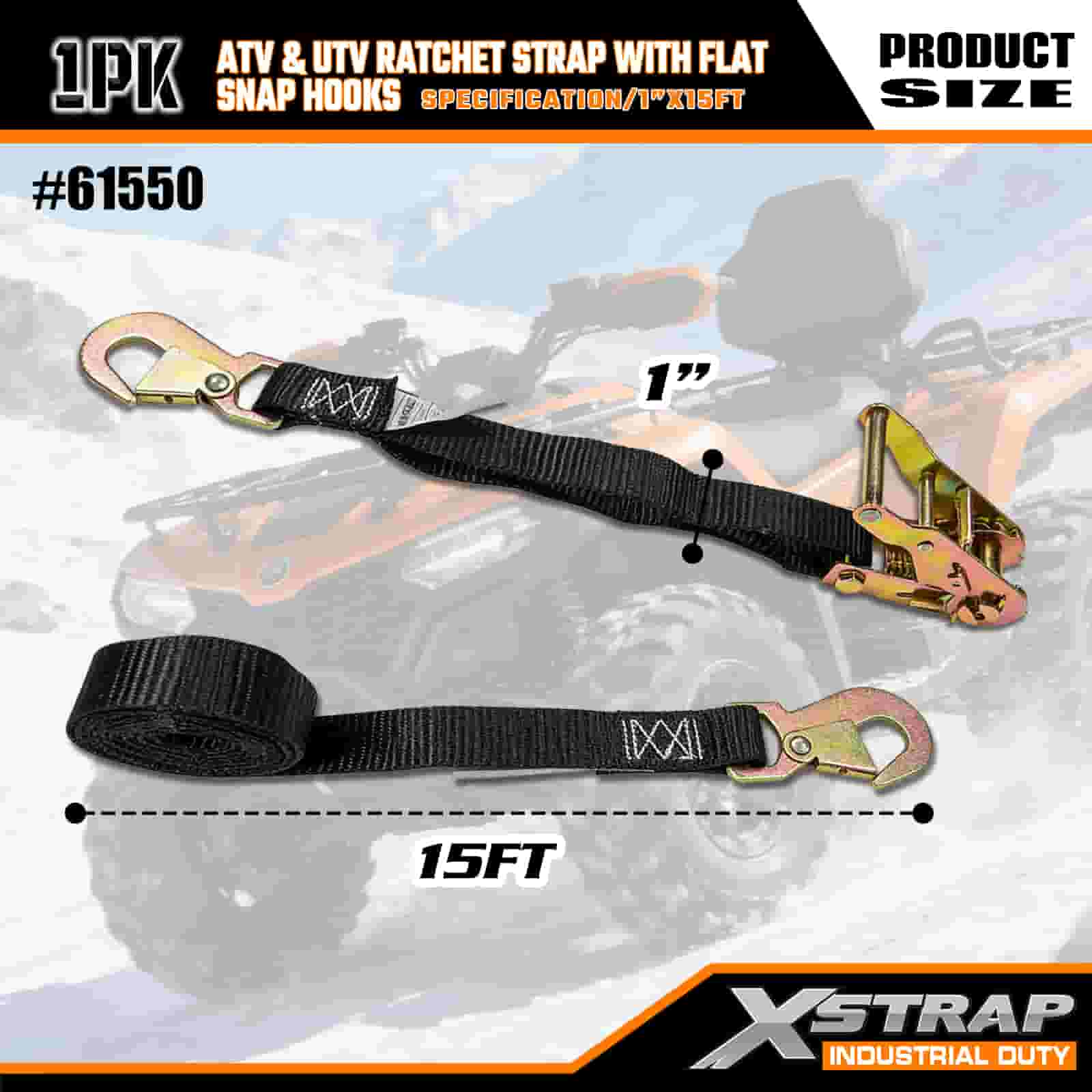 Strap Ratchet Xstrap ATV & AUV le Hooks Snap Maol, 1” x 15’ poileistir Ceangailte Strap Ratchet Strap, Toilleadh 1000 lbs Lashing Lasta Strapaí Daingnithe le Léim Maol do Leantóir, Leantóir Maol Bád sciála Leantóir, Carr Beag, Trealamh Trom.