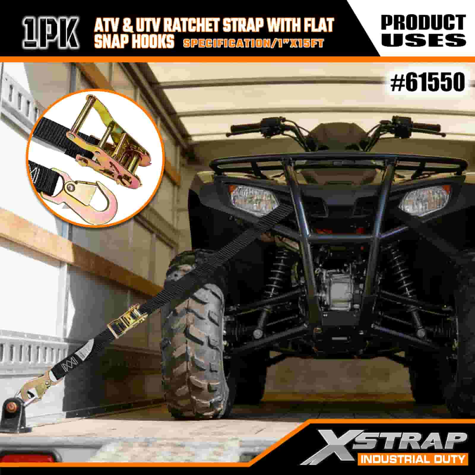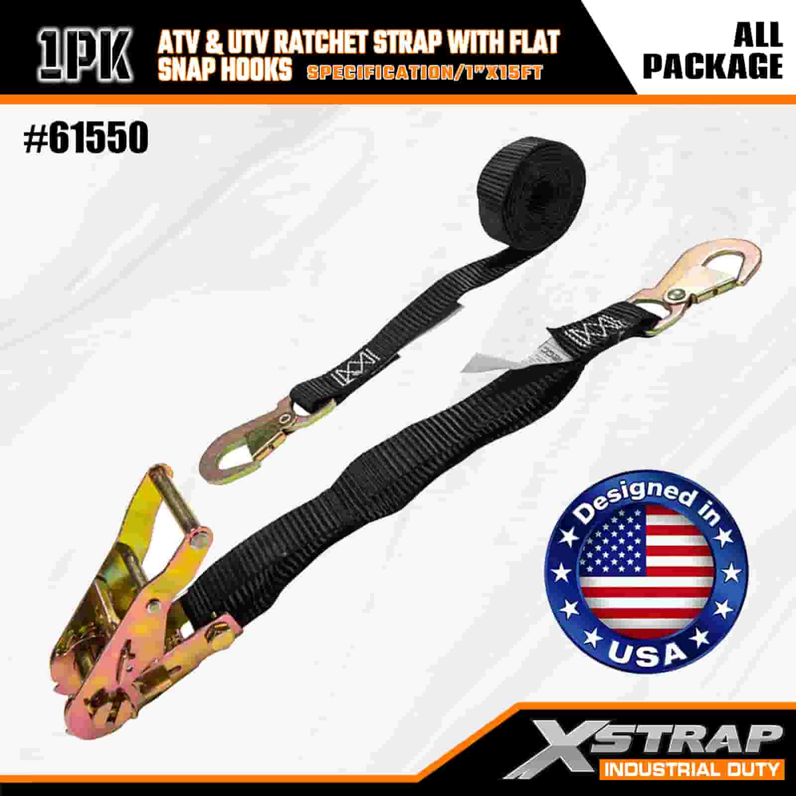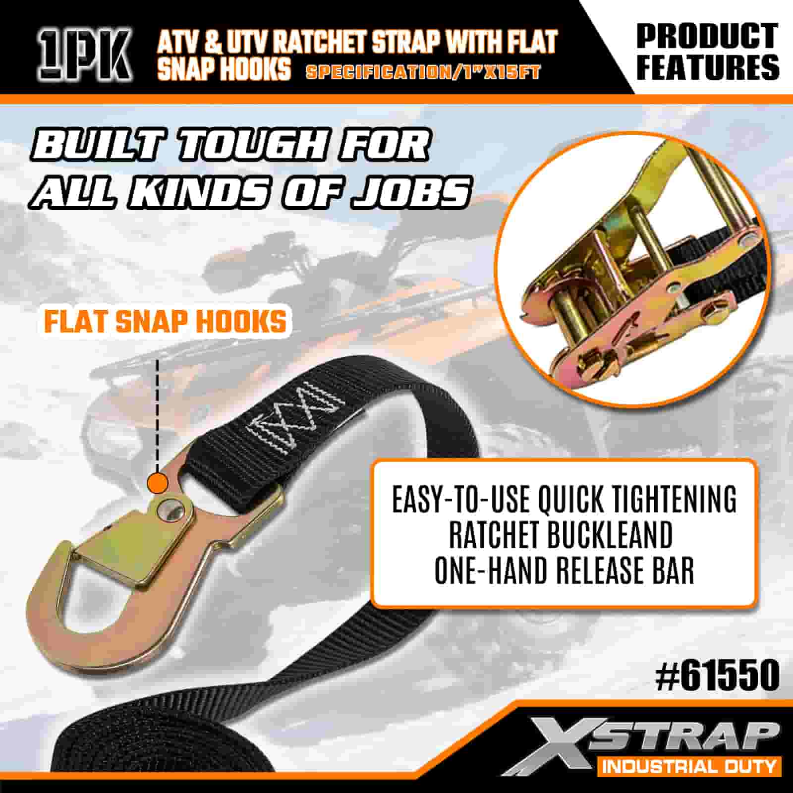 Strap Ratchet Xstrap ATV & AUV le Hooks Snap Maol, 1” x 15’ poileistir Ceangailte Strap Ratchet Strap, Toilleadh 1000 lbs Lashing Lasta Strapaí Daingnithe le Léim Maol do Leantóir, Leantóir Maol Bád sciála Leantóir, Carr Beag, Trealamh Trom.
