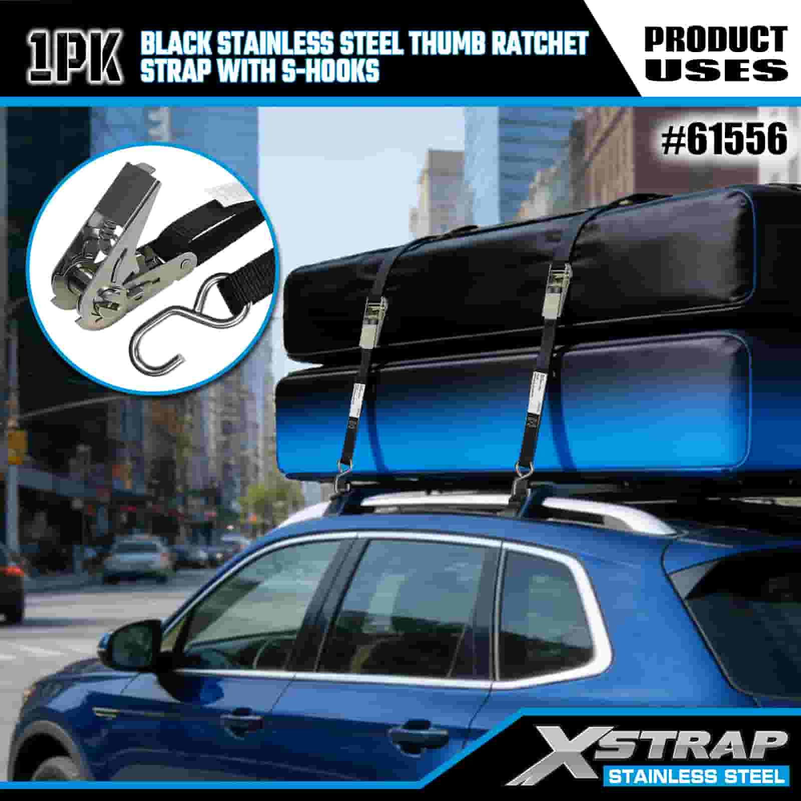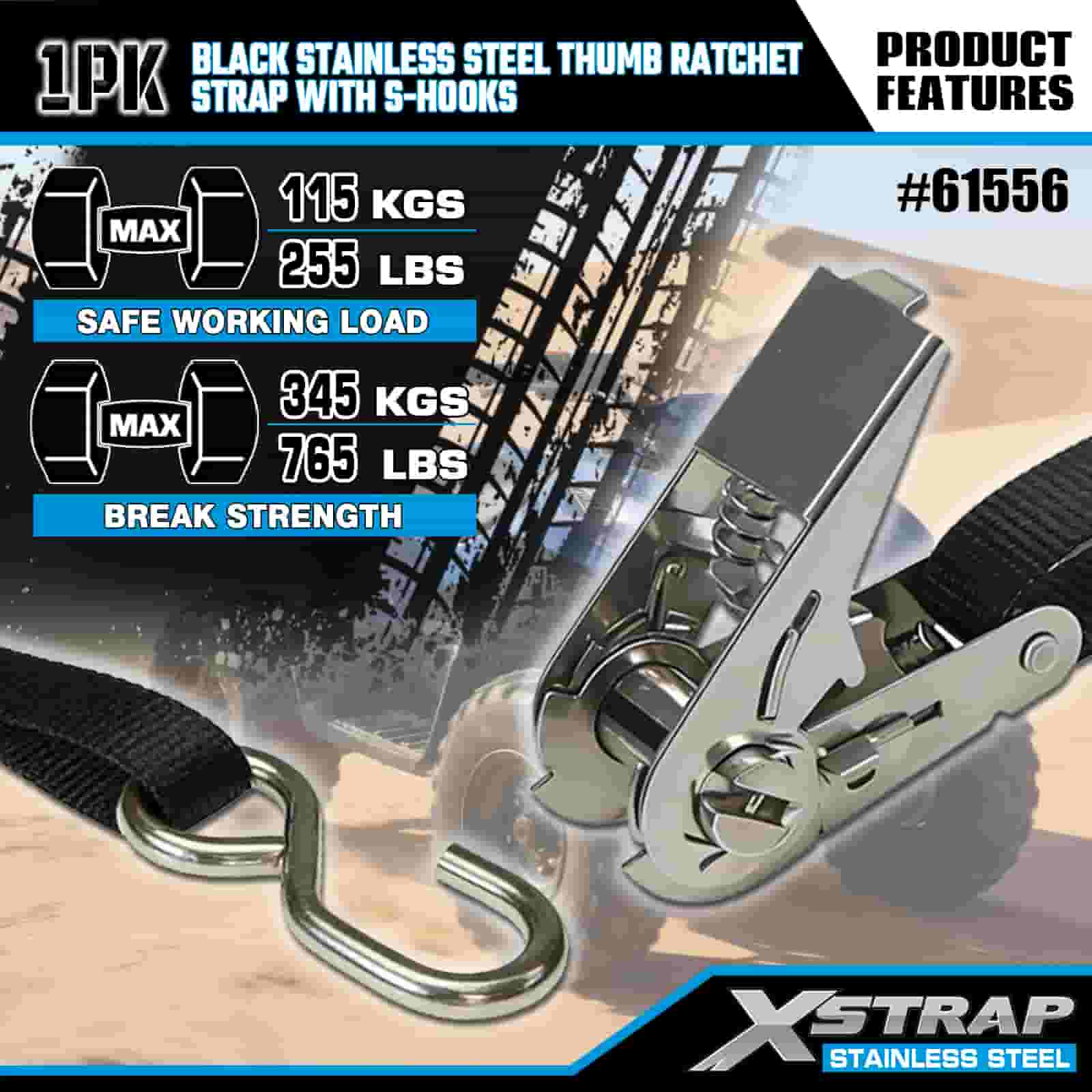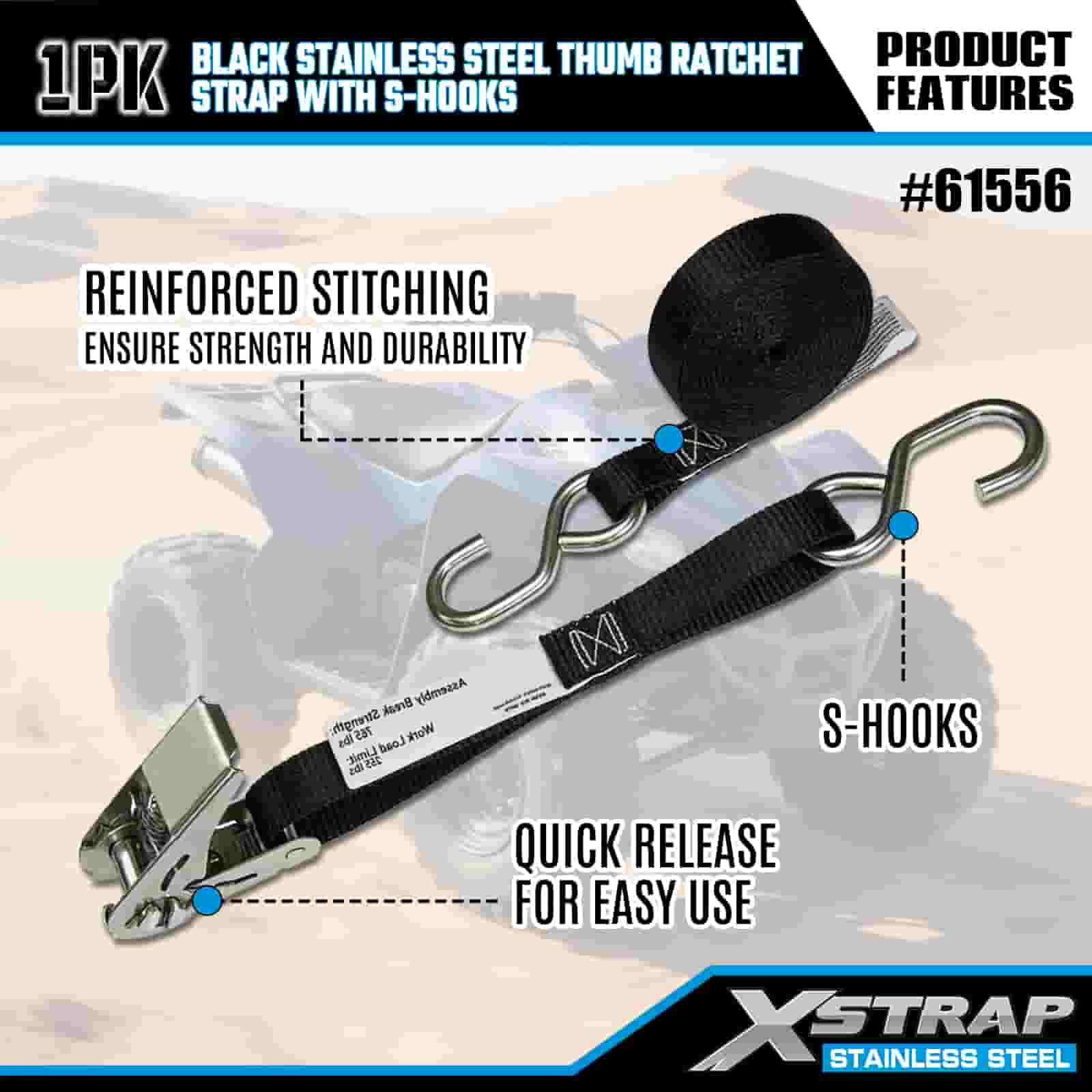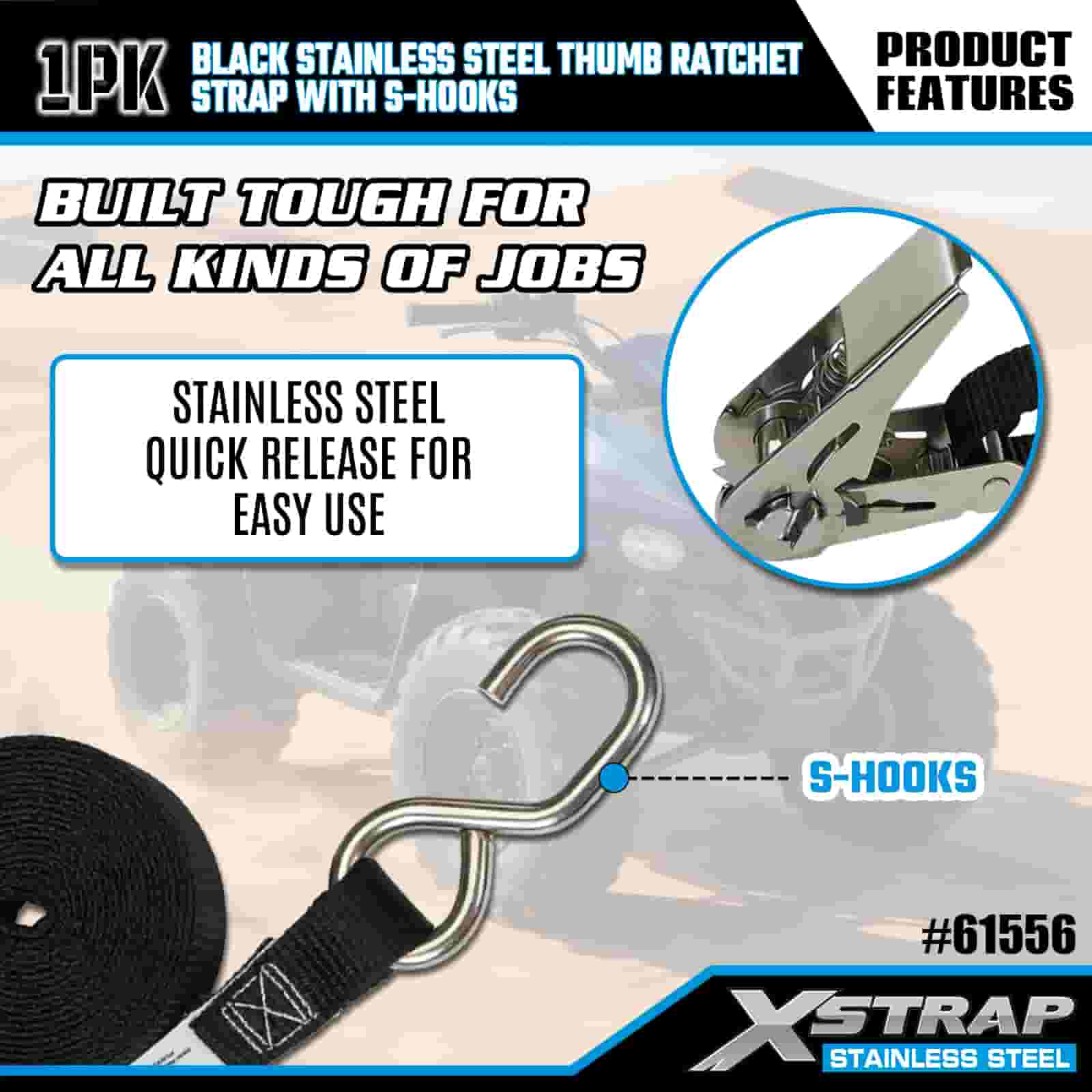 Rásóg Ordóg Cruach Dhosmálta Xstrap Dubh le S Hooks, 1” x 10’ poileistir Ceangail Strap Ratchet Strap, Toilleadh 255 lbs Lasta Lashing Daingnithe Strapaí le S Hooks do Leantóir, Leantóir Leaba Cothrom Bád sciála, Carr Beag, Trealamh Trom.