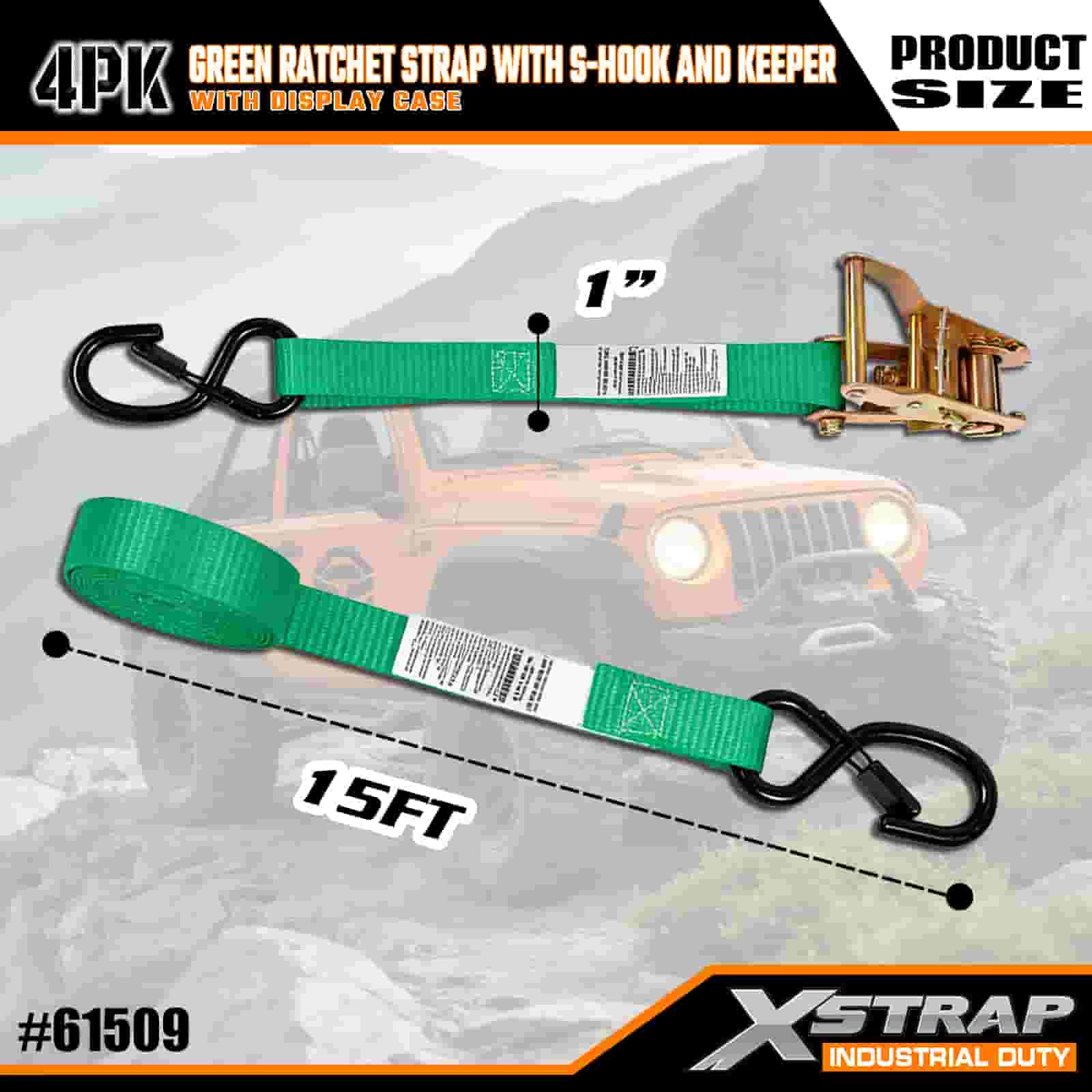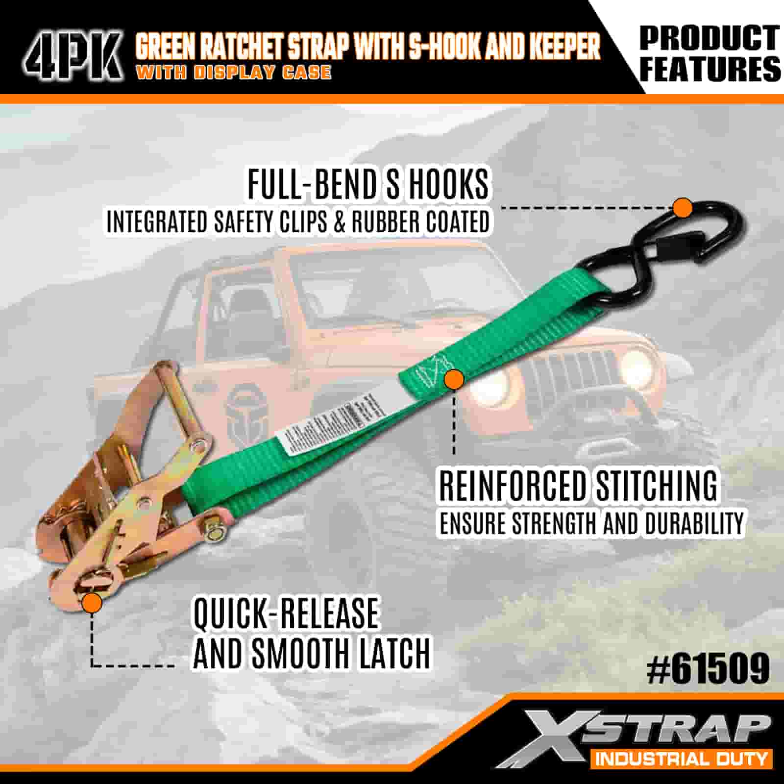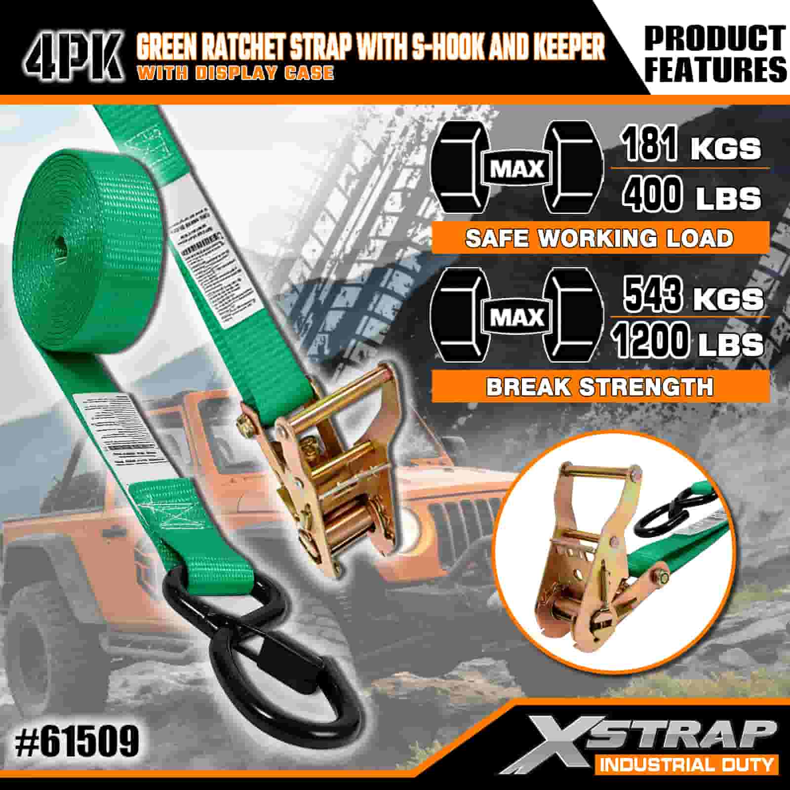 Strap Ratchet Xstrap 4 Pacáiste le Duáin S Sábháilteachta, Strap Raitchet Tarraingthe Poileistir 1” x 15’ Strap Ratchet Tarraingt, Toilleadh Lasta Lashing 400 Daingniú Strapaí le S Dubháin Sábháilteachta don Ghairmiúil Tromchúiseach chun Leantóir Lasta a Dhaingniú, Leantóir Leaba Leaba, Bád sciála, Carr Beag.