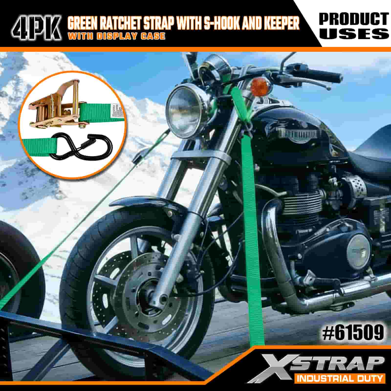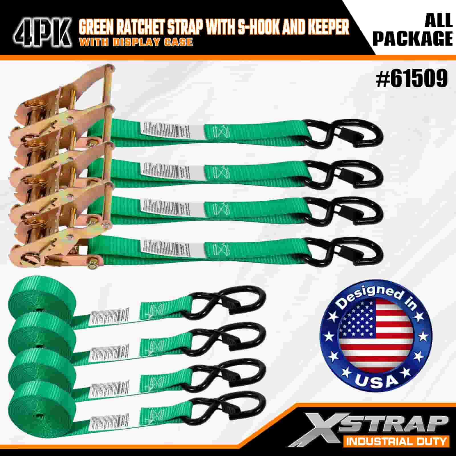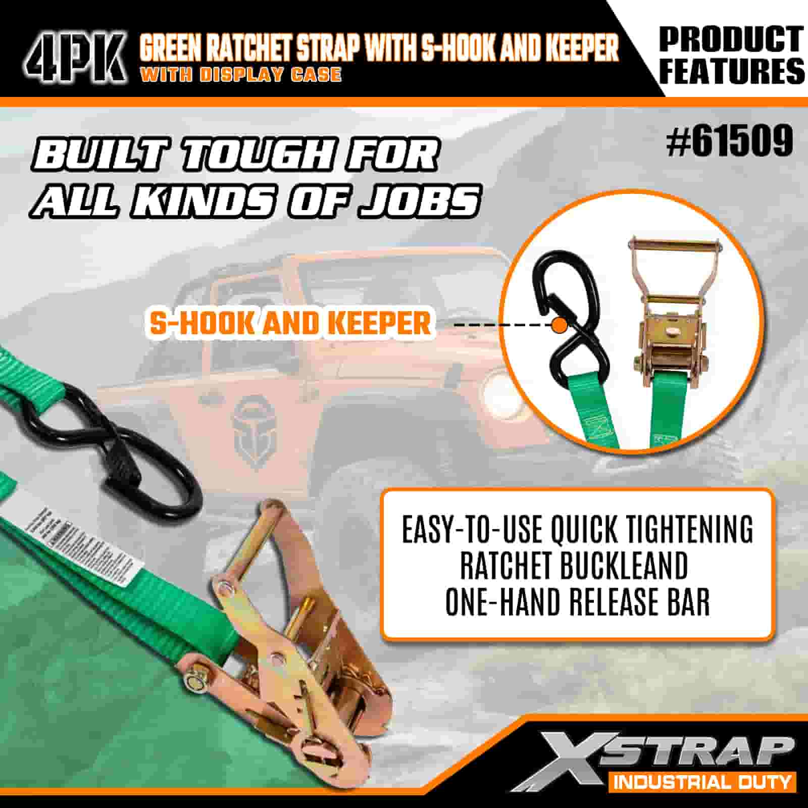 Strap Ratchet Xstrap 4 Pacáiste le Duáin S Sábháilteachta, Strap Raitchet Tarraingthe Poileistir 1” x 15’ Strap Ratchet Tarraingt, Toilleadh Lasta Lashing 400 Daingniú Strapaí le S Dubháin Sábháilteachta don Ghairmiúil Tromchúiseach chun Leantóir Lasta a Dhaingniú, Leantóir Leaba Leaba, Bád sciála, Carr Beag.