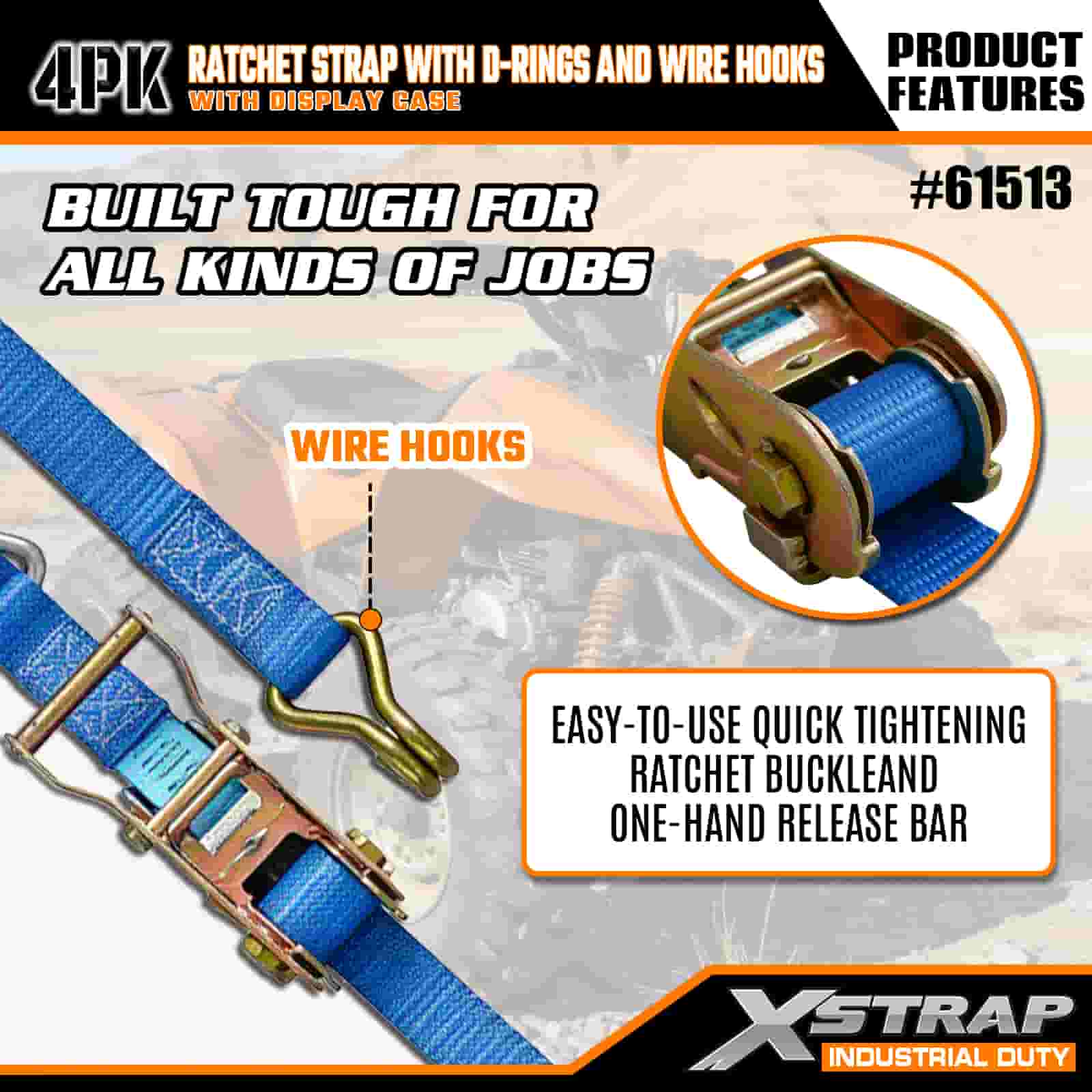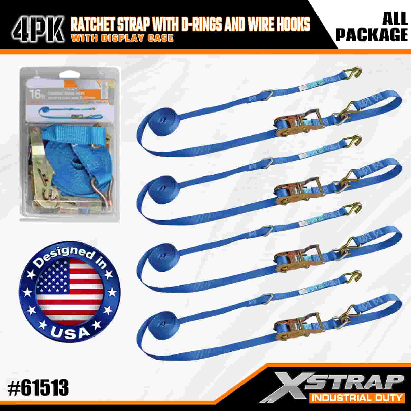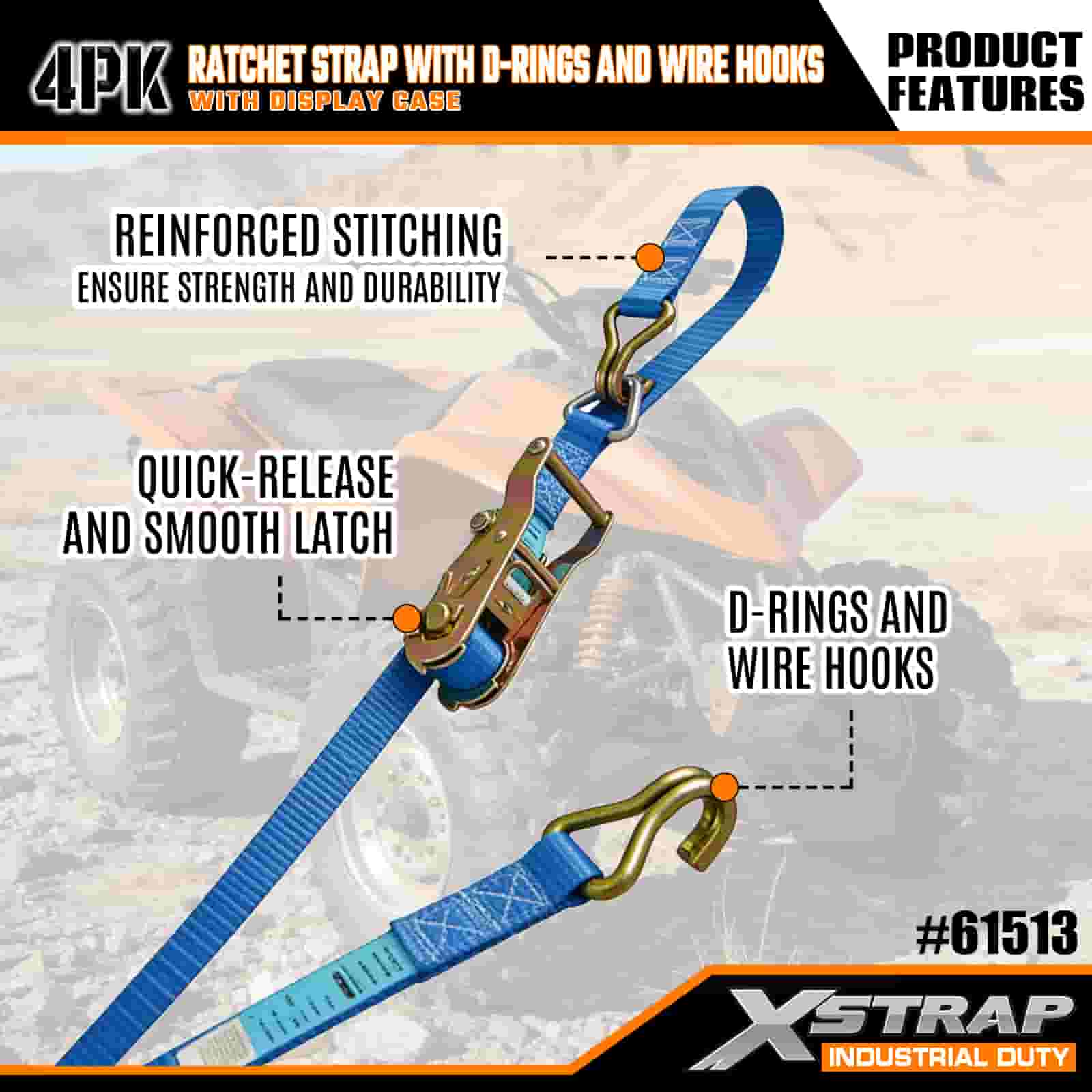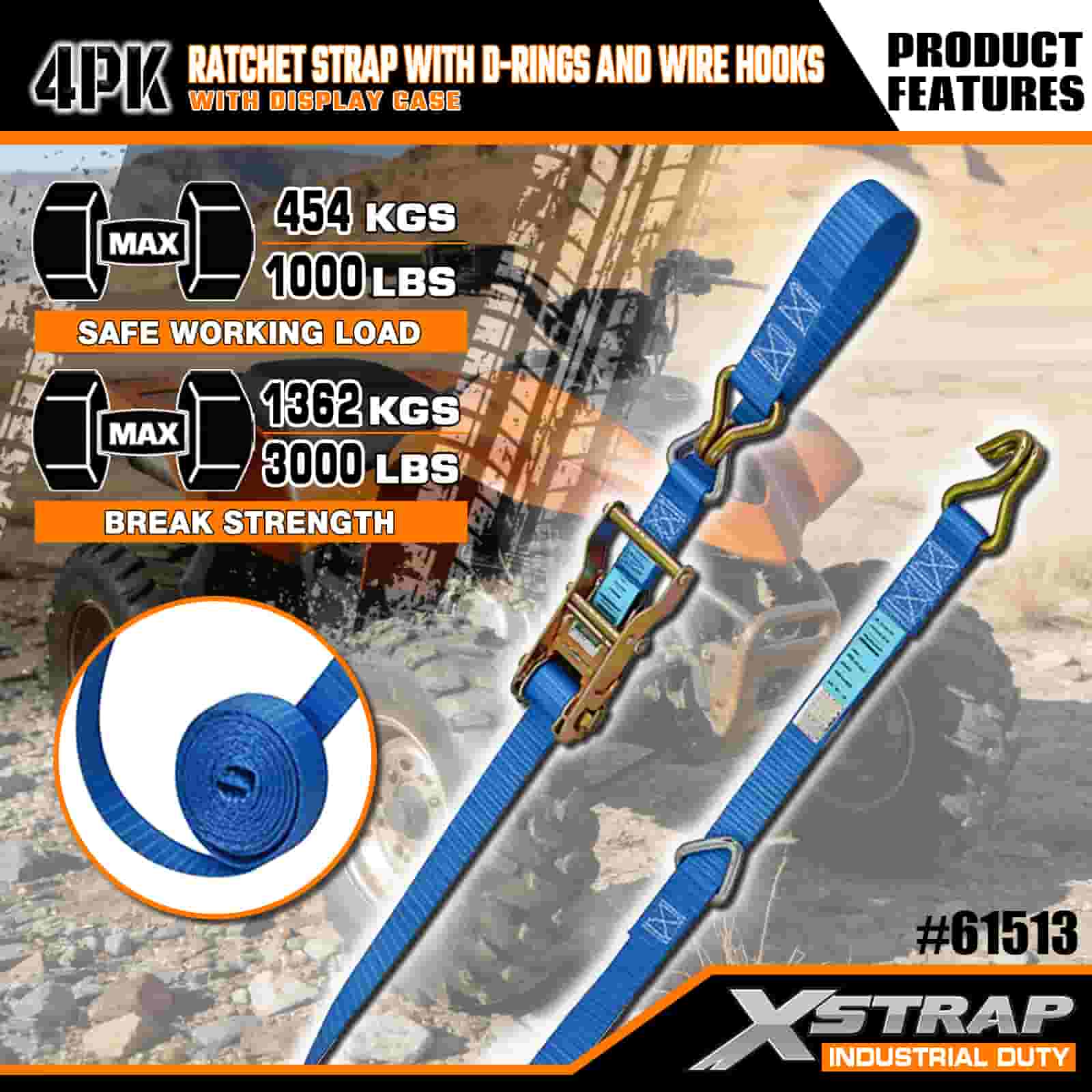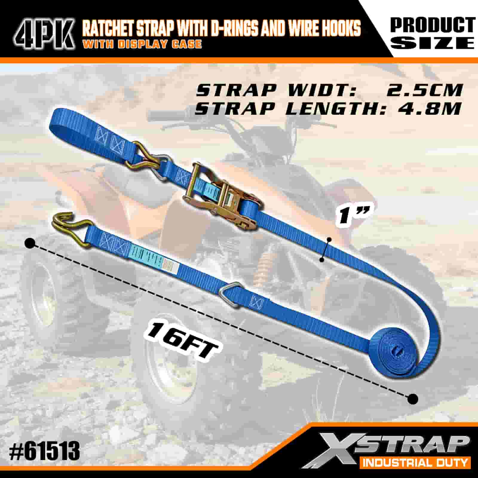 Strap Raitchet Xstrap 4 Pacáiste le Fáinní D agus Duáin Sreanga, Strap Raitseog Poileistir 1” x 16’ Ceangal Síos Strap Tarraingt Raitse, Toilleadh Lasta 1000 Punt Daingnithe Strapaí le Húcaí Sreanga don Ghairmí Tromchúiseach chun Leantóir Lasta a Dhaingniú, Leantóir Leaba Réidh, Bád Sciála.