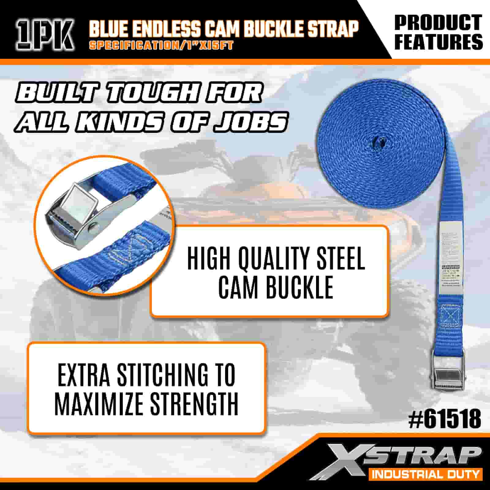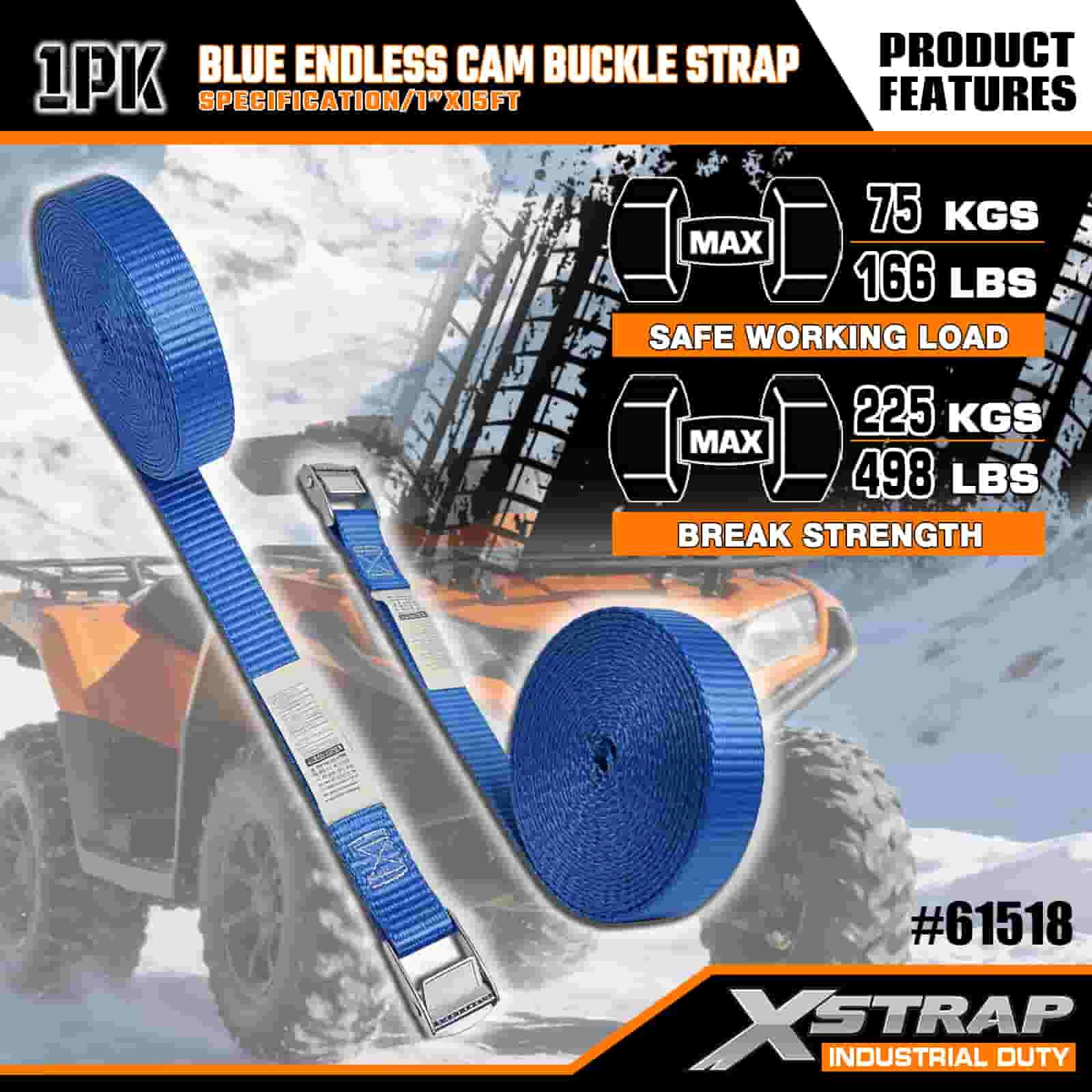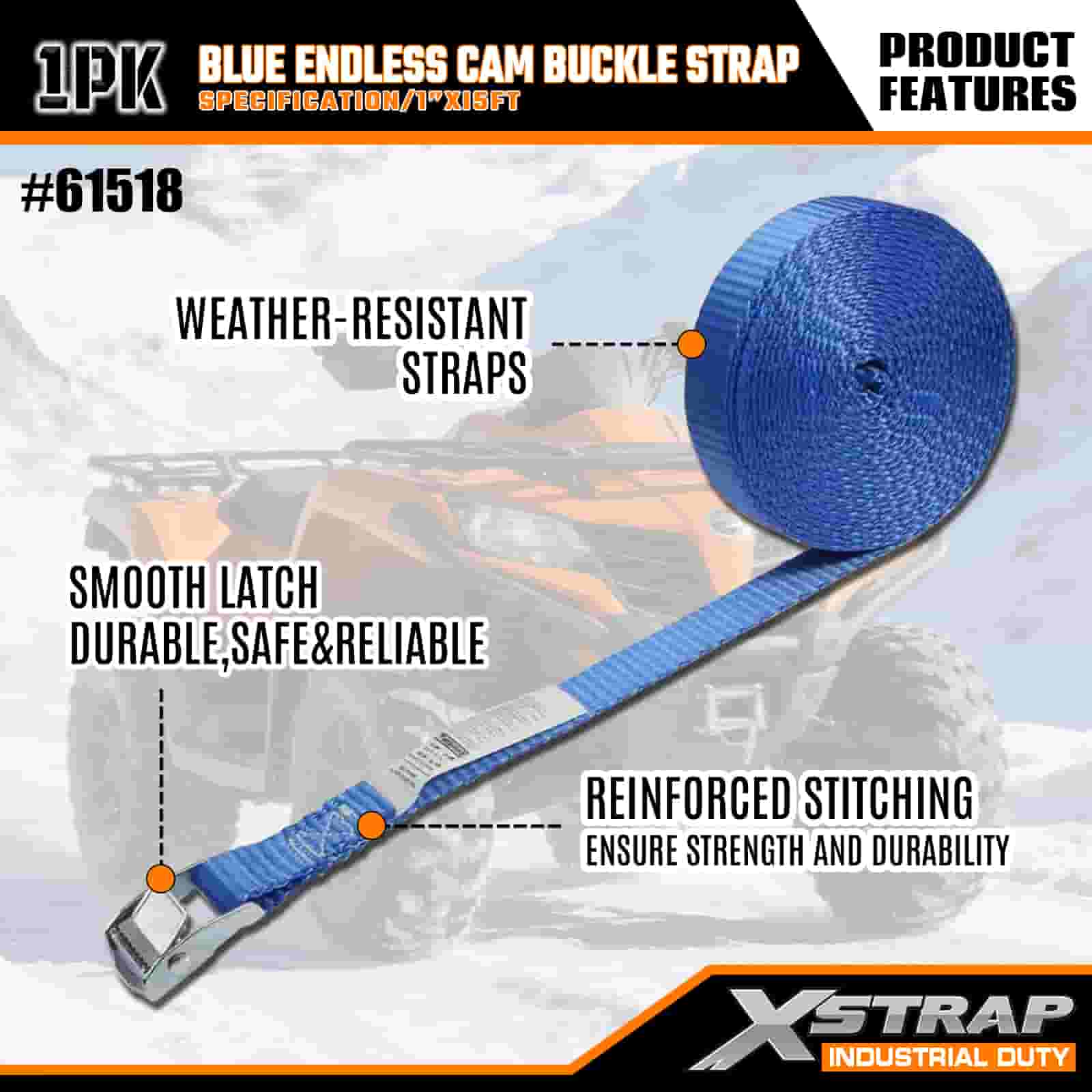 Strap búcla Cam Gan deireadh Xstrap, 1” x 15’ poileistir Ceangail Síos Strap Strap Ratchet Tarraingt, Toilleadh 166 lbs Lasta Lashing Strapaí Daingnithe don Ghairmí Tromchúiseach Leantóir Lasta a Dhaingniú, Leantóir Leaba Leaba, Bád Sciála, Carr Beag.