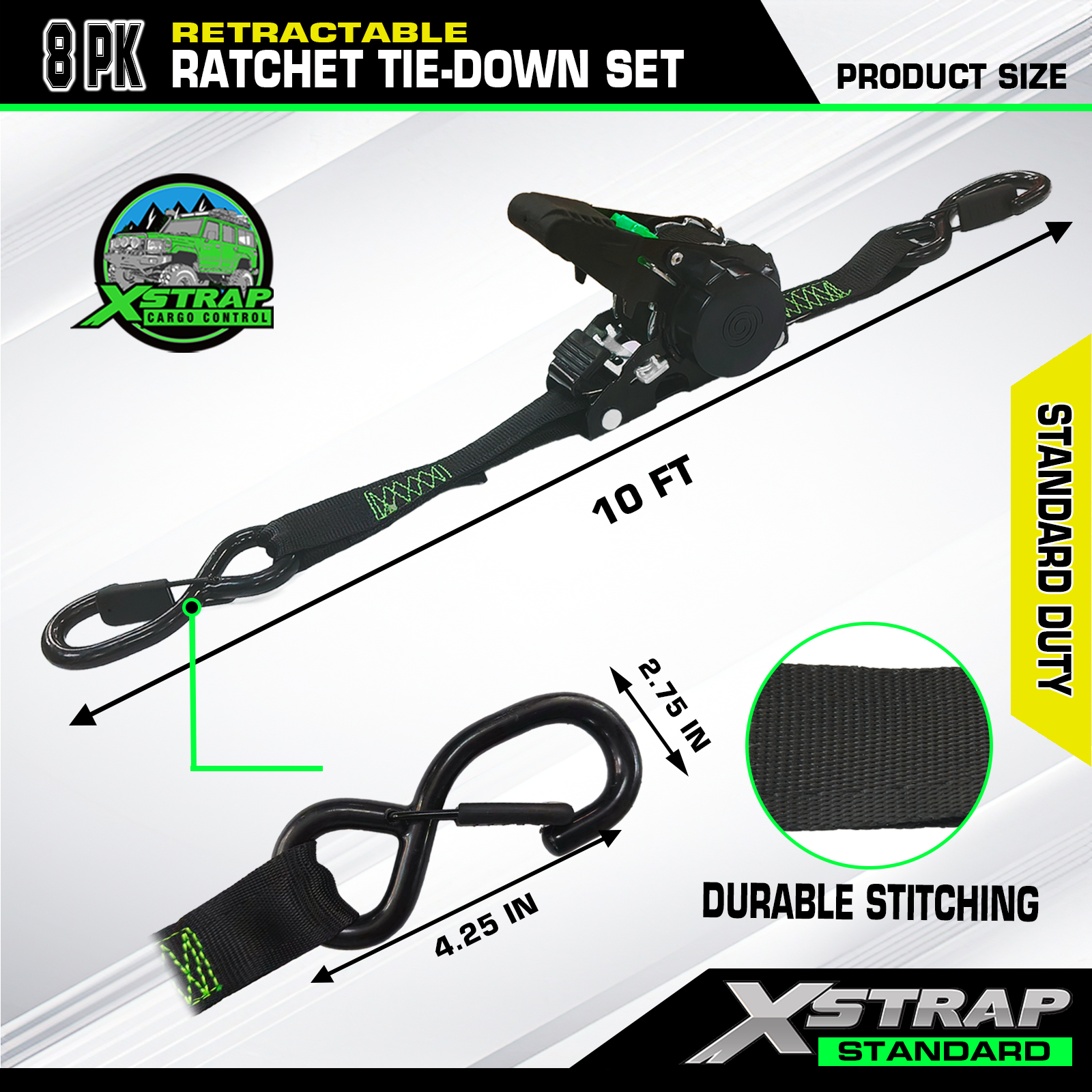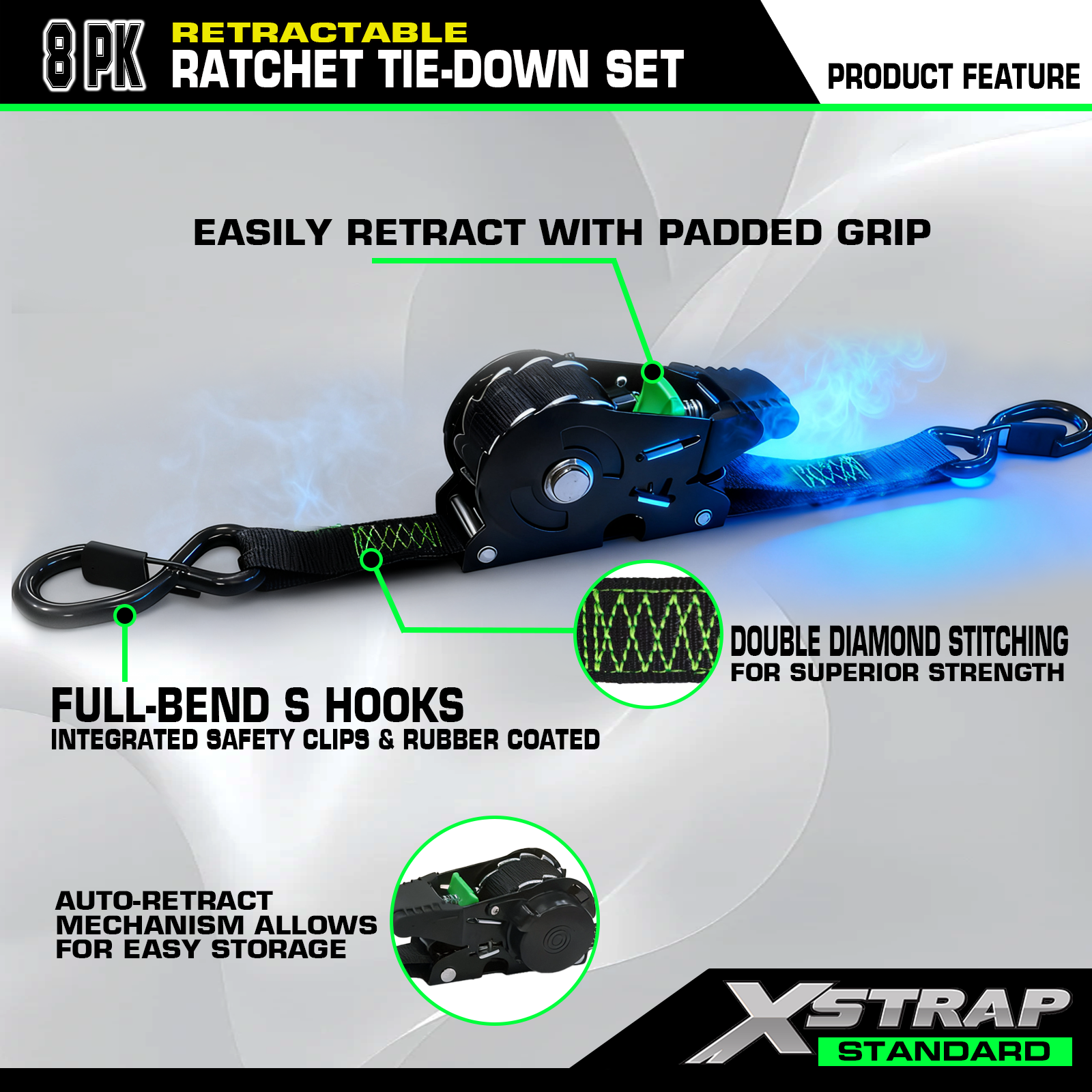 Tá meicníocht aistarraingthe uathoibríoch ionsuite ag an strap ratchet inghnóthaithe, rud a ligeann don strap tarraingt siar go réidh ar ais ina thithíocht tar éis é a úsáid. Ní hamháin go gcoimeádann sé seo an strap néata agus cosanta, ach laghdaíonn sé go mór an t-am ullmhúcháin agus glantacháin. Soláthraíonn an uigí poileistear 10 dtroigh teannas láidir agus neart iontaofa do ghluaisrothair, ATVanna, rothair, UTVanna. Tá an láimhseáil ratchet eirgeanamaíochta compordach le feidhmiú, ag tairiscint greim níos fearr agus níos lú iarracht nuair a bhíonn an t-ualach á ghéarú.