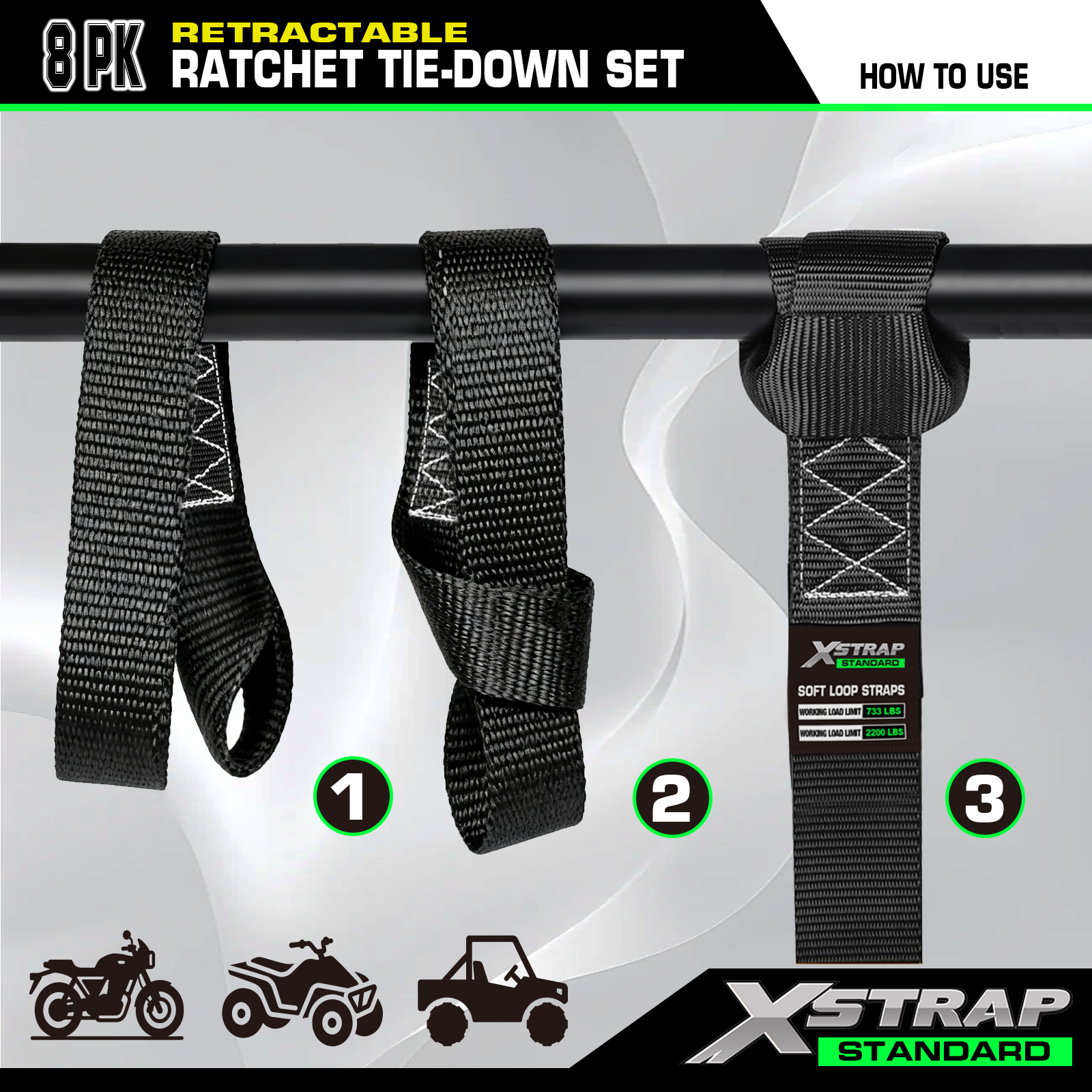 - Áirítear leis 4 lúb bog comhionannas vótaí -- is féidir leis na lúba boga cabhrú le pointí ancaire a chruthú ar racaí dín, leapacha trucail, barraí láimhe. Mar sin is féidir leat ár strapaí ratchet intarraingthe a úsáid i go leor cásanna.