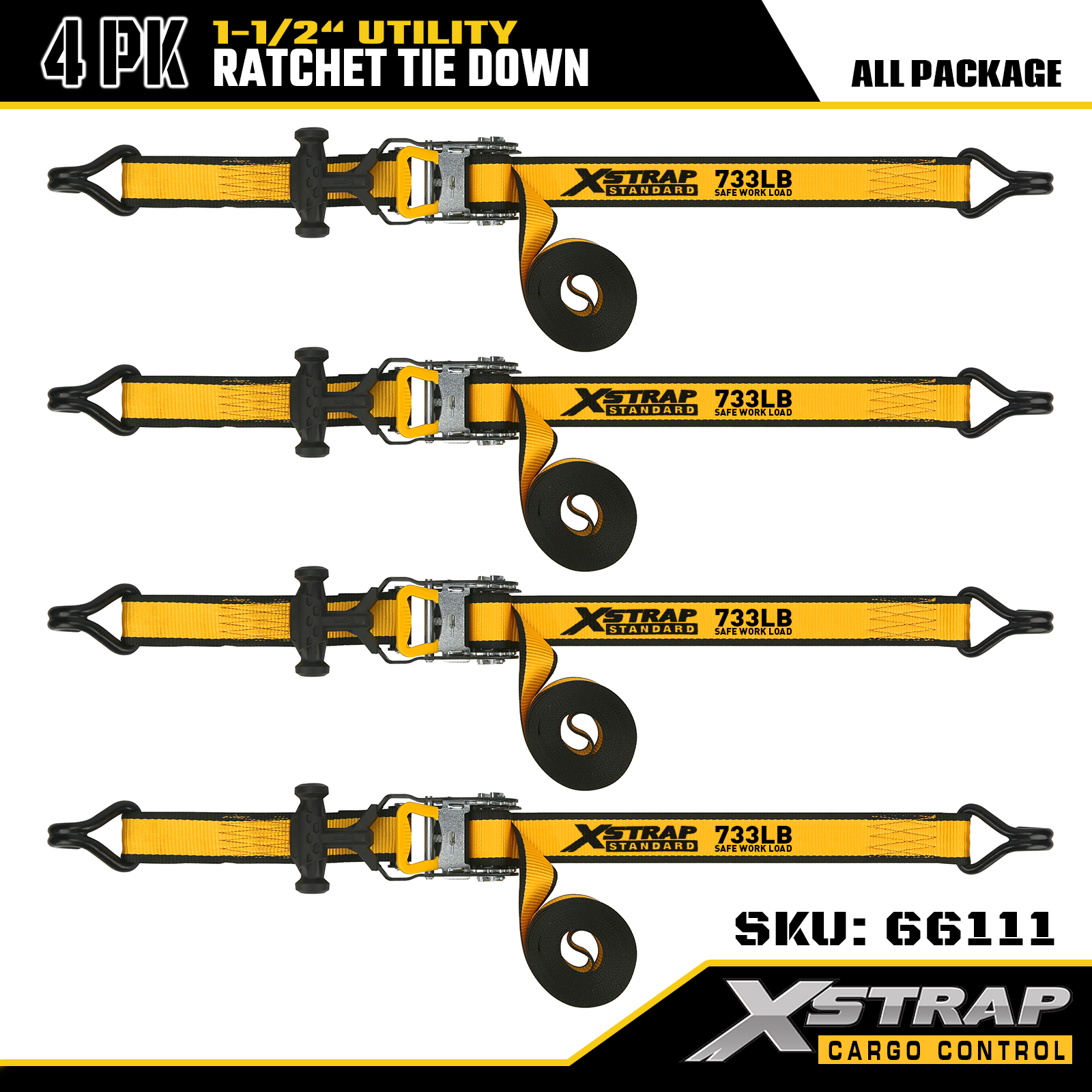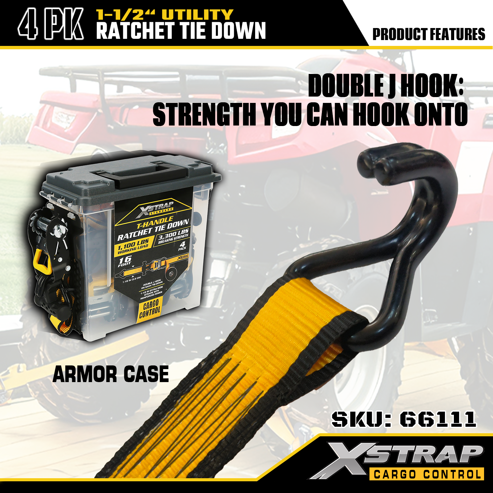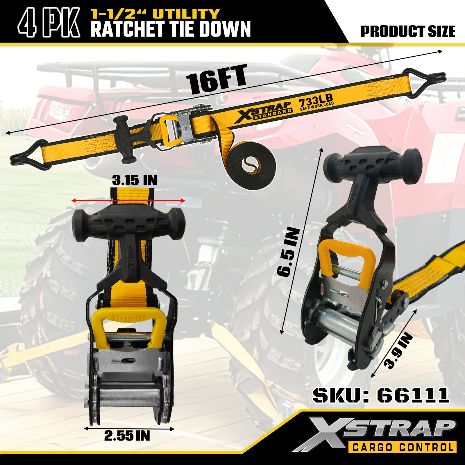 Is é an Xstrap T-Handle Ratchet Tie Down ná 1.5 orlach x 16ft, is é 1,100lbs an t-ualach oibre sábháilte agus is é 3,300lbs an neart briseadh.