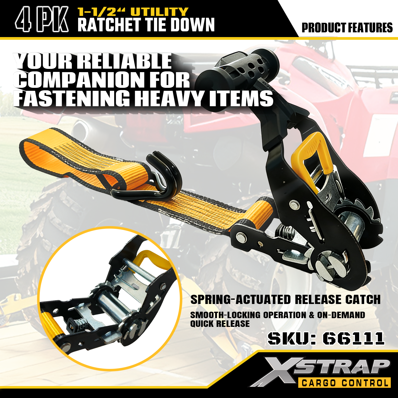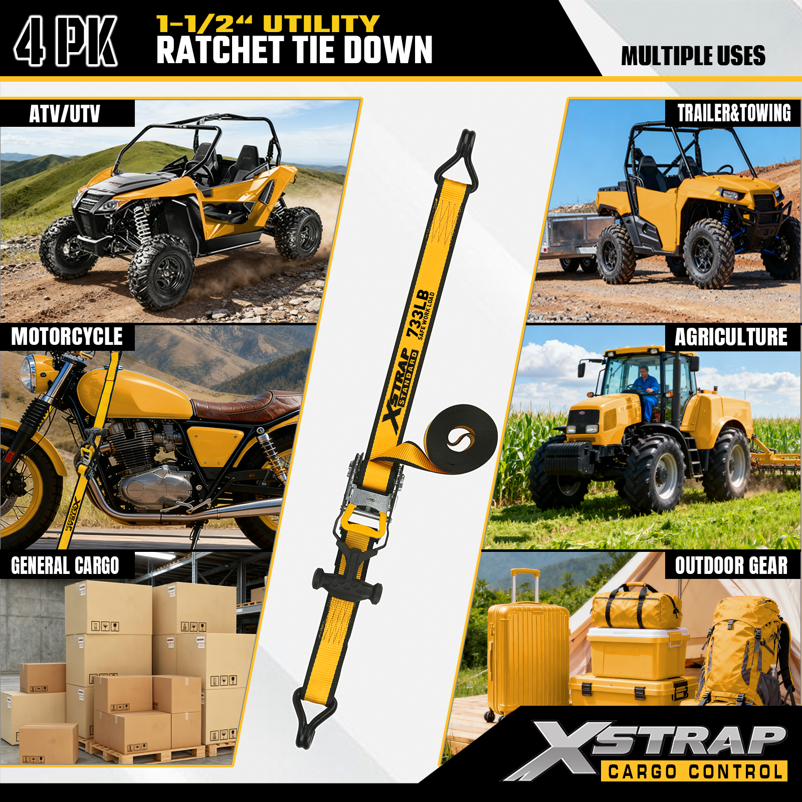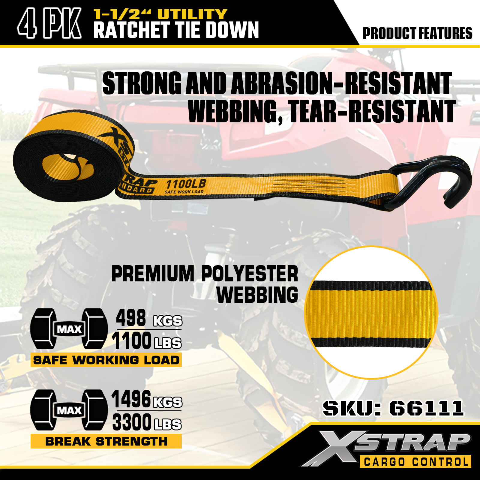 Is é an Xstrap T-Handle Ratchet Tie Down ná 1.5 orlach x 16ft, is é 1,100lbs an t-ualach oibre sábháilte agus is é 3,300lbs an neart briseadh.