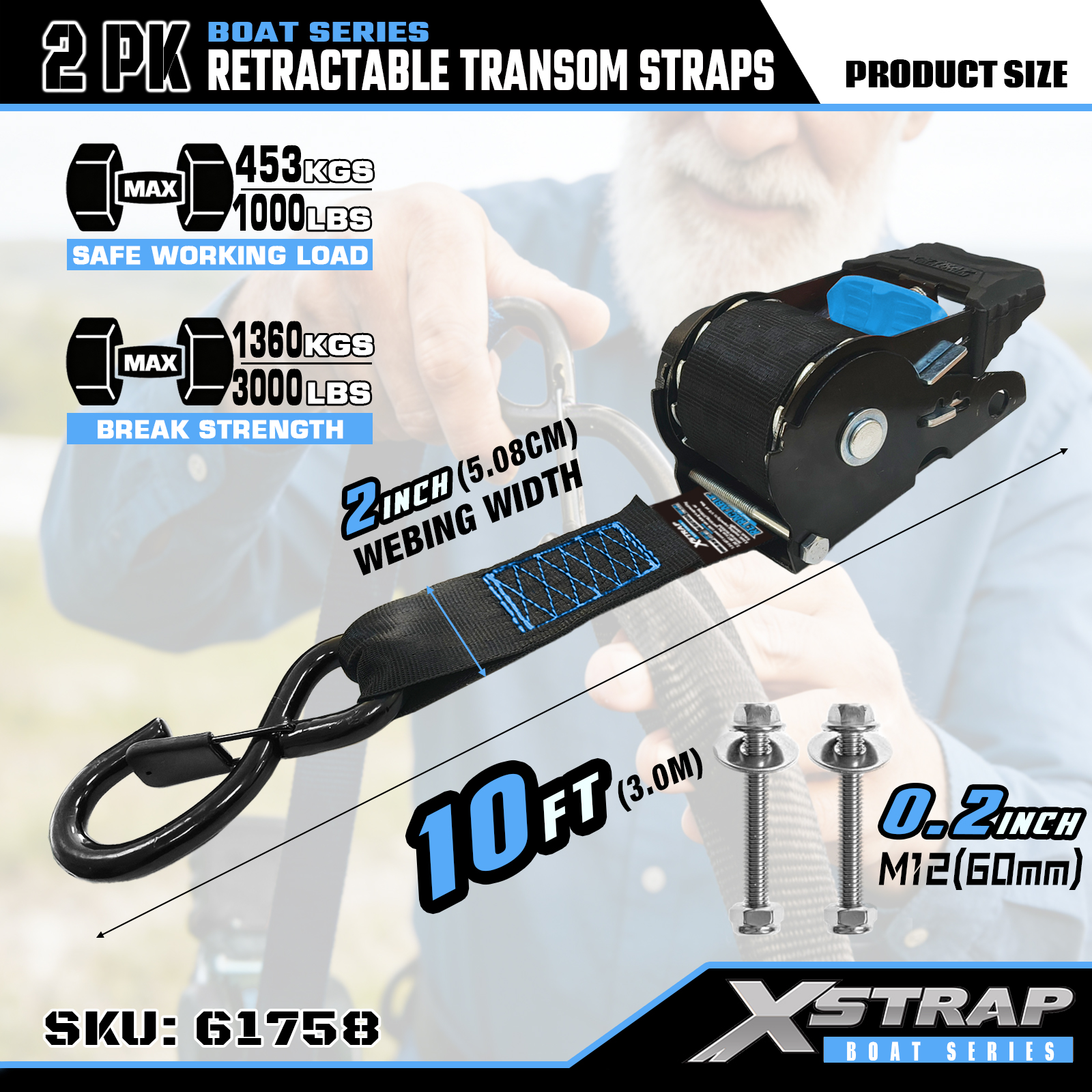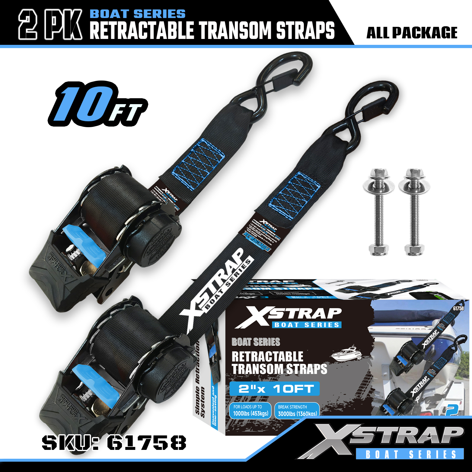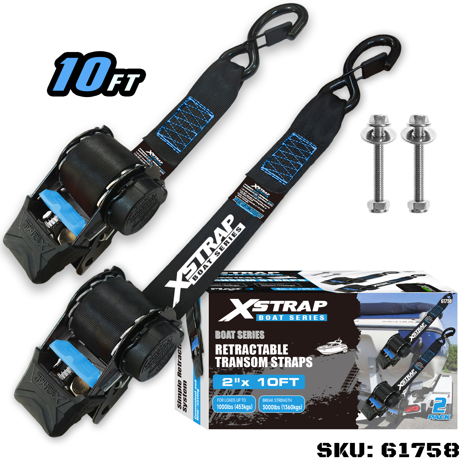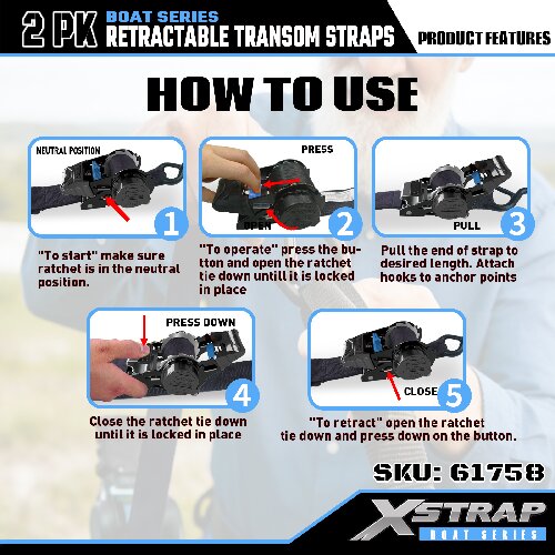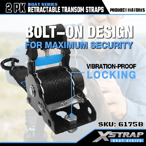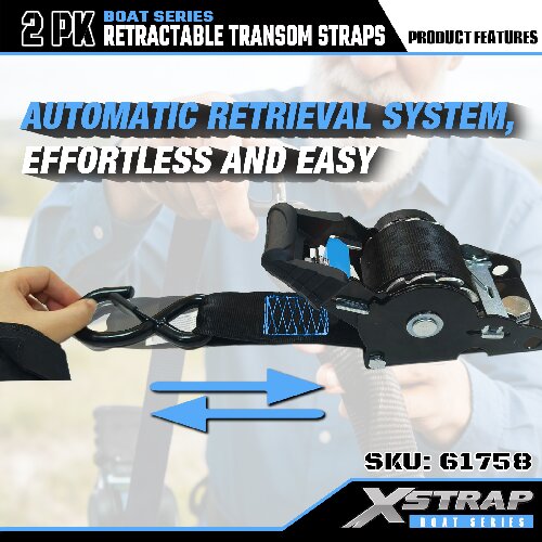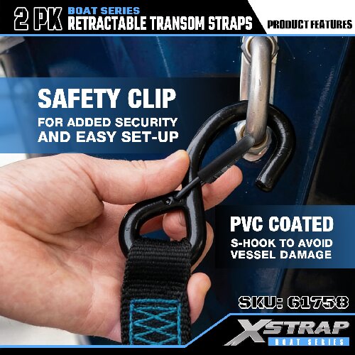 Is é seo an Xstrap Transom Retractable Tie Down Straps with Safety S Hooks. Is é 1,000 punt an t-ualach oibre sábháilte, agus is é 3,000 punt an neart briseadh.