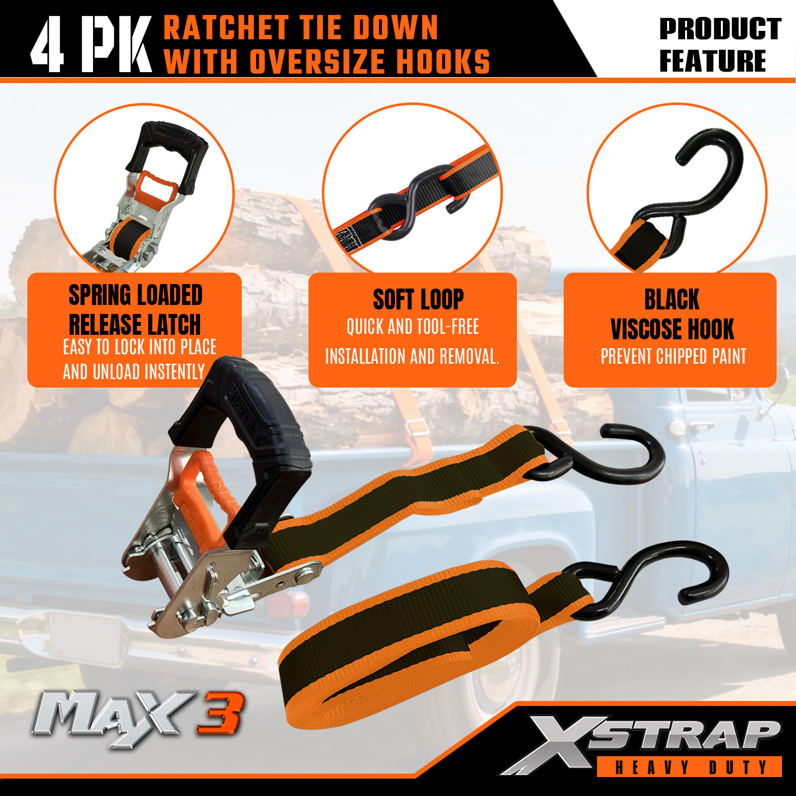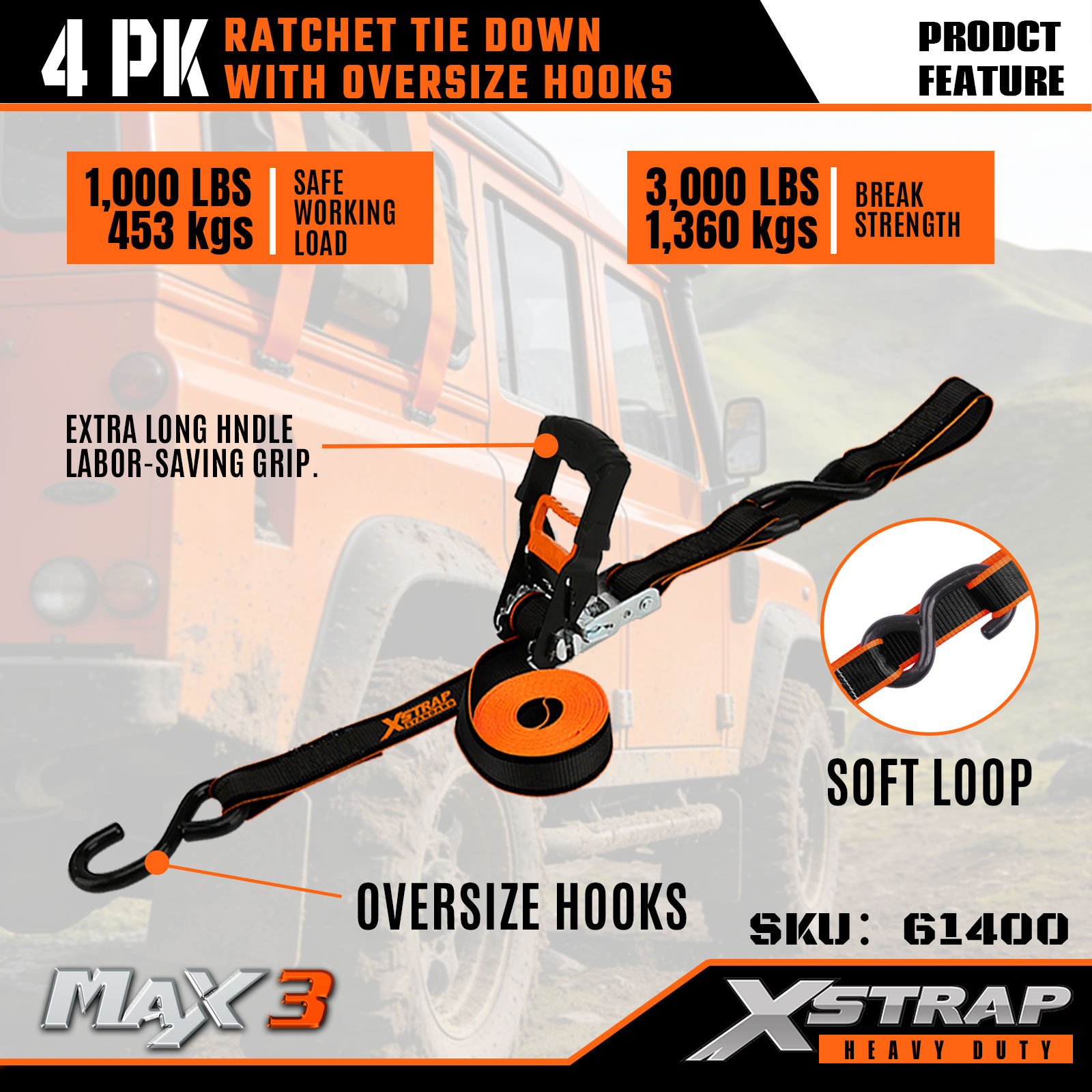 Xstrap 4 Pacáiste Ratchet Ceangail Síos, 1-1/4" x 16' poileistir Ceangail Síos Strap Tarraingt Strap Raitse, Toilleadh 1000 lbs Lasta Lashing Strapaí Daingnithe le Dúbailte J Hooks do Thraicéad Pioctha, SUV, Carranna Barr Gluaisrothar, Bád Sciála Éadrom, Rásaí Dlí Scaird.