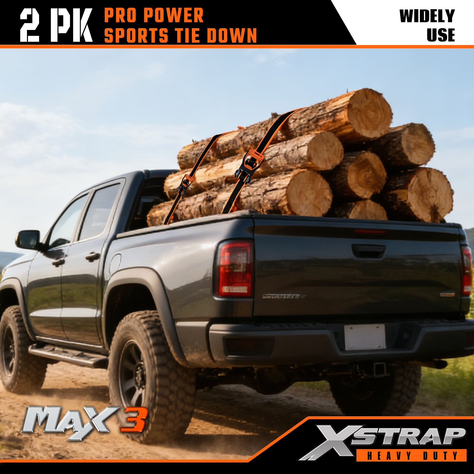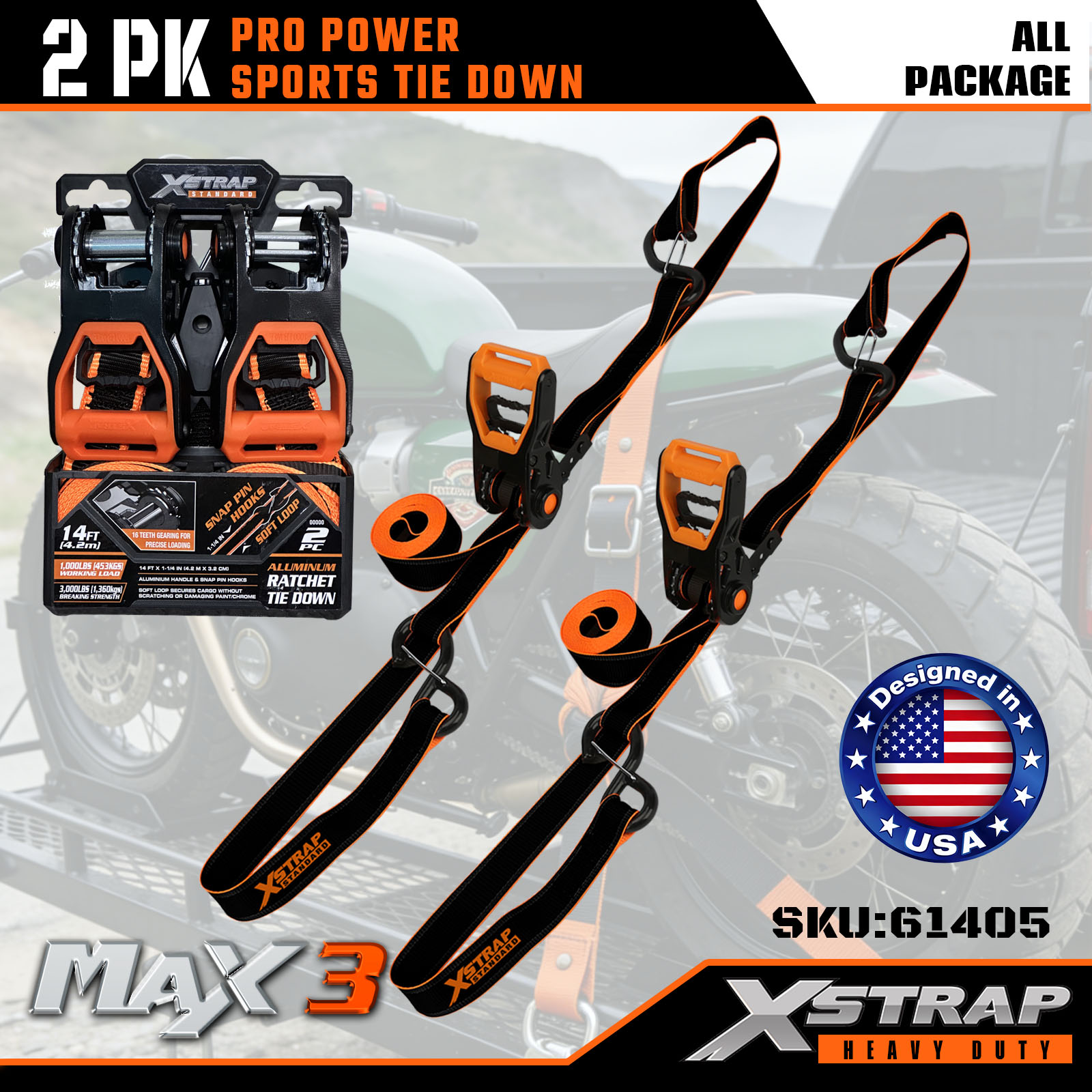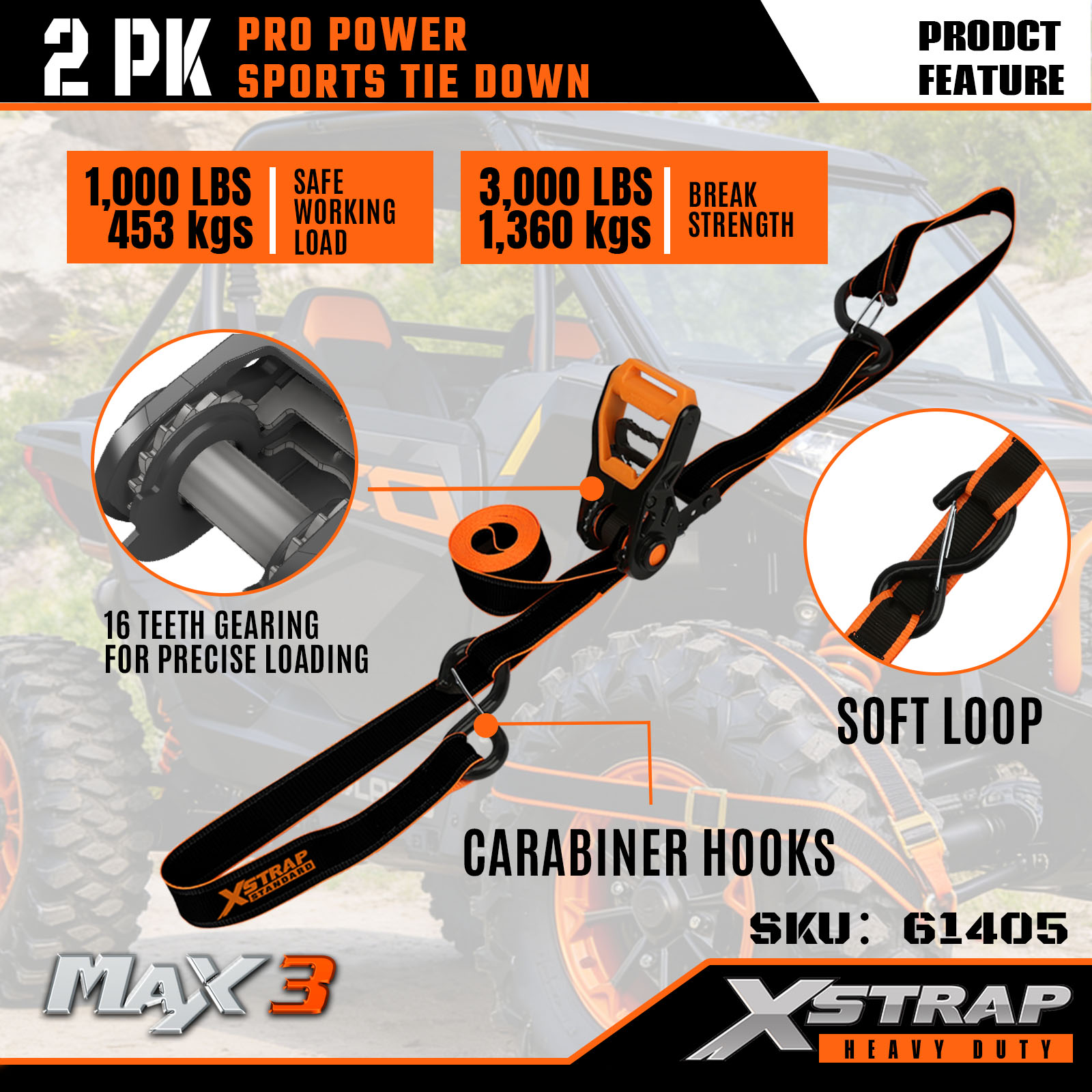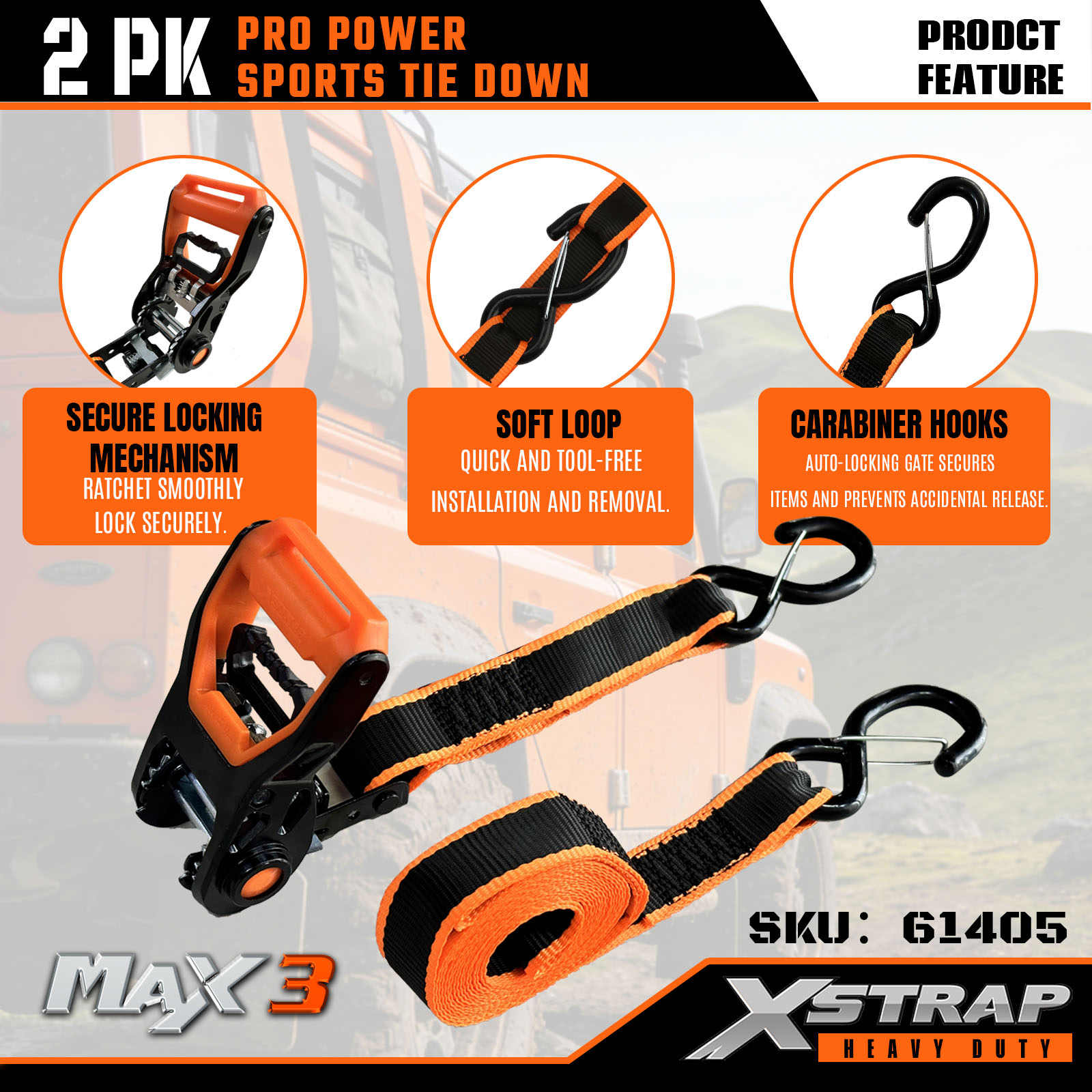 Xstrap 2 Pacáiste Strapaí Ceangail-Síos Spóirt Cumhachta, 1-1/4" x 14' poileistir le strap tarraingthe tarraingthe síos strap, 1000 lbs Toilleadh Lasta Lashing Strapaí Daingnithe le Hooks CArabiner do Truck, SUV, Carranna Barr Racks Gluaisrothar.