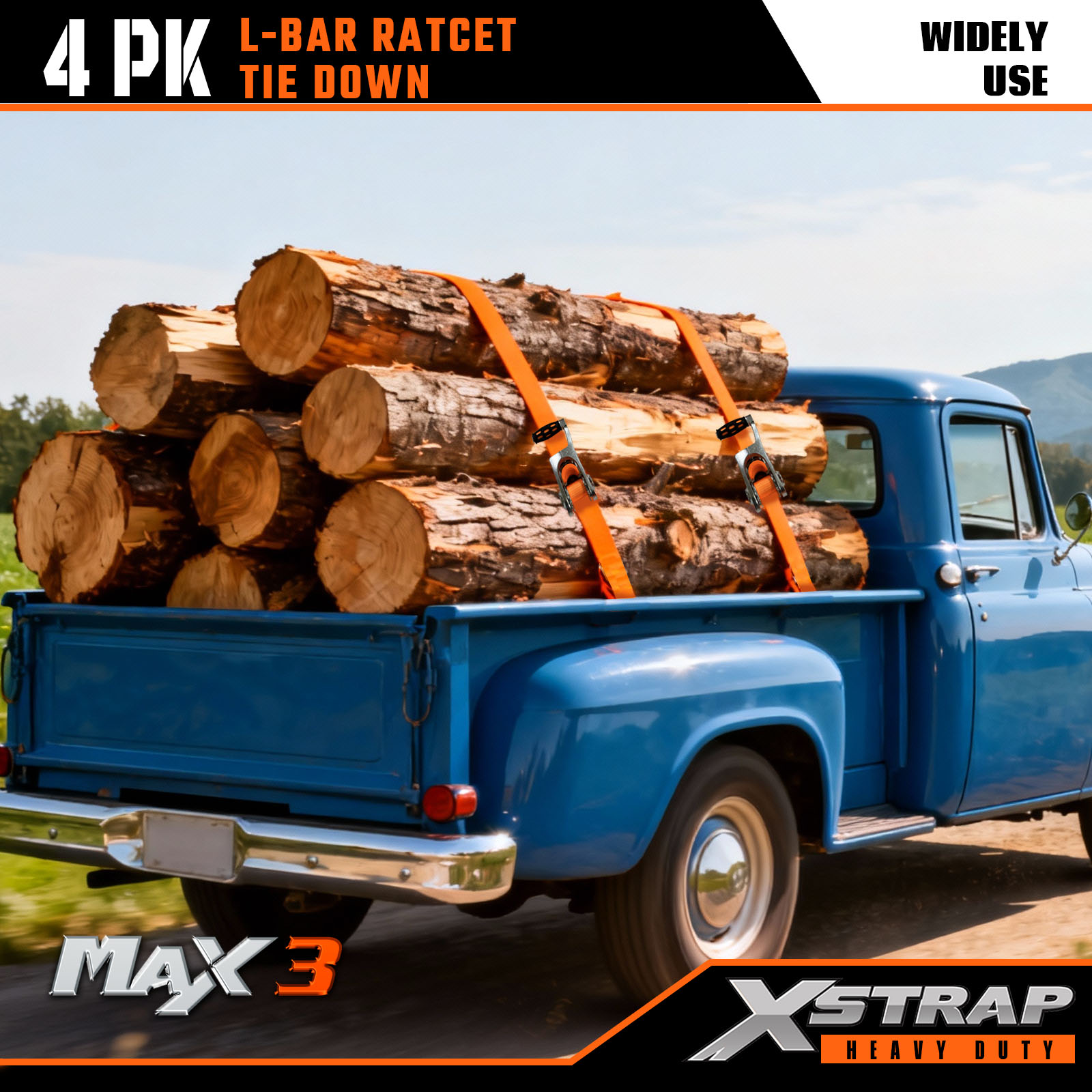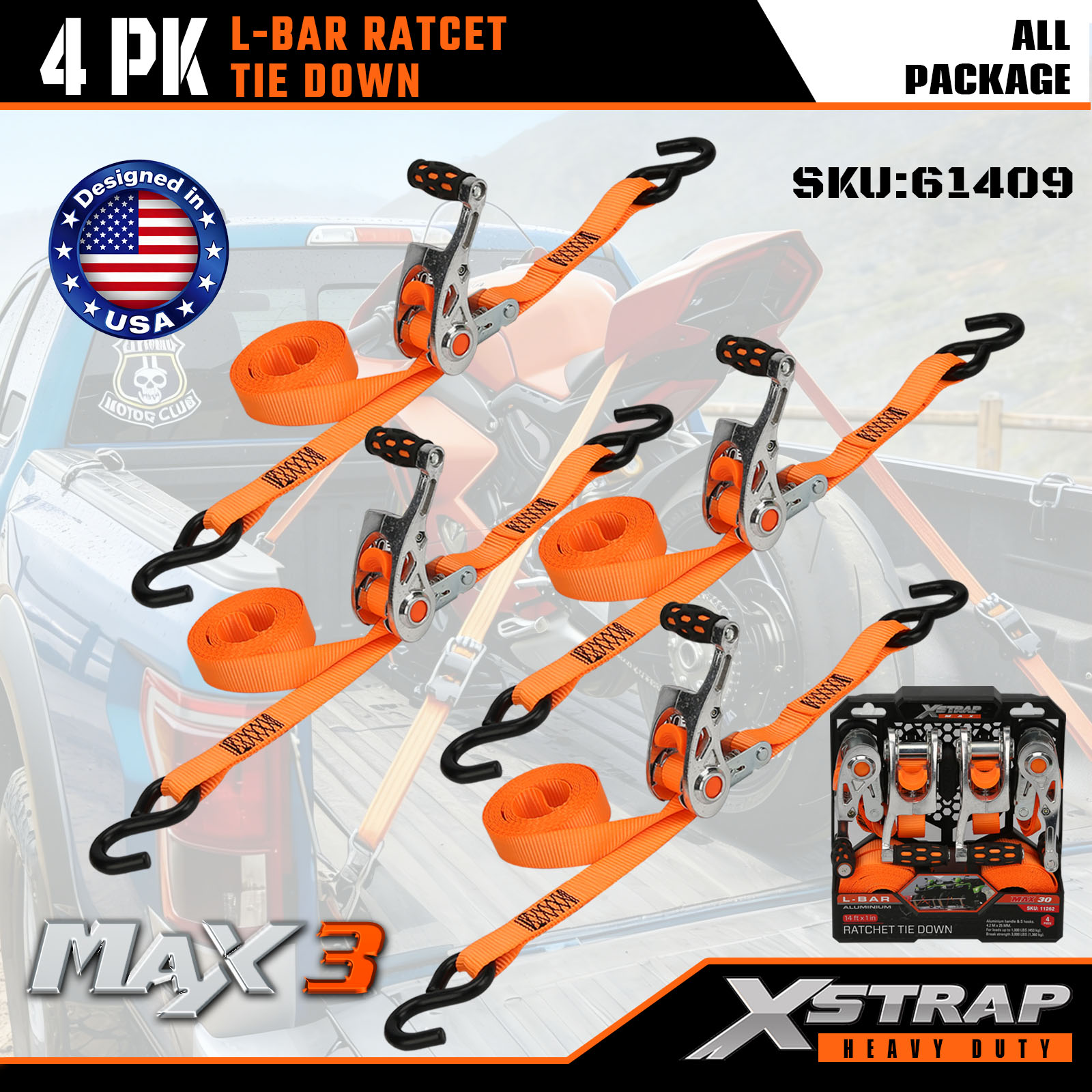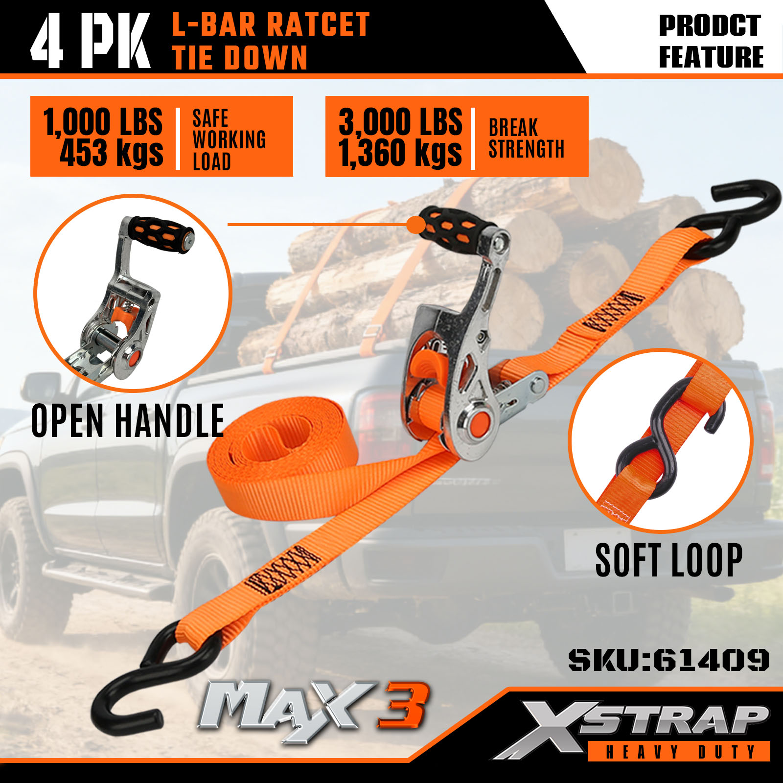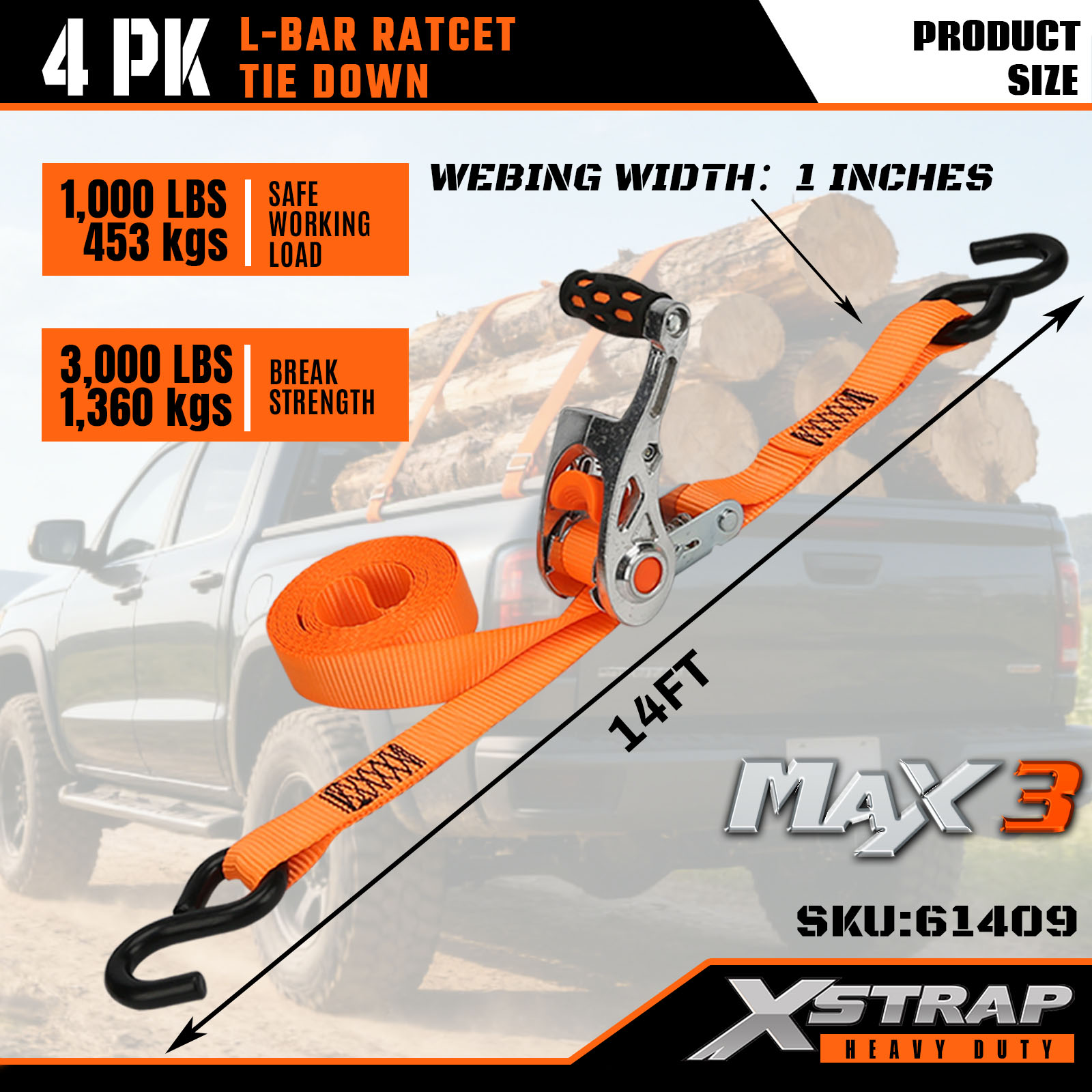 Xstrap 4 Pacáiste L Barra Ceangail Síos Straps, 1” x 14’ Poileistir Ceangal Snasta Strap Ratchet Tarraingt, Toilleadh 1000 Lasta Lashing Straipeanna Daingnithe le S Hooks do Truck, SUV, Racks Barr Gluaisrothar.