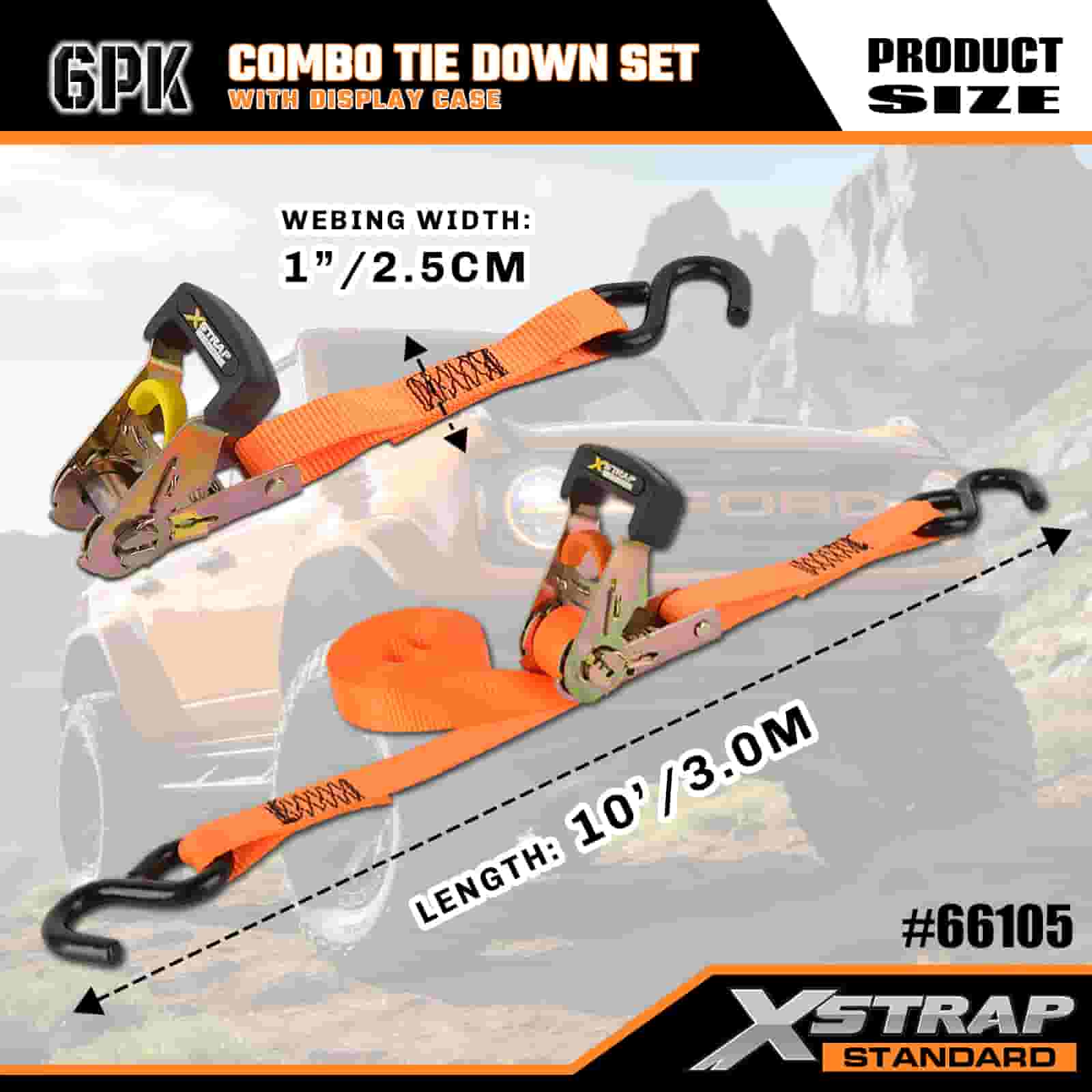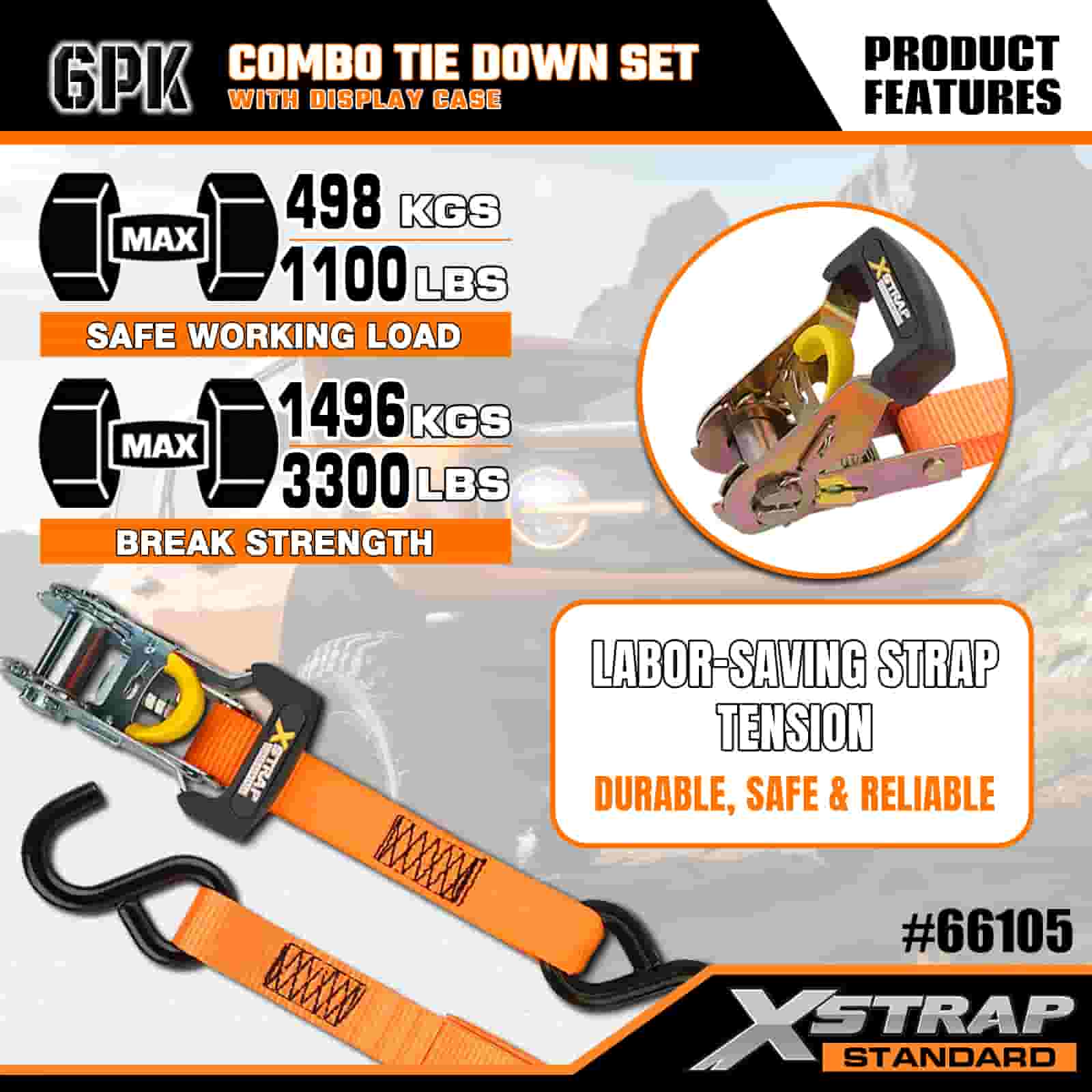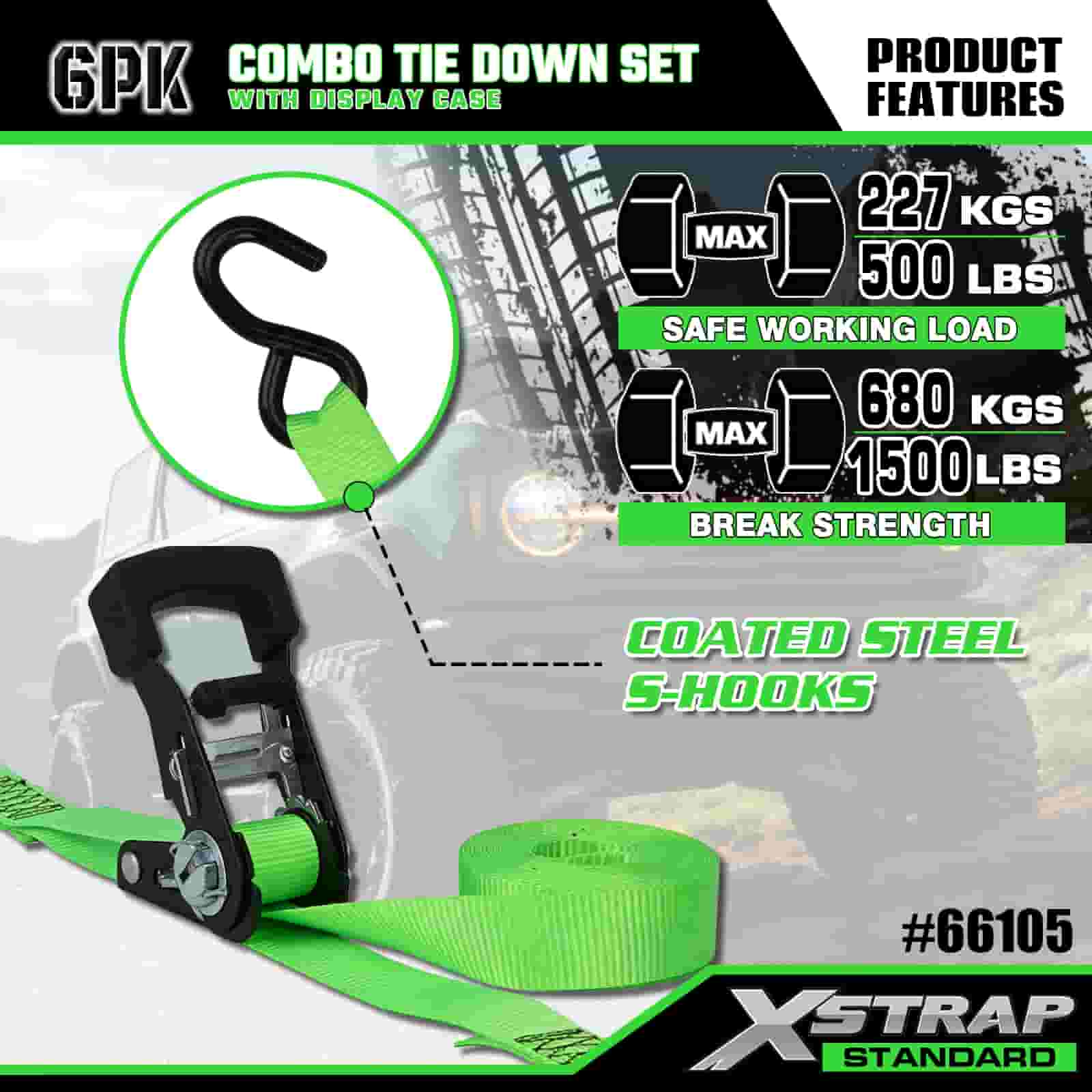 Xstrap 6 Paca Raitín Alúmanam Ceangail Síos, 1" x 14' agus 1" x 10' Poileistir Ceangailte Strap Tarraingt Strap Ratchet, 500 punt agus 1100 lbs Toilleadh Lasta Lashing Straipeanna Daingnithe le S Hooks Rialtáin do Thruicéad S-, Rothar Piocála