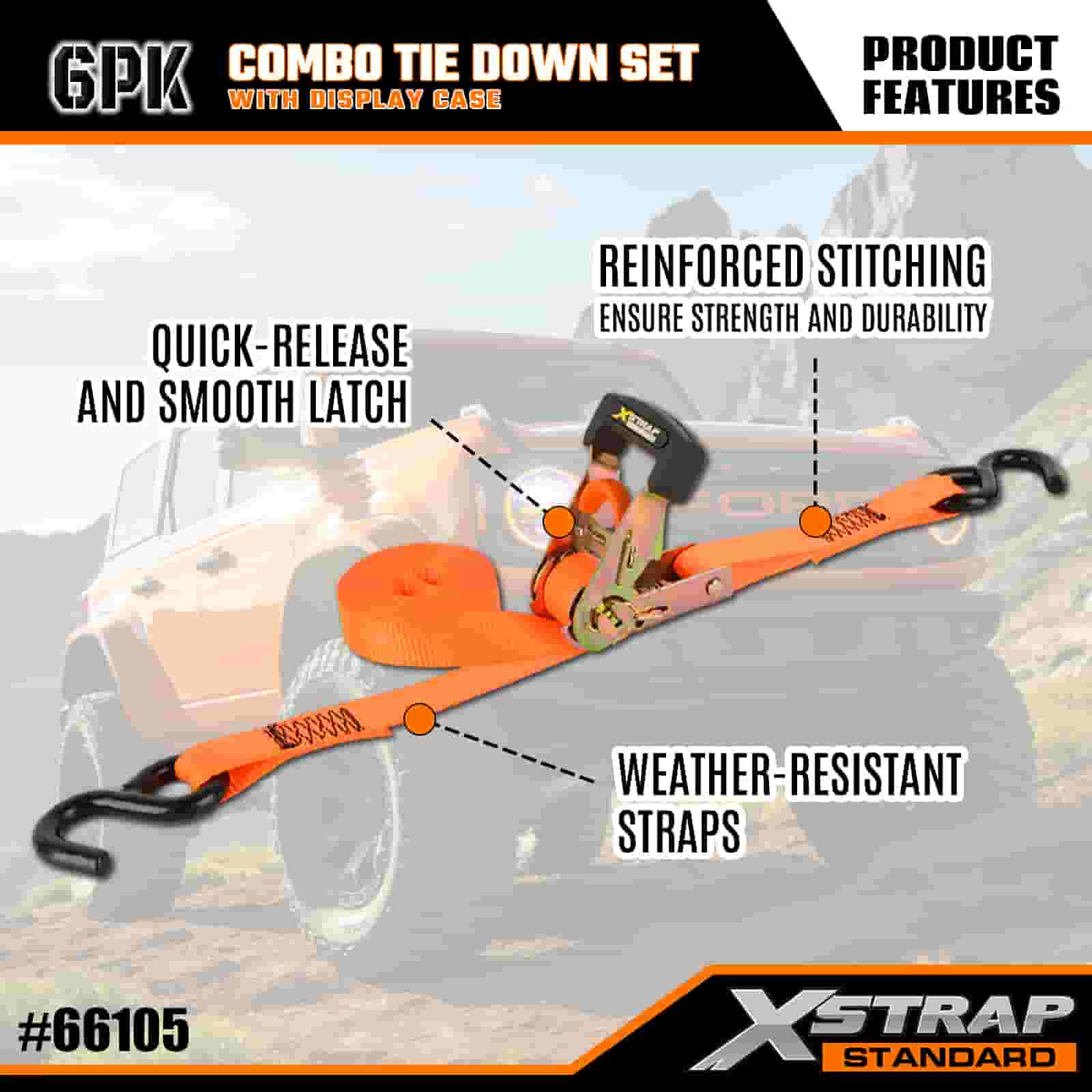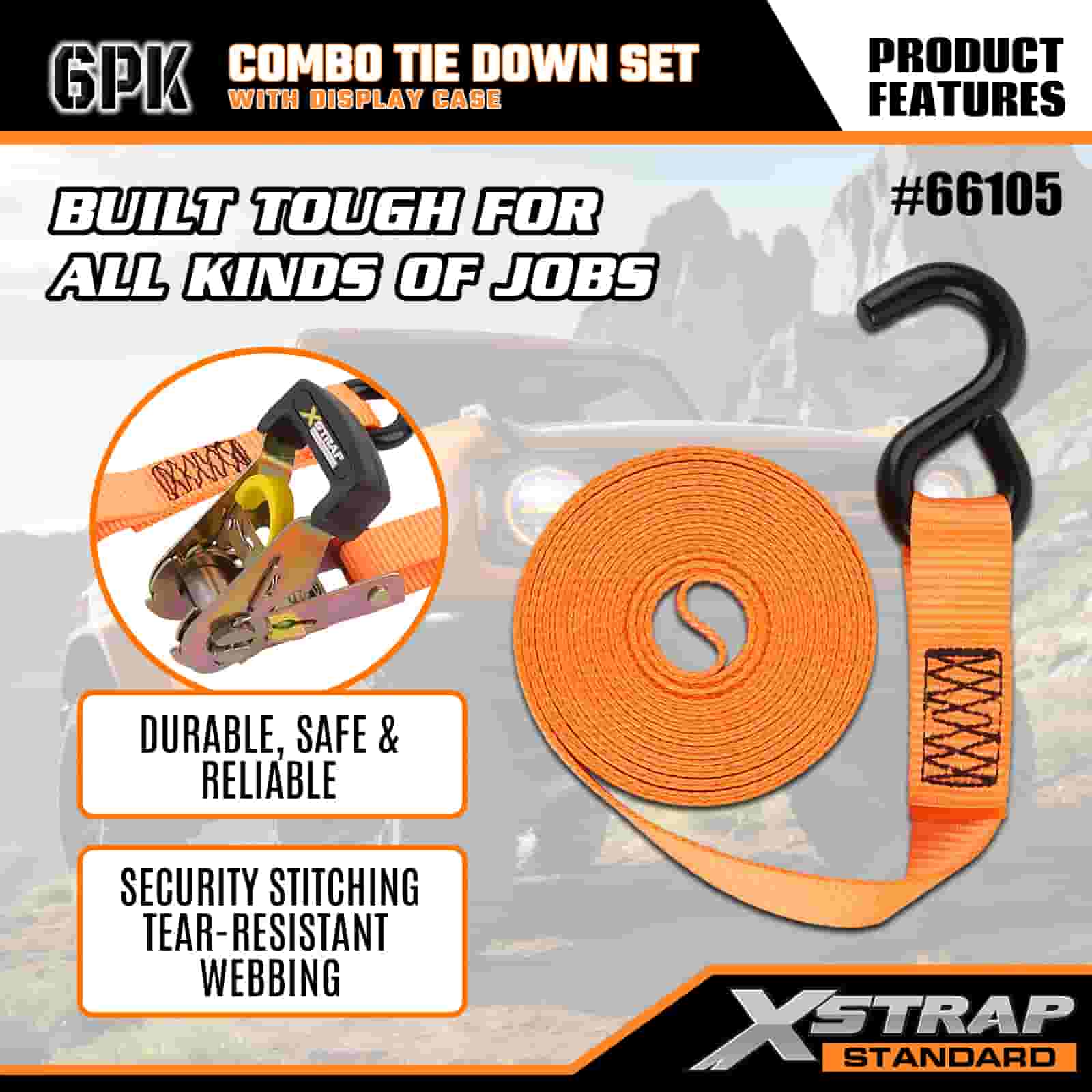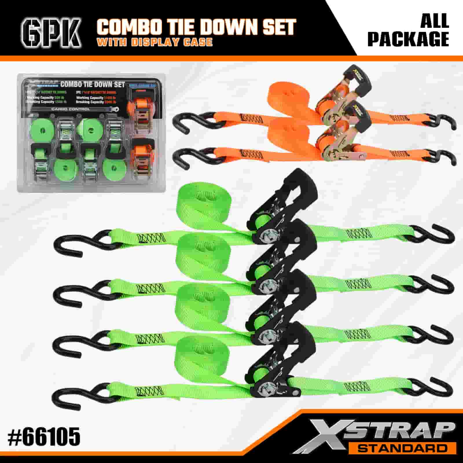 Xstrap 6 Paca Raitín Alúmanam Ceangail Síos, 1" x 14' agus 1" x 10' Poileistir Ceangailte Strap Tarraingt Strap Ratchet, 500 punt agus 1100 lbs Toilleadh Lasta Lashing Straipeanna Daingnithe le S Hooks Rialtáin do Thruicéad S-, Rothar Piocála