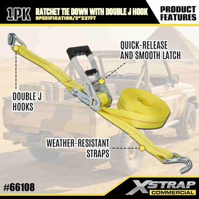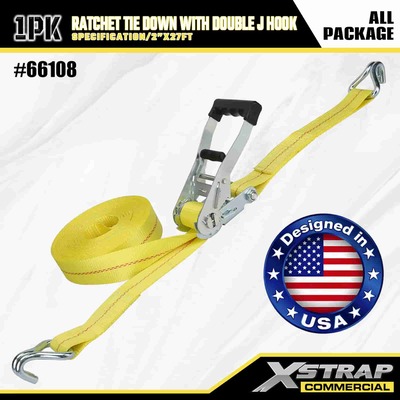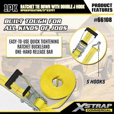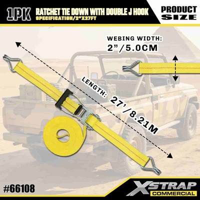Xstrap Ratchet Ceangail Síos le Crúcaí Dúbailte J, 2” x 27’ Poileistir Ceangal Stapa Tarraingt Straip Ratchet, Acmhainn 3333 lbs Straipeanna Daingnithe Lasda le Dubáin Joc Double do Thruck Piocadh rialaithe Lasta, SUV, Cargo Top Racks Gluaisrothar, .