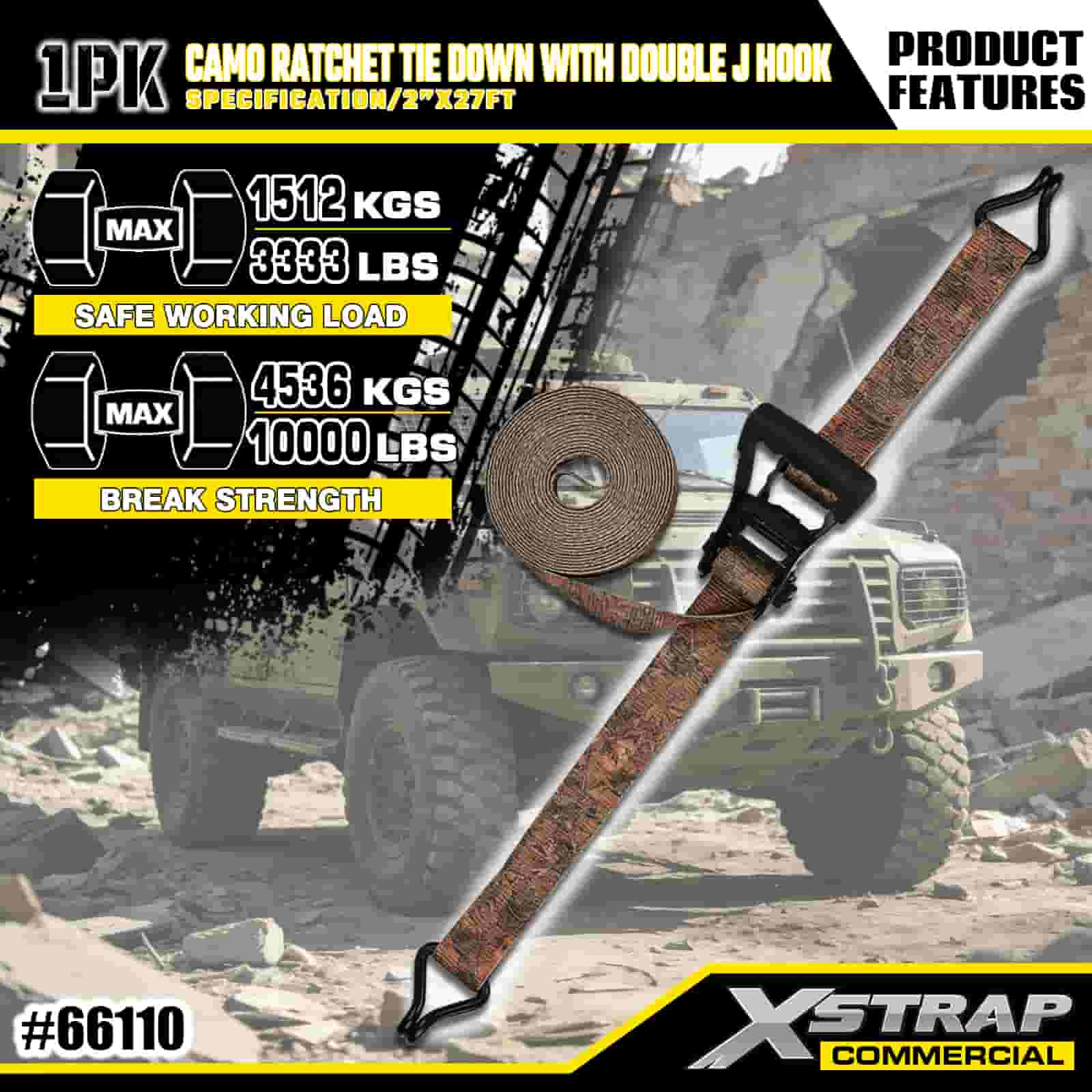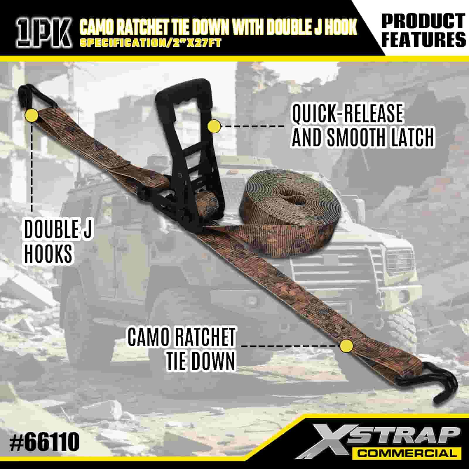 Xstrap CAMO Ratchet Ceangail Síos le Dúbailte J Hooks, 2” x 27’ poileistir Ceangailte Strap Tarraingt Strap Raitse, 3333 lbs Cumas Lasta Lashing Strapaí Daingnithe le Dubáin J Dúbailte do Trucail Pioctha rialaithe lasta, SUV, Gluaisrothar Barra Racaí Carranna,.