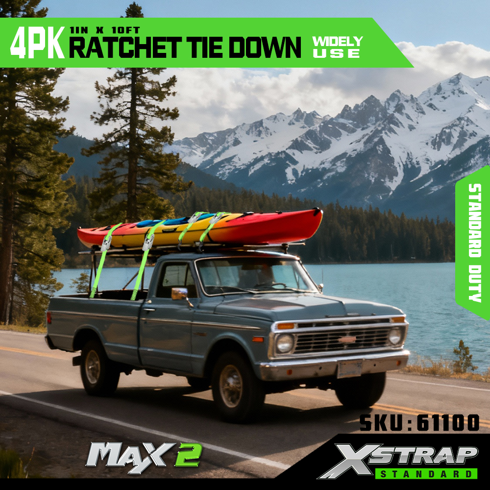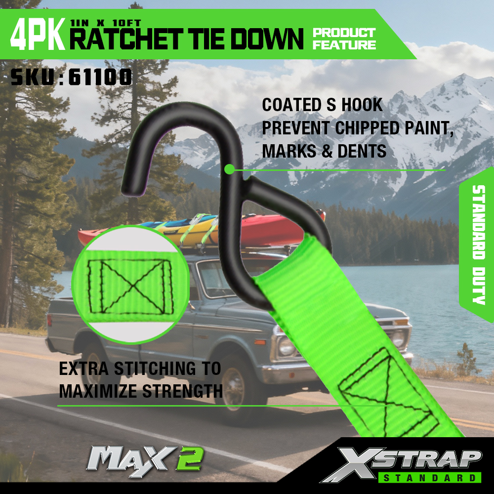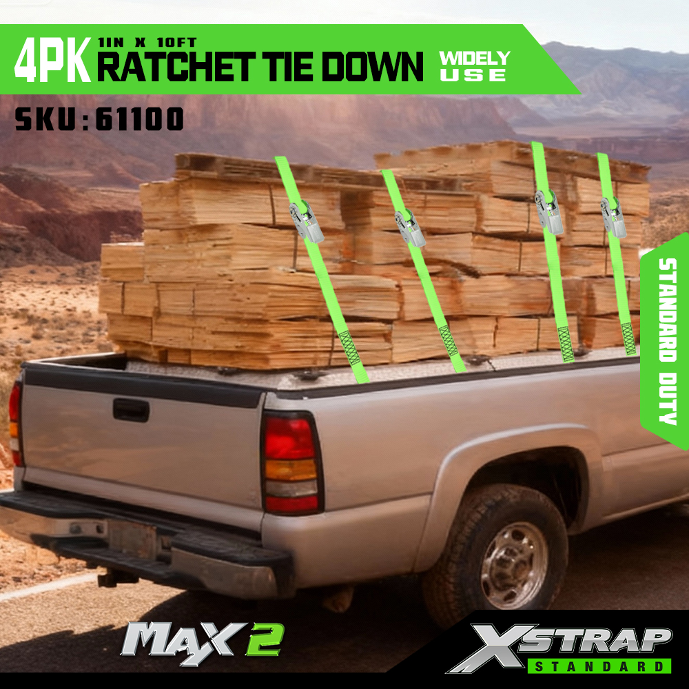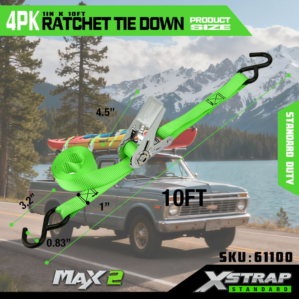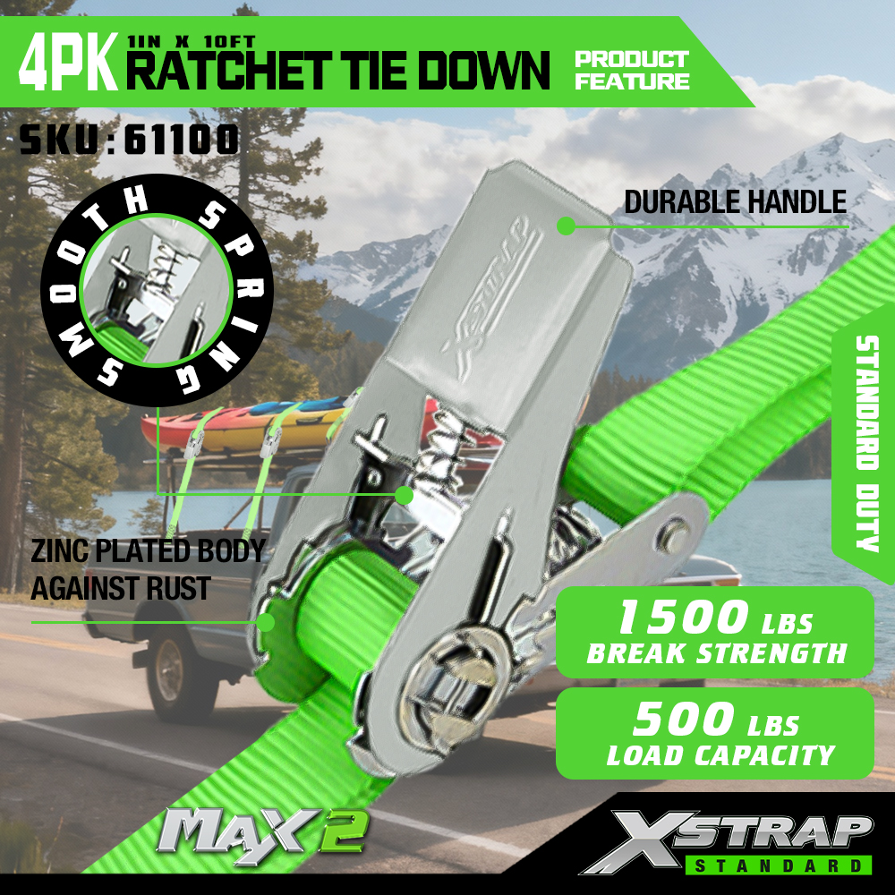 Xstrap 4 Paicéad Ratchet Ceangail Síos, 1” x 15’ poileistir Ceangail Síos Strap Strap Raitse Tarraingt, Toilleadh 500 lbs Lasta Lashing Strapaí Daingnithe le S Hooks do Trucail Pickup, Leantóir Éadroma Gluaisrothar, Bád Iascaireachta Éadrom, Scaird-sciála, Snowmobile.