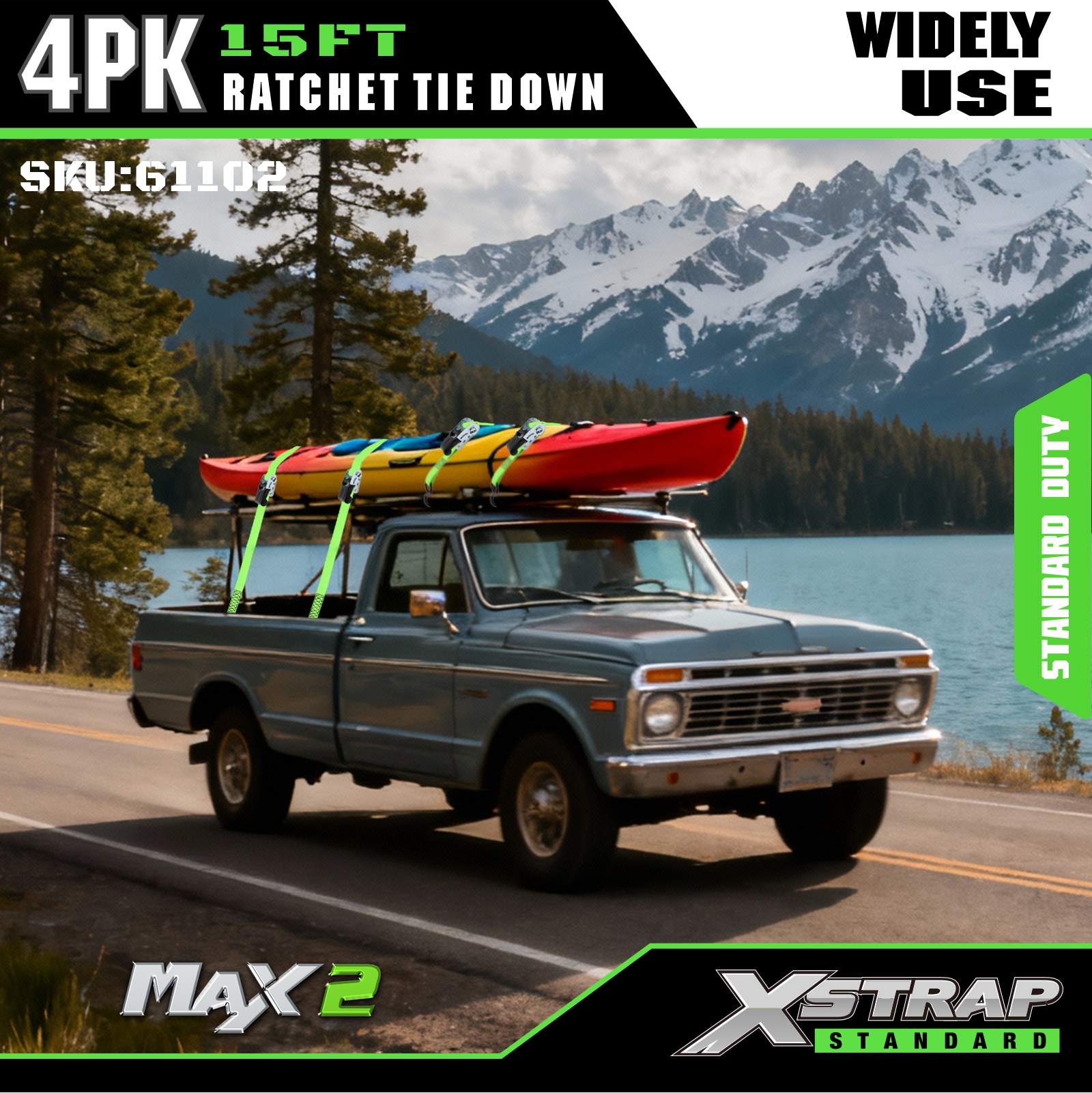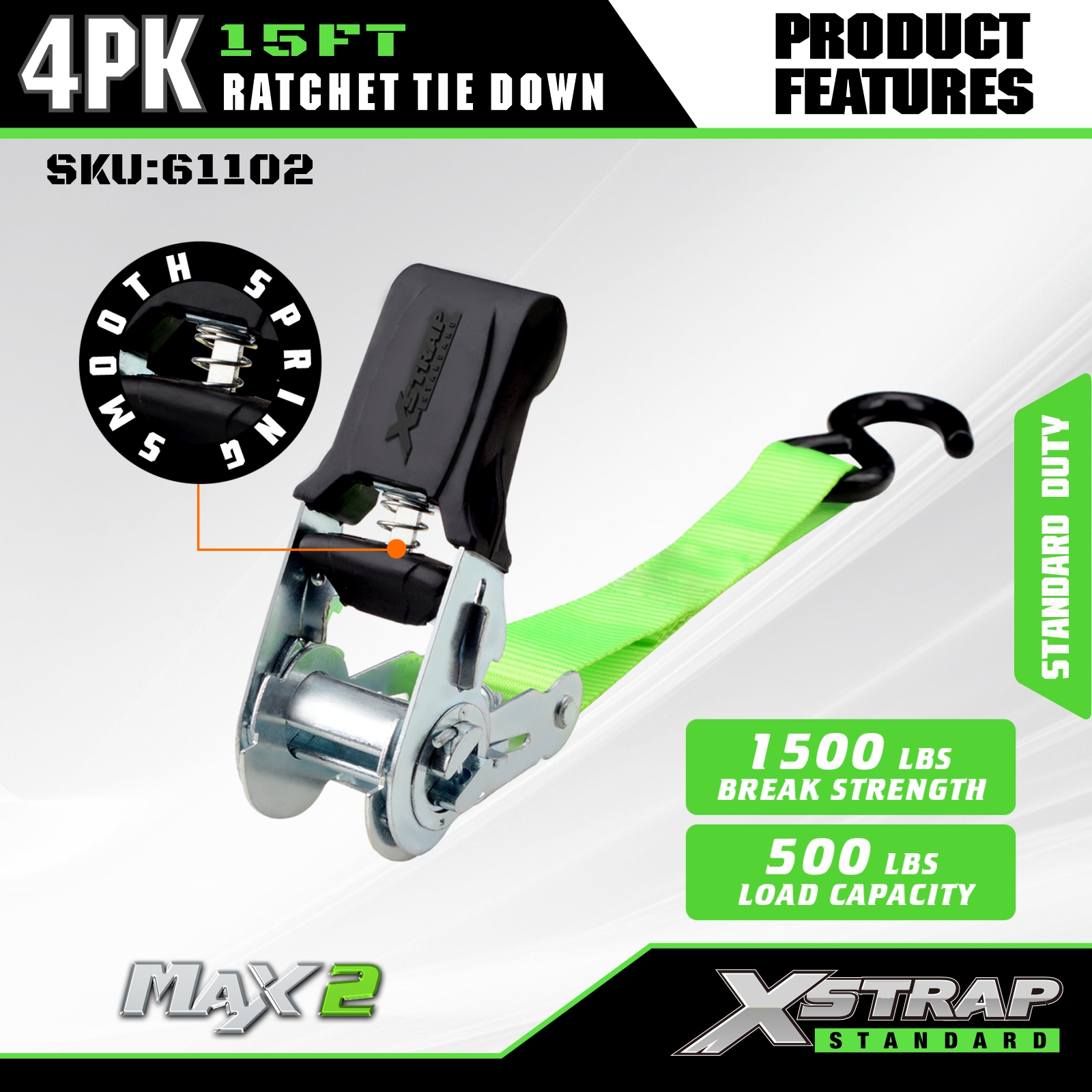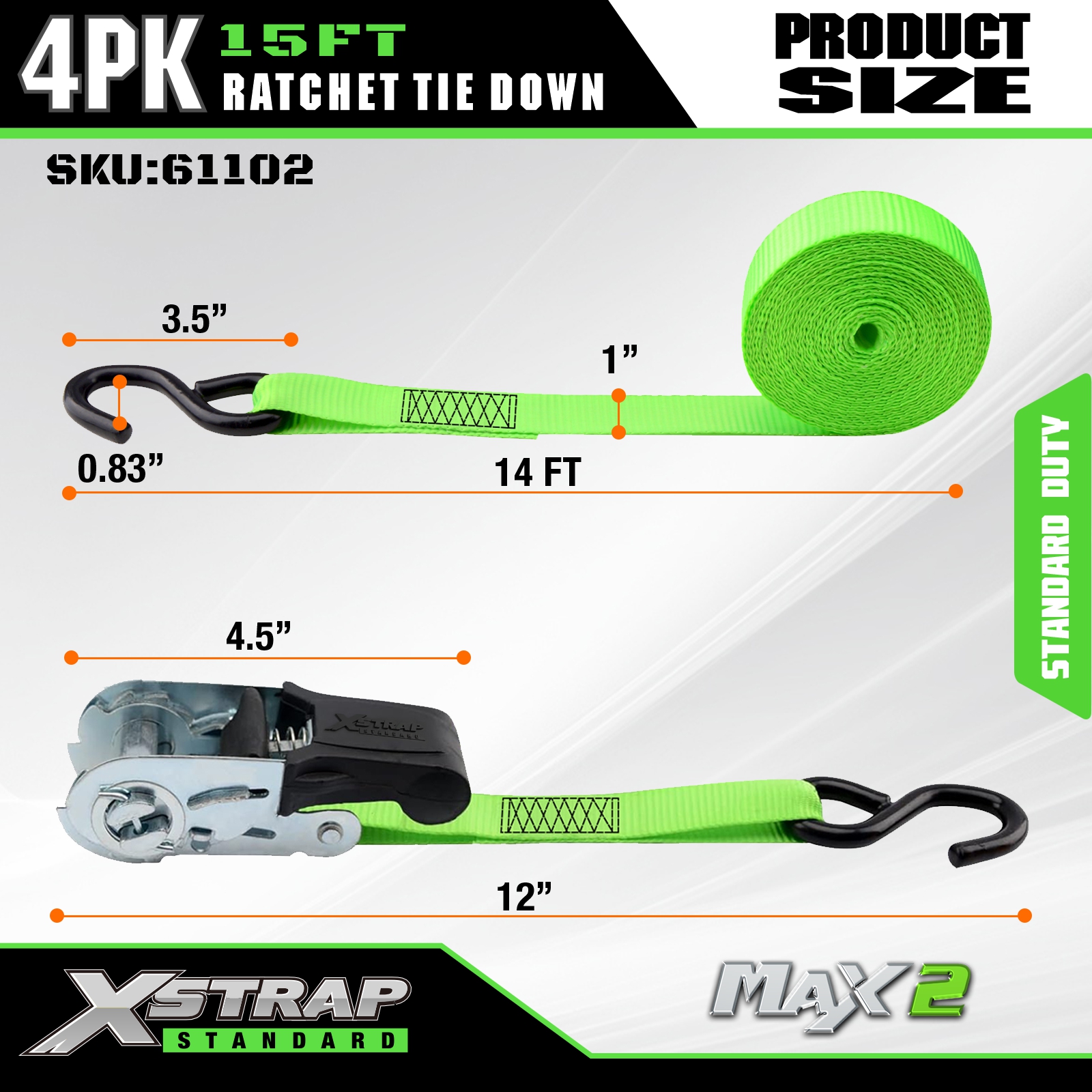 Strapaí Ceangail Dúin Xstrap Ratchet 4 PK 15Ft- 500 Lbs Cumas Luchtaithe 1500 Lbs Neart Briseadh-Strapanna Lasta le haghaidh Fearais Bogtha, Trealamh Lawn, Gluaisrothar.