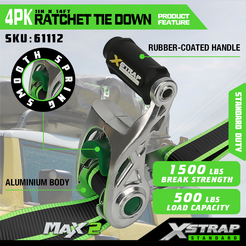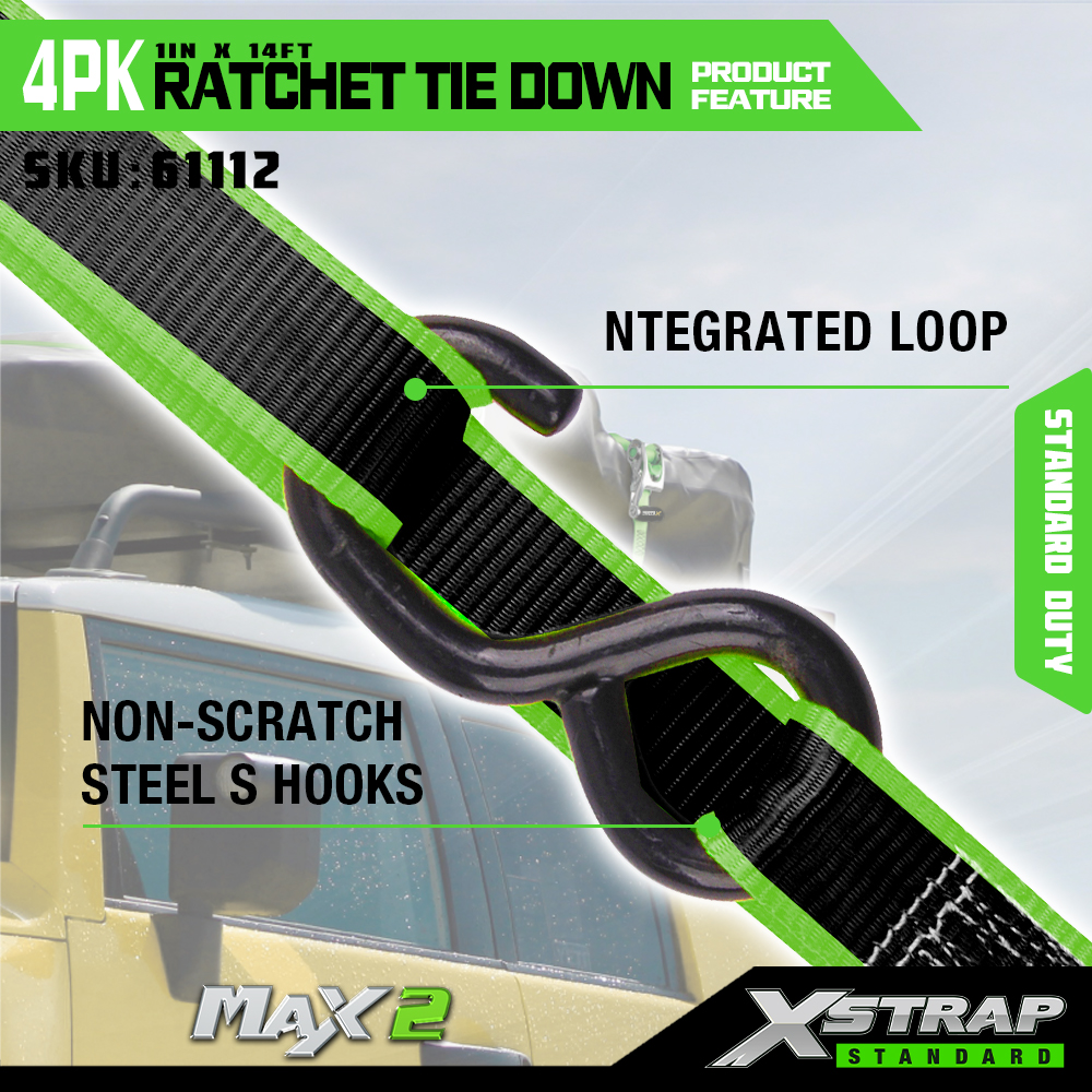 Xstrap 4 Pacáiste Ceangail-Síos Frásaí Raicéid Láimhe Oscailte, 1" x 14' Poileistir Ratchet Ceangail Síos Strap le Lúb Bog, 1500 lb (500lbs) Acmhainn Lastais Lashing Strapaí Daingnithe le Alúmanam raicéid & S Hooks le haghaidh Lasta, ATV, Trucailí